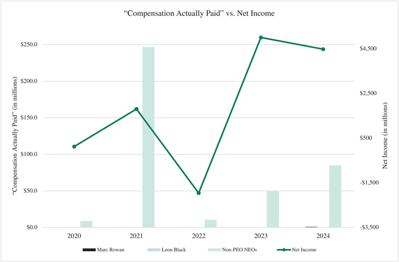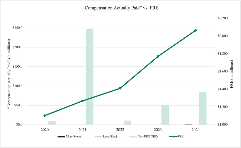 | • | decisions related to expenses, such as determining annual discretionary bonuses and equity-based compensation awards to its employees. With respect to compensation, management seeks to align the interests of certain professionals and selected other individuals with those of the investors in the funds and those of Apollo’s stockholders by providing such individuals a profit sharing interest in the performance fees earned in relation to the funds. To achieve that objective, a certain amount of compensation is based on Apollo’s performance and growth for the year; and |