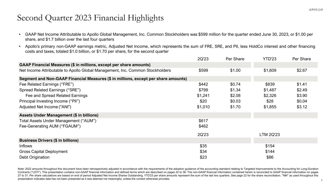 2Q'23 Per Share YTD'23 Per Share GAAP Financial Measures ($ in millions, except per share amounts) Net Income Attributable to Apollo Global Management, Inc. Common Stockholders $599 $1.00 $1,609 $2.67 Segment and Non-GAAP Financial Measures ($ in millions, except per share amounts) Fee Related Earnings (“FRE”) $442 $0.74 $839 $1.41 Spread Related Earnings (“SRE”) $799 $1.34 $1,487 $2.49 Fee and Spread Related Earnings $1,241 $2.08 $2,326 $3.90 Principal Investing Income (“PII”) $20 $0.03 $28 $0.04 Adjusted Net Income ("ANI") $1,010 $1.70 $1,855 $3.12 Assets Under Management ($ in billions) Total Assets Under Management (“AUM”) $617 Fee-Generating AUM (“FGAUM”) $462 2Q'23 LTM 2Q'23 Business Drivers ($ in billions) Inflows $35 $154 Gross Capital Deployment $34 $144 Debt Origination $23 $86 Second Quarter 2023 Financial Highlights • GAAP Net Income Attributable to Apollo Global Management, Inc. Common Stockholders was $599 million for the quarter ended June 30, 2023, or $1.00 per share, and $1.7 billion over the last four quarters • Apollo's primary non-GAAP earnings metric, Adjusted Net Income, which represents the sum of FRE, SRE, and PII, less HoldCo interest and other financing costs and taxes, totaled $1.0 billion, or $1.70 per share, for the second quarter Note: 2022 amounts throughout this document have been retrospectively adjusted in accordance with the requirements of the adoption guidance of the accounting standard relating to Targeted Improvements to the Accounting for Long-Duration Contracts (“LDTI”). This presentation contains non-GAAP financial information and defined terms which are described on pages 32 to 36. The non-GAAP financial information contained herein is reconciled to GAAP financial information on pages 27 to 31. Per share calculations are based on end of period Adjusted Net Income Shares Outstanding. YTD'23 per share amounts represent the sum of the last two quarters. See page 22 for the share reconciliation. “NM” as used throughout this presentation indicates data has not been presented as it was deemed not meaningful, unless the context otherwise provides. 1