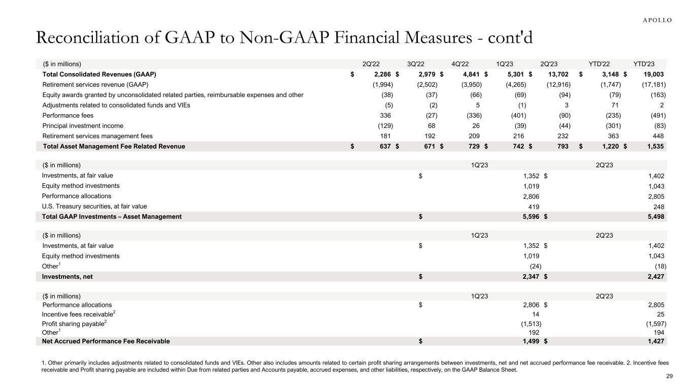 ($ in millions) 2Q'22 3Q'22 4Q'22 1Q'23 2Q'23 YTD'22 YTD'23 GAAP Net income (loss) attributable to Apollo Global Management, Inc. Common Stockholders $(1,637) $(563) $640 $1,010 $599 $(2,038) $1,609 Net income (loss) attributable to non-controlling interests (969) (286) 367 528 151 (1,627) 679 GAAP Net income (loss) $(2,606) $(849) $1,007 $1,538 $750 $(3,665) $2,288 Income tax provision (benefit) (381) (96) 223 253 201 (866) 454 GAAP Income (loss) before Income tax provision (benefit) $(2,987) $(945) $1,230 $1,791 $951 $(4,531) $2,742 Asset Management Adjustments: Equity-based profit sharing expense and other1 67 55 57 67 57 164 124 Equity-based compensation 37 46 46 52 58 93 110 Transaction-related charges2 — (5) (36) (3) (4) (1) (7) Merger-related transaction and integration costs3 18 14 20 7 5 36 12 (Gains) losses from changes in tax receivable agreement liability — — 12 — — 14 — Net (income) loss attributable to non-controlling interests in consolidated entities 960 277 (387) (523) (192) 1,609 (715) Unrealized performance fees 488 66 (111) (239) 86 43 (153) Unrealized profit sharing expense (188) (19) 36 135 1 3 136 HoldCo interest and other financing costs 35 29 19 21 20 74 41 Unrealized principal investment (income) loss (72) 128 38 (10) (29) 10 (39) Unrealized net (gains) losses from investment activities and other (139) 24 (11) 12 8 (157) 20 Retirement Services Adjustments: Investment (gains) losses, net of offsets 2,841 1,853 137 (397) 563 5,477 166 Non-operating change in insurance liabilities and related derivatives (290) (518) 24 135 (304) (939) (169) Integration, restructuring and other non-operating expenses 33 37 29 29 28 67 57 Equity-based compensation expense 13 15 16 16 13 25 29 Segment Income $816 $1,057 $1,119 $1,093 $1,261 $1,987 $2,354 HoldCo interest and other financing costs (35) (29) (19) (21) (20) (74) (41) Taxes and related payables (205) (178) (197) (227) (231) (420) (458) Adjusted Net Income $576 $850 $903 $845 $1,010 $1,493 $1,855 Normalization of alternative investment income to 11% 135 82 14 148 75 (16) 223 Other notable items (16) (42) 35 (25) — — (25) Tax impact of normalization and other notable items (25) (8) (10) (26) (16) 3 (42) Adjusted Net Income - Normalized $670 $882 $942 $942 $1,069 $1,480 $2,011 1. Equity-based profit sharing expense and other includes certain profit sharing arrangements in which a portion of performance fees distributed to the general partner are required to be used by employees of Apollo to purchase restricted shares of common stock or is delivered in the form of RSUs, which are granted under the Equity Plan. Equity-based profit sharing expense and other also includes performance grants which are tied to the Company’s receipt of performance fees, within prescribed periods, sufficient to cover the associated equity-based compensation expense. 2. Transaction-related charges include contingent consideration, equity-based compensation charges and the amortization of intangible assets and certain other charges associated with acquisitions, and restructuring charges. 3. Merger-related transaction and integration costs includes advisory services, technology integration, equity-based compensation charges and other costs associated with the Company’s merger with Athene. Reconciliation of GAAP to Non-GAAP Financial Measures 27