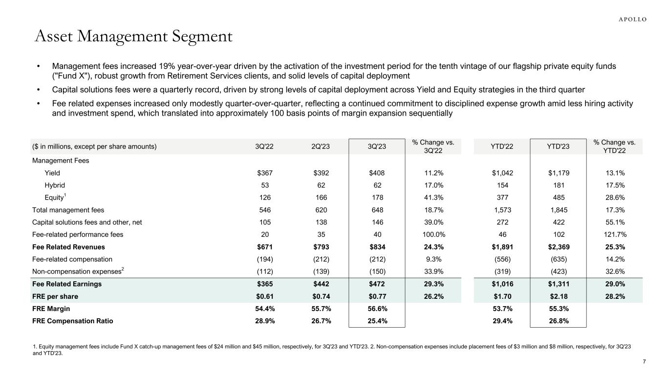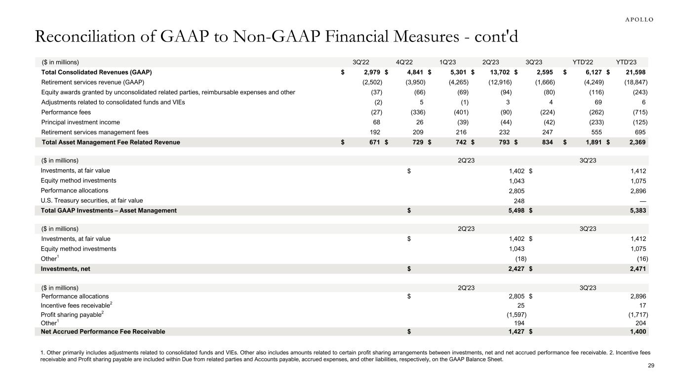 (In millions, except per share amounts) 3Q'22 2Q'23 3Q'23 YTD'22 YTD'23 Revenues Asset Management Management fees $389 $452 $462 $1,100 $1,328 Advisory and transaction fees, net 110 170 157 286 482 Investment income (loss) (31) 138 292 475 882 Incentive fees 9 26 18 17 59 Retirement Services Premiums 3,045 9,041 26 10,769 9,163 Product charges 184 207 217 525 622 Net investment income 2,033 2,948 3,166 5,667 8,726 Investment related gains (losses) (2,847) 366 (2,624) (12,822) (1,193) Revenues of consolidated variable interest entities 114 347 318 148 946 Other revenues (27) 7 563 (38) 583 Total Revenues 2,979 13,702 2,595 6,127 21,598 Expenses Asset Management Compensation and benefits (386) (516) (557) (1,429) (1,743) Interest expense (31) (31) (36) (94) (98) General, administrative and other (167) (226) (220) (472) (643) Retirement Services Interest sensitive contract benefits (171) (2,012) (333) 581 (3,634) Future policy and other policy benefits (3,270) (9,512) (368) (11,230) (10,346) Market risk benefits remeasurement gains (losses) 458 71 441 1,689 166 Amortization of deferred acquisition costs, deferred sales inducements and value of business acquired (112) (153) (211) (318) (502) Policy and other operating expenses (342) (452) (467) (985) (1,356) Total Expenses (4,021) (12,831) (1,751) (12,258) (18,156) Other Income (Loss) – Asset Management Net gains (losses) from investment activities (16) 20 (32) 164 (14) Net gains (losses) from investment activities of consolidated variable interest entities 85 12 49 465 95 Other income (loss), net 28 48 22 26 102 Total Other Income (Loss) 97 80 39 655 183 Income (loss) before income tax (provision) benefit (945) 951 883 (5,476) 3,625 Income tax (provision) benefit 96 (201) (243) 962 (697) Net income (loss) (849) 750 640 (4,514) 2,928 Net (income) loss attributable to non-controlling interests 286 (151) 42 1,913 (637) Net income (loss) attributable to Apollo Global Management, Inc. (563) 599 682 (2,601) 2,291 Preferred stock dividends — — (22) — (22) Net income (loss) attributable to Apollo Global Management, Inc. Common Stockholders $(563) $599 $660 $(2,601) $2,269 Earnings (Loss) per share Net income (loss) attributable to Common Stockholders - Basic $(0.98) $1.00 $1.10 $(4.51) $3.77 Net income (loss) attributable to Common Stockholders - Diluted $(0.98) $1.00 $1.10 $(4.51) $3.75 Weighted average shares outstanding – Basic 584 579 579 585 581 Weighted average shares outstanding – Diluted 584 579 579 585 582 GAAP Income Statement (Unaudited) 2