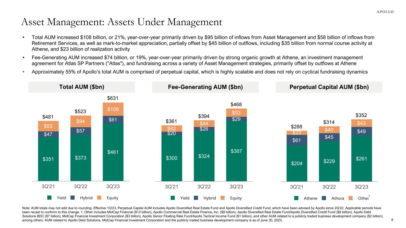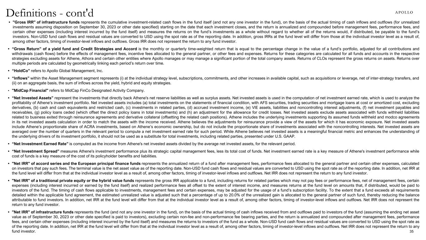 • "Gross IRR" of infrastructure funds represents the cumulative investment-related cash flows in the fund itself (and not any one investor in the fund), on the basis of the actual timing of cash inflows and outflows (for unrealized investments assuming disposition on September 30, 2023 or other date specified) starting on the date that each investment closes, and the return is annualized and compounded before management fees, performance fees, and certain other expenses (including interest incurred by the fund itself) and measures the returns on the fund’s investments as a whole without regard to whether all of the returns would, if distributed, be payable to the fund’s investors. Non-USD fund cash flows and residual values are converted to USD using the spot rate as of the reporting date. In addition, gross IRRs at the fund level will differ from those at the individual investor level as a result of, among other factors, timing of investor-level inflows and outflows. Gross IRR does not represent the return to any fund investor. • “Gross Return” of a yield fund and Credit Strategies and Accord is the monthly or quarterly time-weighted return that is equal to the percentage change in the value of a fund’s portfolio, adjusted for all contributions and withdrawals (cash flows) before the effects of management fees, incentive fees allocated to the general partner, or other fees and expenses. Returns for these categories are calculated for all funds and accounts in the respective strategies excluding assets for Athene, Athora and certain other entities where Apollo manages or may manage a significant portion of the total company assets. Returns of CLOs represent the gross returns on assets. Returns over multiple periods are calculated by geometrically linking each period’s return over time. • “HoldCo” refers to Apollo Global Management, Inc. • “Inflows” within the Asset Management segment represents (i) at the individual strategy level, subscriptions, commitments, and other increases in available capital, such as acquisitions or leverage, net of inter-strategy transfers, and (ii) on an aggregate basis, the sum of inflows across the yield, hybrid and equity strategies. • "MidCap Financial" refers to MidCap FinCo Designated Activity Company. • “Net Invested Assets” represent the investments that directly back Athene's net reserve liabilities as well as surplus assets. Net invested assets is used in the computation of net investment earned rate, which is used to analyze the profitability of Athene’s investment portfolio. Net invested assets includes (a) total investments on the statements of financial condition, with AFS securities, trading securities and mortgage loans at cost or amortized cost, excluding derivatives, (b) cash and cash equivalents and restricted cash, (c) investments in related parties, (d) accrued investment income, (e) VIE assets, liabilities and noncontrolling interest adjustments, (f) net investment payables and receivables, (g) policy loans ceded (which offset the direct policy loans in total investments) and (h) an adjustment for the allowance for credit losses. Net invested assets exclude assets associated with funds withheld liabilities related to business exited through reinsurance agreements and derivative collateral (offsetting the related cash positions). Athene includes the underlying investments supporting its assumed funds withheld and modco agreements in its net invested assets calculation in order to match the assets with the income received. Athene believes the adjustments for reinsurance provide a view of the assets for which it has economic exposure. Net invested assets include Athene’s proportionate share of ACRA investments, based on Athene’s economic ownership, but do not include the proportionate share of investments associated with the noncontrolling interests. Net invested assets are averaged over the number of quarters in the relevant period to compute a net investment earned rate for such period. While Athene believes net invested assets is a meaningful financial metric and enhances the understanding of the underlying drivers of its investment portfolio, it should not be used as a substitute for total investments, including related parties, presented under U.S. GAAP. • “Net Investment Earned Rate” is computed as the income from Athene's net invested assets divided by the average net invested assets, for the relevant period. • “Net Investment Spread” measures Athene's investment performance plus its strategic capital management fees, less its total cost of funds. Net investment earned rate is a key measure of Athene's investment performance while cost of funds is a key measure of the cost of its policyholder benefits and liabilities. • "Net IRR" of accord series and the European principal finance funds represents the annualized return of a fund after management fees, performance fees allocated to the general partner and certain other expenses, calculated on investors that pay such fees. The terminal value is the net asset value as of the reporting date. Non-USD fund cash flows and residual values are converted to USD using the spot rate as of the reporting date. In addition, net IRR at the fund level will differ from that at the individual investor level as a result of, among other factors, timing of investor-level inflows and outflows. Net IRR does not represent the return to any fund investor. • "Net IRR" of a traditional private equity or the hybrid value funds represents the gross IRR applicable to a fund, including returns for related parties which may not pay fees or performance fees, net of management fees, certain expenses (including interest incurred or earned by the fund itself) and realized performance fees all offset to the extent of interest income, and measures returns at the fund level on amounts that, if distributed, would be paid to investors of the fund. The timing of cash flo