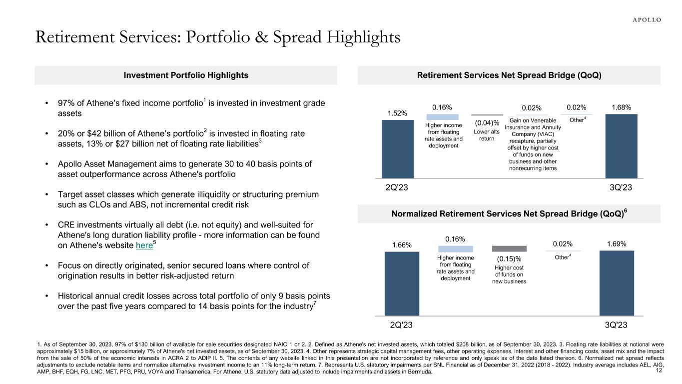 1.66% 0.16% (0.15)% 0.02% 1.69% 2Q'23 3Q'23 1.52% 0.16% (0.04)% 0.02% 0.02% 1.68% 2Q'23 3Q'23 Investment Portfolio Highlights Retirement Services Net Spread Bridge (QoQ) Normalized Retirement Services Net Spread Bridge (QoQ)6 • 97% of Athene’s fixed income portfolio1 is invested in investment grade assets • 20% or $42 billion of Athene’s portfolio2 is invested in floating rate assets, 13% or $27 billion net of floating rate liabilities3 • Apollo Asset Management aims to generate 30 to 40 basis points of asset outperformance across Athene's portfolio • Target asset classes which generate illiquidity or structuring premium such as CLOs and ABS, not incremental credit risk • CRE investments virtually all debt (i.e. not equity) and well-suited for Athene's long duration liability profile - more information can be found on Athene's website here5 • Focus on directly originated, senior secured loans where control of origination results in better risk-adjusted return • Historical annual credit losses across total portfolio of only 9 basis points over the past five years compared to 14 basis points for the industry7 Gain on Venerable Insurance and Annuity Company (VIAC) recapture, partially offset by higher cost of funds on new business and other nonrecurring items Higher cost of funds on new business Retirement Services: Portfolio & Spread Highlights 1. As of September 30, 2023, 97% of $130 billion of available for sale securities designated NAIC 1 or 2. 2. Defined as Athene's net invested assets, which totaled $208 billion, as of September 30, 2023. 3. Floating rate liabilities at notional were approximately $15 billion, or approximately 7% of Athene's net invested assets, as of September 30, 2023. 4. Other represents strategic capital management fees, other operating expenses, interest and other financing costs, asset mix and the impact from the sale of 50% of the economic interests in ACRA 2 to ADIP II. 5. The contents of any website linked in this presentation are not incorporated by reference and only speak as of the date listed thereon. 6. Normalized net spread reflects adjustments to exclude notable items and normalize alternative investment income to an 11% long-term return. 7. Represents U.S. statutory impairments per SNL Financial as of December 31, 2022 (2018 - 2022). Industry average includes AEL, AIG, AMP, BHF, EQH, FG, LNC, MET, PFG, PRU, VOYA and Transamerica. For Athene, U.S. statutory data adjusted to include impairments and assets in Bermuda. 12 Other4 Lower alts return Other4 Higher income from floating rate assets and deployment Higher income from floating rate assets and deployment