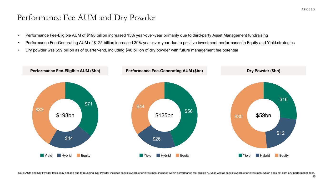 • “Assets Under Management”, or “AUM”, refers to the assets of the funds, partnerships and accounts to which Apollo provides investment management, advisory, or certain other investment-related services, including, without limitation, capital that such funds, partnerships and accounts have the right to call from investors pursuant to capital commitments. AUM equals the sum of: 1. the net asset value (“NAV”), plus used or available leverage and/or capital commitments, or gross assets plus capital commitments, of the yield and certain hybrid funds, partnerships and accounts for which we provide investment management or advisory services, other than certain collateralized loan obligations (“CLOs”), collateralized debt obligations (“CDOs”), and certain perpetual capital vehicles, which have a fee-generating basis other than the mark-to-market value of the underlying assets; for certain perpetual capital vehicles in yield, gross asset value plus available financing capacity; 2. the fair value of the investments of equity and certain hybrid funds, partnerships and accounts Apollo manages or advises, plus the capital that such funds, partnerships and accounts are entitled to call from investors pursuant to capital commitments, plus portfolio level financings; 3. the gross asset value associated with the reinsurance investments of the portfolio company assets Apollo manages or advises; and 4. the fair value of any other assets that Apollo manages or advises for the funds, partnerships and accounts to which Apollo provides investment management, advisory, or certain other investment-related services, plus unused credit facilities, including capital commitments to such funds, partnerships and accounts for investments that may require pre-qualification or other conditions before investment plus any other capital commitments to such funds, partnerships and accounts available for investment that are not otherwise included in the clauses above. Apollo’s AUM measure includes Assets Under Management for which Apollo charges either nominal or zero fees. Apollo’s AUM measure also includes assets for which Apollo does not have investment discretion, including certain assets for which Apollo earns only investment-related service fees, rather than management or advisory fees. Apollo’s definition of AUM is not based on any definition of Assets Under Management contained in its governing documents or in any Apollo Fund management agreements. Apollo considers multiple factors for determining what should be included in its definition of AUM. Such factors include but are not limited to (1) Apollo’s ability to influence the investment decisions for existing and available assets; (2) Apollo’s ability to generate income from the underlying assets in its funds; and (3) the AUM measures that Apollo uses internally or believes are used by other investment managers. Given the differences in the investment strategies and structures among other alternative investment managers, Apollo’s calculation of AUM may differ from the calculations employed by other investment managers and, as a result, this measure may not be directly comparable to similar measures presented by other investment managers. Apollo’s calculation also differs from the manner in which its affiliates registered with the SEC report “Regulatory Assets Under Management” on Form ADV and Form PF in various ways. Apollo uses AUM, Gross capital deployed and Dry powder as performance measurements of its investment activities, as well as to monitor fund size in relation to professional resource and infrastructure needs. • “Fee-Generating AUM” or “FGAUM” consists of assets of the funds, partnerships and accounts to which we provide investment management, advisory, or certain other investment-related services and on which we earn management fees, monitoring fees or other investment-related fees pursuant to management or other fee agreements on a basis that varies among the Apollo funds, partnerships and accounts. Management fees are normally based on “net asset value,” “gross assets,” “adjusted par asset value,” “adjusted cost of all unrealized portfolio investments,” “capital commitments,” “adjusted assets,” “stockholders’ equity,” “invested capital” or “capital contributions,” each as defined in the applicable management agreement. Monitoring fees, also referred to as advisory fees, with respect to the structured portfolio company investments of the funds, partnerships and accounts we manage or advise, are generally based on the total value of such structured portfolio company investments, which normally includes leverage, less any portion of such total value that is already considered in Fee-Generating AUM. • “Performance Fee-Eligible AUM” or “PFEAUM” refers to the AUM that may eventually produce performance fees. All funds for which we are entitled to receive a performance fee allocation or incentive fee are included in Performance Fee-Eligible AUM, which consists of the following: • “Performance Fee-Generating AUM”, which refers to invested capital of the funds, partnerships and accounts we manage, advise, or to which we provide certain other investment-related services, that is currently above its hurdle rate or preferred return, and profit of such funds, partnerships and accounts is being allocated to, or earned by, the general partner in accordance with the applicable limited partnership agreements or other governing agreements; • “AUM Not Currently Generating Performance Fees”, which refers to invested capital of the funds, partnerships and accounts we manage, advise, or to which we provide certain other investment-related services that is currently below its hurdle rate or preferred return; and • “Uninvested Performance Fee-Eligible AUM”, which refers to capital of the funds, partnerships and accounts we manage, advise, or to which we provide 