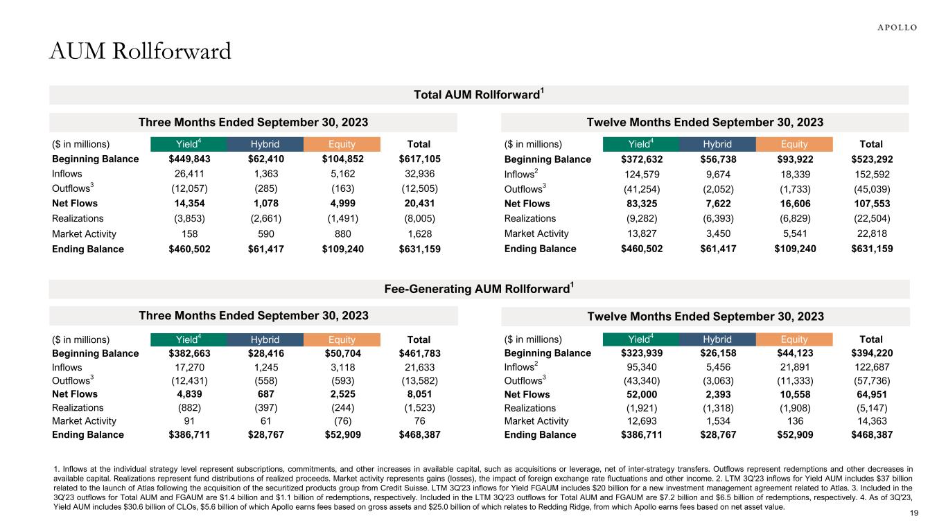 ($ in millions) Yield4 Hybrid Equity Total Beginning Balance $449,843 $62,410 $104,852 $617,105 Inflows 26,411 1,363 5,162 32,936 Outflows3 (12,057) (285) (163) (12,505) Net Flows 14,354 1,078 4,999 20,431 Realizations (3,853) (2,661) (1,491) (8,005) Market Activity 158 590 880 1,628 Ending Balance $460,502 $61,417 $109,240 $631,159 Three Months Ended September 30, 2023 ($ in millions) Yield4 Hybrid Equity Total Beginning Balance $372,632 $56,738 $93,922 $523,292 Inflows2 124,579 9,674 18,339 152,592 Outflows3 (41,254) (2,052) (1,733) (45,039) Net Flows 83,325 7,622 16,606 107,553 Realizations (9,282) (6,393) (6,829) (22,504) Market Activity 13,827 3,450 5,541 22,818 Ending Balance $460,502 $61,417 $109,240 $631,159 Twelve Months Ended September 30, 2023 ($ in millions) Yield4 Hybrid Equity Total Beginning Balance $382,663 $28,416 $50,704 $461,783 Inflows 17,270 1,245 3,118 21,633 Outflows3 (12,431) (558) (593) (13,582) Net Flows 4,839 687 2,525 8,051 Realizations (882) (397) (244) (1,523) Market Activity 91 61 (76) 76 Ending Balance $386,711 $28,767 $52,909 $468,387 Three Months Ended September 30, 2023 ($ in millions) Yield4 Hybrid Equity Total Beginning Balance $323,939 $26,158 $44,123 $394,220 Inflows2 95,340 5,456 21,891 122,687 Outflows3 (43,340) (3,063) (11,333) (57,736) Net Flows 52,000 2,393 10,558 64,951 Realizations (1,921) (1,318) (1,908) (5,147) Market Activity 12,693 1,534 136 14,363 Ending Balance $386,711 $28,767 $52,909 $468,387 Twelve Months Ended September 30, 2023 Fee-Generating AUM Rollforward1 Total AUM Rollforward1 1. Inflows at the individual strategy level represent subscriptions, commitments, and other increases in available capital, such as acquisitions or leverage, net of inter-strategy transfers. Outflows represent redemptions and other decreases in available capital. Realizations represent fund distributions of realized proceeds. Market activity represents gains (losses), the impact of foreign exchange rate fluctuations and other income. 2. LTM 3Q'23 inflows for Yield AUM includes $37 billion related to the launch of Atlas following the acquisition of the securitized products group from Credit Suisse. LTM 3Q'23 inflows for Yield FGAUM includes $20 billion for a new investment management agreement related to Atlas. 3. Included in the 3Q'23 outflows for Total AUM and FGAUM are $1.4 billion and $1.1 billion of redemptions, respectively. Included in the LTM 3Q'23 outflows for Total AUM and FGAUM are $7.2 billion and $6.5 billion of redemptions, respectively. 4. As of 3Q'23, Yield AUM includes $30.6 billion of CLOs, $5.6 billion of which Apollo earns fees based on gross assets and $25.0 billion of which relates to Redding Ridge, from which Apollo earns fees based on net asset value. AUM Rollforward 19