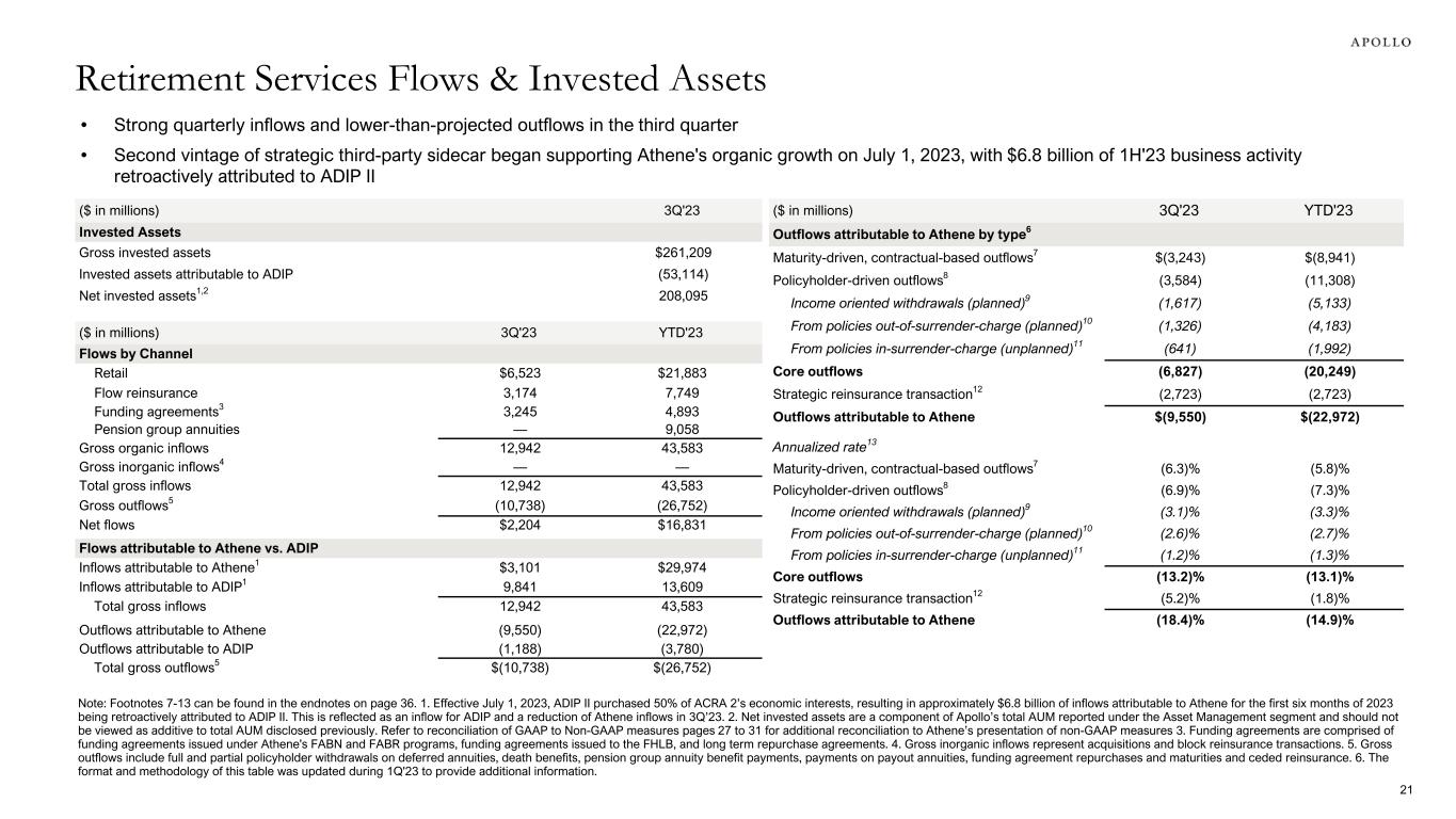 ($ in millions) 3Q'23 YTD'23 Flows by Channel Retail $6,523 $21,883 Flow reinsurance 3,174 7,749 Funding agreements3 3,245 4,893 Pension group annuities — 9,058 Gross organic inflows 12,942 43,583 Gross inorganic inflows4 — — Total gross inflows 12,942 43,583 Gross outflows5 (10,738) (26,752) Net flows $2,204 $16,831 Flows attributable to Athene vs. ADIP Inflows attributable to Athene1 $3,101 $29,974 Inflows attributable to ADIP1 9,841 13,609 Total gross inflows 12,942 43,583 Outflows attributable to Athene (9,550) (22,972) Outflows attributable to ADIP (1,188) (3,780) Total gross outflows5 $(10,738) $(26,752) ($ in millions) 3Q'23 Invested Assets Gross invested assets $261,209 Invested assets attributable to ADIP (53,114) Net invested assets1,2 208,095 21 Note: Footnotes 7-13 can be found in the endnotes on page 36. 1. Effective July 1, 2023, ADIP II purchased 50% of ACRA 2’s economic interests, resulting in approximately $6.8 billion of inflows attributable to Athene for the first six months of 2023 being retroactively attributed to ADIP II. This is reflected as an inflow for ADIP and a reduction of Athene inflows in 3Q’23. 2. Net invested assets are a component of Apollo’s total AUM reported under the Asset Management segment and should not be viewed as additive to total AUM disclosed previously. Refer to reconciliation of GAAP to Non-GAAP measures pages 27 to 31 for additional reconciliation to Athene’s presentation of non-GAAP measures 3. Funding agreements are comprised of funding agreements issued under Athene's FABN and FABR programs, funding agreements issued to the FHLB, and long term repurchase agreements. 4. Gross inorganic inflows represent acquisitions and block reinsurance transactions. 5. Gross outflows include full and partial policyholder withdrawals on deferred annuities, death benefits, pension group annuity benefit payments, payments on payout annuities, funding agreement repurchases and maturities and ceded reinsurance. 6. The format and methodology of this table was updated during 1Q'23 to provide additional information. ($ in millions) 3Q'23 YTD'23 Outflows attributable to Athene by type6 Maturity-driven, contractual-based outflows7 $(3,243) $(8,941) Policyholder-driven outflows8 (3,584) (11,308) Income oriented withdrawals (planned)9 (1,617) (5,133) From policies out-of-surrender-charge (planned)10 (1,326) (4,183) From policies in-surrender-charge (unplanned)11 (641) (1,992) Core outflows (6,827) (20,249) Strategic reinsurance transaction12 (2,723) (2,723) Outflows attributable to Athene $(9,550) $(22,972) Annualized rate13 Maturity-driven, contractual-based outflows7 (6.3)% (5.8)% Policyholder-driven outflows8 (6.9)% (7.3)% Income oriented withdrawals (planned)9 (3.1)% (3.3)% From policies out-of-surrender-charge (planned)10 (2.6)% (2.7)% From policies in-surrender-charge (unplanned)11 (1.2)% (1.3)% Core outflows (13.2)% (13.1)% Strategic reinsurance transaction12 (5.2)% (1.8)% Outflows attributable to Athene (18.4)% (14.9)% Retirement Services Flows & Invested Assets • Strong quarterly inflows and lower-than-projected outflows in the third quarter • Second vintage of strategic third-party sidecar began supporting Athene's organic growth on July 1, 2023, with $6.8 billion of 1H'23 business activity retroactively attributed to ADIP II