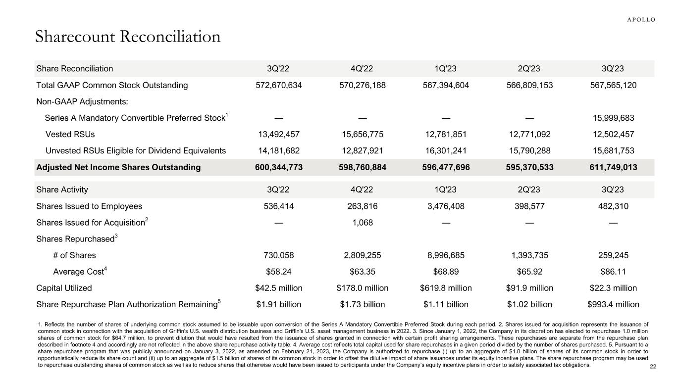 Share Reconciliation 3Q'22 4Q'22 1Q'23 2Q'23 3Q'23 Total GAAP Common Stock Outstanding 572,670,634 570,276,188 567,394,604 566,809,153 567,565,120 Non-GAAP Adjustments: Series A Mandatory Convertible Preferred Stock1 — — — — 15,999,683 Vested RSUs 13,492,457 15,656,775 12,781,851 12,771,092 12,502,457 Unvested RSUs Eligible for Dividend Equivalents 14,181,682 12,827,921 16,301,241 15,790,288 15,681,753 Adjusted Net Income Shares Outstanding 600,344,773 598,760,884 596,477,696 595,370,533 611,749,013 1. Reflects the number of shares of underlying common stock assumed to be issuable upon conversion of the Series A Mandatory Convertible Preferred Stock during each period. 2. Shares issued for acquisition represents the issuance of common stock in connection with the acquisition of Griffin's U.S. wealth distribution business and Griffin's U.S. asset management business in 2022. 3. Since January 1, 2022, the Company in its discretion has elected to repurchase 1.0 million shares of common stock for $64.7 million, to prevent dilution that would have resulted from the issuance of shares granted in connection with certain profit sharing arrangements. These repurchases are separate from the repurchase plan described in footnote 4 and accordingly are not reflected in the above share repurchase activity table. 4. Average cost reflects total capital used for share repurchases in a given period divided by the number of shares purchased. 5. Pursuant to a share repurchase program that was publicly announced on January 3, 2022, as amended on February 21, 2023, the Company is authorized to repurchase (i) up to an aggregate of $1.0 billion of shares of its common stock in order to opportunistically reduce its share count and (ii) up to an aggregate of $1.5 billion of shares of its common stock in order to offset the dilutive impact of share issuances under its equity incentive plans. The share repurchase program may be used to repurchase outstanding shares of common stock as well as to reduce shares that otherwise would have been issued to participants under the Company’s equity incentive plans in order to satisfy associated tax obligations. Share Activity 3Q'22 4Q'22 1Q'23 2Q'23 3Q'23 Shares Issued to Employees 536,414 263,816 3,476,408 398,577 482,310 Shares Issued for Acquisition2 — 1,068 — — — Shares Repurchased3 # of Shares 730,058 2,809,255 8,996,685 1,393,735 259,245 Average Cost4 $58.24 $63.35 $68.89 $65.92 $86.11 Capital Utilized $42.5 million $178.0 million $619.8 million $91.9 million $22.3 million Share Repurchase Plan Authorization Remaining5 $1.91 billion $1.73 billion $1.11 billion $1.02 billion $993.4 million Sharecount Reconciliation 22