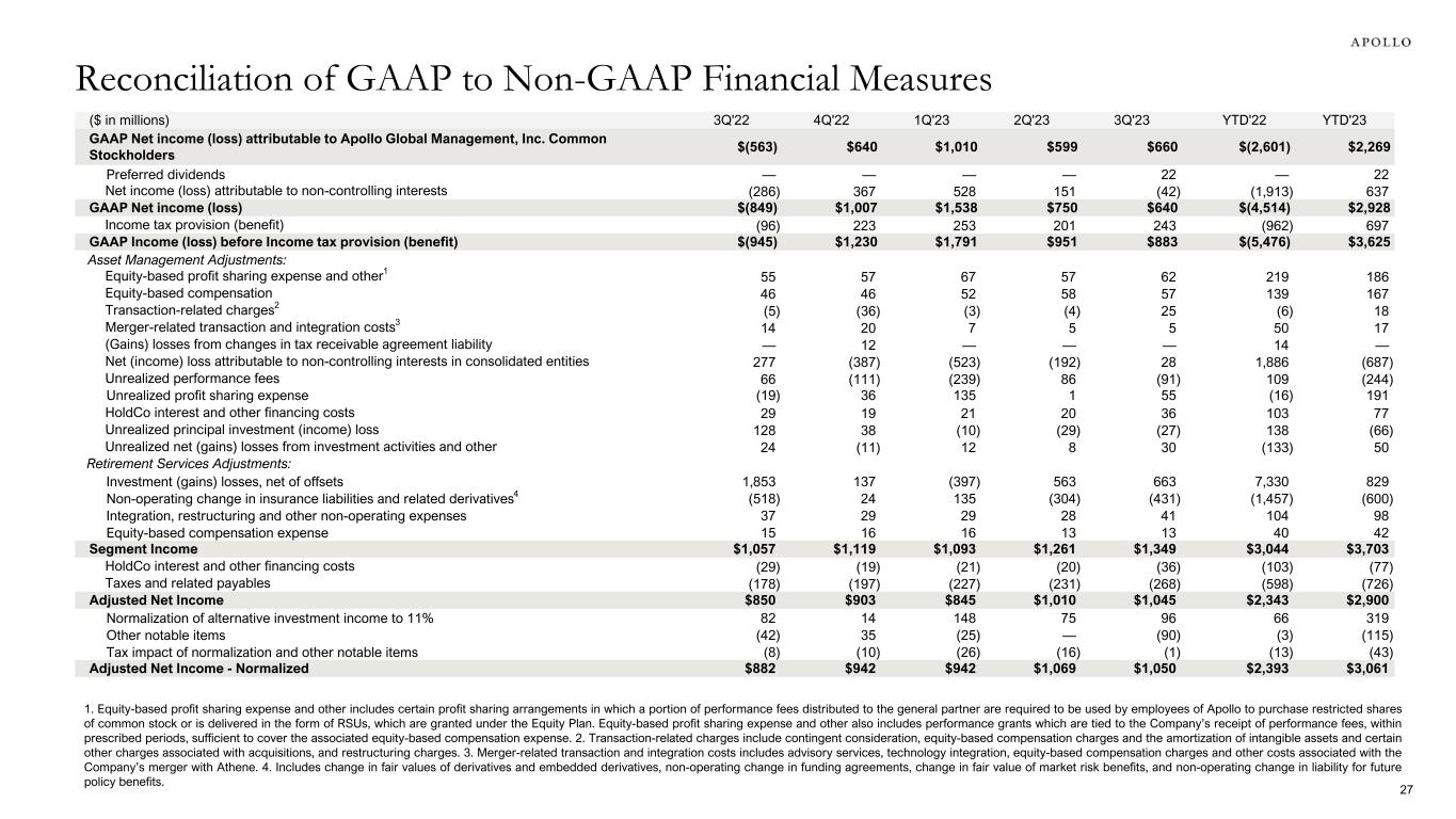 ($ in millions) 3Q'22 4Q'22 1Q'23 2Q'23 3Q'23 YTD'22 YTD'23 GAAP Net income (loss) attributable to Apollo Global Management, Inc. Common Stockholders $(563) $640 $1,010 $599 $660 $(2,601) $2,269 Preferred dividends — — — — 22 — 22 Net income (loss) attributable to non-controlling interests (286) 367 528 151 (42) (1,913) 637 GAAP Net income (loss) $(849) $1,007 $1,538 $750 $640 $(4,514) $2,928 Income tax provision (benefit) (96) 223 253 201 243 (962) 697 GAAP Income (loss) before Income tax provision (benefit) $(945) $1,230 $1,791 $951 $883 $(5,476) $3,625 Asset Management Adjustments: Equity-based profit sharing expense and other1 55 57 67 57 62 219 186 Equity-based compensation 46 46 52 58 57 139 167 Transaction-related charges2 (5) (36) (3) (4) 25 (6) 18 Merger-related transaction and integration costs3 14 20 7 5 5 50 17 (Gains) losses from changes in tax receivable agreement liability — 12 — — — 14 — Net (income) loss attributable to non-controlling interests in consolidated entities 277 (387) (523) (192) 28 1,886 (687) Unrealized performance fees 66 (111) (239) 86 (91) 109 (244) Unrealized profit sharing expense (19) 36 135 1 55 (16) 191 HoldCo interest and other financing costs 29 19 21 20 36 103 77 Unrealized principal investment (income) loss 128 38 (10) (29) (27) 138 (66) Unrealized net (gains) losses from investment activities and other 24 (11) 12 8 30 (133) 50 Retirement Services Adjustments: Investment (gains) losses, net of offsets 1,853 137 (397) 563 663 7,330 829 Non-operating change in insurance liabilities and related derivatives4 (518) 24 135 (304) (431) (1,457) (600) Integration, restructuring and other non-operating expenses 37 29 29 28 41 104 98 Equity-based compensation expense 15 16 16 13 13 40 42 Segment Income $1,057 $1,119 $1,093 $1,261 $1,349 $3,044 $3,703 HoldCo interest and other financing costs (29) (19) (21) (20) (36) (103) (77) Taxes and related payables (178) (197) (227) (231) (268) (598) (726) Adjusted Net Income $850 $903 $845 $1,010 $1,045 $2,343 $2,900 Normalization of alternative investment income to 11% 82 14 148 75 96 66 319 Other notable items (42) 35 (25) — (90) (3) (115) Tax impact of normalization and other notable items (8) (10) (26) (16) (1) (13) (43) Adjusted Net Income - Normalized $882 $942 $942 $1,069 $1,050 $2,393 $3,061 1. Equity-based profit sharing expense and other includes certain profit sharing arrangements in which a portion of performance fees distributed to the general partner are required to be used by employees of Apollo to purchase restricted shares of common stock or is delivered in the form of RSUs, which are granted under the Equity Plan. Equity-based profit sharing expense and other also includes performance grants which are tied to the Company’s receipt of performance fees, within prescribed periods, sufficient to cover the associated equity-based compensation expense. 2. Transaction-related charges include contingent consideration, equity-based compensation charges and the amortization of intangible assets and certain other charges associated with acquisitions, and restructuring charges. 3. Merger-related transaction and integration costs includes advisory services, technology integration, equity-based compensation charges and other costs associated with the Company’s merger with Athene. 4. Includes change in fair values of derivatives and embedded derivatives, non-operating change in funding agreements, change in fair value of market risk benefits, and non-operating change in liability for future policy benefits. Reconciliation of GAAP to Non-GAAP Financial Measures 27
