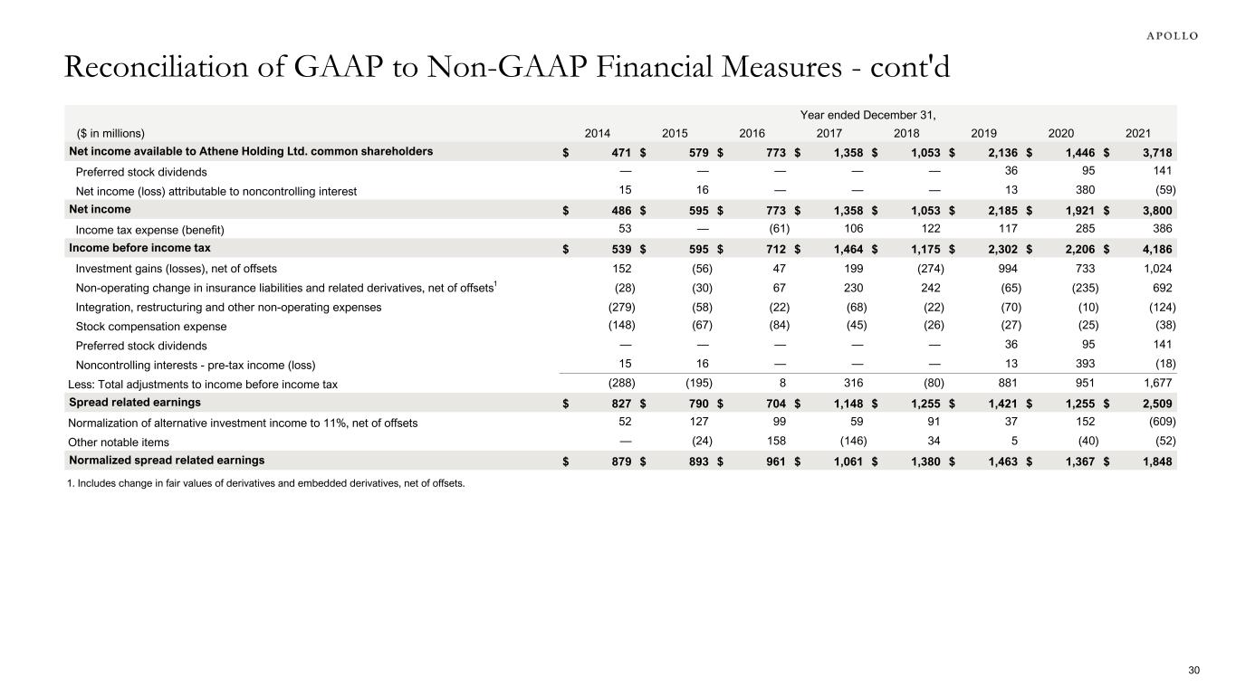Year ended December 31, ($ in millions) 2014 2015 2016 2017 2018 2019 2020 2021 2022 GAAP Net income (loss) attributable to Apollo Global Management, Inc. Common Stockholders $168 $134 $403 $616 $(42) $807 $120 $1,802 $(1,961) Preferred dividends — — — 14 32 37 37 37 — Net income (loss) attributable to non-controlling interests 562 216 567 814 29 693 310 2,428 (1,546) GAAP Net income (loss) $730 $350 $970 $1,444 $19 $1,537 $467 $4,267 $(3,507) Income tax provision (benefit) 147 27 91 326 86 (129) 86 594 (739) GAAP Income (loss) before Income tax provision (benefit) $877 $377 $1,061 $1,770 $105 $1,408 $553 $4,861 $(4,246) Asset Management Adjustments: Equity-based profit sharing expense and other1 — 1 3 7 91 96 129 146 276 Equity-based compensation 105 62 63 65 68 71 68 80 185 Preferred dividends — — — (14) (32) (37) (37) (37) — Transaction-related charges2 34 39 55 17 (6) 49 39 35 (42) Merger-related transaction and integration costs3 — — — — — — — 67 70 Charges associated with corporate conversion — — — — — 22 4 — — (Gains) losses from changes in tax receivable agreement liability (32) — (3) (200) (35) 50 (12) (10) 26 Net (income) loss attributable to non-controlling interests in consolidated entities (157) (21) (6) (9) (32) (31) (118) (418) 1,499 Unrealized performance fees 1,348 358 (511) (689) 783 (435) (35) (1,465) (2) Unrealized profit sharing expense (517) (137) 180 226 (275) 208 33 649 20 One-time equity-based compensation charges4 — — — — — — — 949 — HoldCo interest and other financing costs 19 27 39 59 69 98 154 170 122 Unrealized principal investment (income) loss 22 13 (65) (95) 62 (88) (62) (222) 176 Unrealized net (gains) losses from investment activities and other (260) (79) (139) (95) 193 (135) 421 (2,431) (144) Retirement Services Adjustments: Investment (gains) losses, net of offsets — — — — — — — — 7,467 Non-operating change in insurance liabilities and related derivatives5 — — — — — — — — (1,433) Integration, restructuring and other non-operating expenses — — — — — — — — 133 Equity-based compensation expense — — — — — — — — 56 Segment Income $1,439 $640 $677 $1,042 $991 $1,276 $1,137 $2,374 $4,163 HoldCo interest and other financing costs (19) (27) (39) (59) (69) (98) (154) (170) (122) Taxes and related payables (74) (10) (10) (26) (44) (62) (90) (172) (795) Adjusted Net Income $1,346 $603 $628 $957 $878 $1,116 $893 $2,032 $3,246 Normalization of alternative investment income to 11% — — — — — — — — 80 Other notable items — — — — — — — — 3 Tax impact of normalization and other notable items — — — — — — — — (17) Adjusted Net Income - Normalized $— $— $— $— $— $— $— $— $3,312 Reconciliation of GAAP to Non-GAAP Financial Measures - cont'd 28 1. Equity-based profit sharing expense and other includes certain profit sharing arrangements in which a portion of performance fees distributed to the general partner are required to be used by employees of Apollo to purchase restricted shares of common stock or is delivered in the form of RSUs, which are granted under the Equity Plan. Equity-based profit sharing expense and other also includes performance grants which are tied to the Company’s receipt of performance fees, within prescribed periods, sufficient to cover the associated equity-based compensation expense. 2. Transaction-related charges include contingent consideration, equity-based compensation charges and the amortization of intangible assets and certain other charges associated with acquisitions, and restructuring charges. 3. Merger-related transaction and integration costs includes advisory services, technology integration, equity-based compensation charges and other costs associated with the Company’s merger with Athene. 4. Includes one-time equity-based compensation expense and associated taxes related to the Company’s compensation structure reset. 5. Includes change in fair values of derivatives and embedded derivatives, non-operating change in funding agreements, change in fair value of market risk benefits, and non-operating change in liability for future policy benefits.