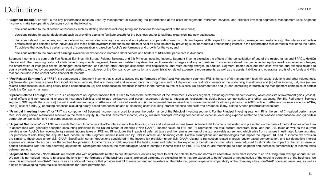 • “Segment Income”, or “SI”, is the key performance measure used by management in evaluating the performance of the asset management, retirement services, and principal investing segments. Management uses Segment Income to make key operating decisions such as the following: ▪ decisions related to the allocation of resources such as staffing decisions including hiring and locations for deployment of the new hires; ▪ decisions related to capital deployment such as providing capital to facilitate growth for the business and/or to facilitate expansion into new businesses; ▪ decisions related to expenses, such as determining annual discretionary bonuses and equity-based compensation awards to its employees. With respect to compensation, management seeks to align the interests of certain professionals and selected other individuals with those of the investors in the funds and those of Apollo’s stockholders by providing such individuals a profit sharing interest in the performance fees earned in relation to the funds. To achieve that objective, a certain amount of compensation is based on Apollo’s performance and growth for the year; and ▪ decisions related to the amount of earnings available for dividends to Common Stockholders and holders of RSUs that participate in dividends. Segment Income is the sum of (i) Fee Related Earnings, (ii) Spread Related Earnings, and (iii) Principal Investing Income. Segment Income excludes the effects of the consolidation of any of the related funds and SPACs, HoldCo interest and other financing costs not attributable to any specific segment, Taxes and Related Payables, transaction-related charges and any acquisitions. Transaction-related charges includes equity-based compensation charges, the amortization of intangible assets, contingent consideration, and certain other charges associated with acquisitions, and restructuring charges. In addition, Segment Income excludes non-cash revenue and expense related to equity awards granted by unconsolidated related parties to employees of the Company, compensation and administrative related expense reimbursements, as well as the assets, liabilities and operating results of the funds and VIEs that are included in the consolidated financial statements. • “Fee Related Earnings”, or “FRE”, is a component of Segment Income that is used to assess the performance of the Asset Management segment. FRE is the sum of (i) management fees, (ii) capital solutions and other related fees, (iii) fee-related performance fees from indefinite term vehicles, that are measured and received on a recurring basis and not dependent on realization events of the underlying investments and (iv) other income, net, less (a) fee- related compensation, excluding equity-based compensation, (b) non-compensation expenses incurred in the normal course of business, (c) placement fees and (d) non-controlling interests in the management companies of certain funds the Company manages. • “Spread Related Earnings”, or “SRE” is a component of Segment Income that is used to assess the performance of the Retirement Services segment, excluding certain market volatility, which consists of investment gains (losses), net of offsets and non-operating change in insurance liabilities and related derivatives, and certain expenses related to integration, restructuring, equity-based compensation, and other expenses. For the Retirement Services segment, SRE equals the sum of (i) the net investment earnings on Athene’s net invested assets and (ii) management fees received on business managed for others, primarily the ADIP portion of Athene's business ceded to ACRA, less (x) cost of funds, (y) operating expenses excluding equity-based compensation and (z) financing costs including interest expense and preferred dividends, if any, paid to Athene preferred stockholders. • “Principal Investing Income”, or “PII” is a component of Segment Income that is used to assess the performance of the Principal Investing segment. For the Principal Investing segment, PII is the sum of (i) realized performance fees, including certain realizations received in the form of equity, (ii) realized investment income, less (x) realized principal investing compensation expense, excluding expense related to equity-based compensation, and (y) certain corporate compensation and non-compensation expenses. • “Adjusted Net Income” or “ANI” represents Segment Income less HoldCo interest and other financing costs and estimated income taxes. Adjusted Net Income is calculated and presented on the basis of methodologies other than in accordance with generally accepted accounting principles in the United States of America (“Non-GAAP”). Income taxes on FRE and PII represents the total current corporate, local, and non-U.S. taxes as well as the current payable under Apollo’s tax receivable agreement. Income taxes on FRE and PII excludes the impacts of deferred taxes and the remeasurement of the tax receivable agreement, which arise from changes in estimated future tax rates. For purposes of calculating the Adjusted Net Income tax rate, Segment Income is reduced by HoldCo interest and financing costs. Certain assumptions and methodologies that impact the implied FRE and PII income tax provision are similar to those used under U.S. GAAP. Specifically, certain deductions considered in the income tax provision under U.S. GAAP relating to transaction related charges, equity-based compensation, and tax deductible interest expense are taken into account for the implied tax provision. Income Taxes on SRE represent the total current and deferred tax expense or benefit on income before taxes adjusted to eliminate the impact of the tax expense or benefit associated with the non-operating adjustments. Management believes the methodologies used to compute income taxes on FRE, SRE, and PII are meaningful to each segment and increases comparability of income taxe