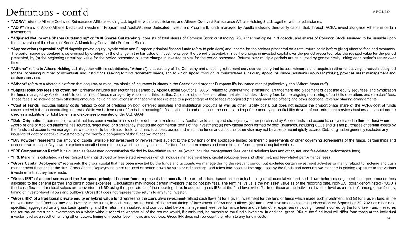 • “ACRA” refers to Athene Co-Invest Reinsurance Affiliate Holding Ltd, together with its subsidiaries, and Athene Co-Invest Reinsurance Affiliate Holding 2 Ltd, together with its subsidiaries. • “ADIP” refers to Apollo/Athene Dedicated Investment Program and Apollo/Athene Dedicated Investment Program II, funds managed by Apollo including third-party capital that, through ACRA, invest alongside Athene in certain investments. • "Adjusted Net Income Shares Outstanding" or "ANI Shares Outstanding" consists of total shares of Common Stock outstanding, RSUs that participate in dividends, and shares of Common Stock assumed to be issuable upon the conversion of the shares of Series A Mandatory Convertible Preferred Stock. • “Appreciation (depreciation)” of flagship private equity, hybrid value and European principal finance funds refers to gain (loss) and income for the periods presented on a total return basis before giving effect to fees and expenses. The performance percentage is determined by dividing (a) the change in the fair value of investments over the period presented, minus the change in invested capital over the period presented, plus the realized value for the period presented, by (b) the beginning unrealized value for the period presented plus the change in invested capital for the period presented. Returns over multiple periods are calculated by geometrically linking each period’s return over time. • “Athene” refers to Athene Holding Ltd. (together with its subsidiaries, “Athene”), a subsidiary of the Company and a leading retirement services company that issues, reinsures and acquires retirement savings products designed for the increasing number of individuals and institutions seeking to fund retirement needs, and to which Apollo, through its consolidated subsidiary Apollo Insurance Solutions Group LP (“ISG”), provides asset management and advisory services. • “Athora” refers to a strategic platform that acquires or reinsures blocks of insurance business in the German and broader European life insurance market (collectively, the “Athora Accounts”). • “Capital solutions fees and other, net” primarily includes transaction fees earned by Apollo Capital Solutions ("ACS") related to underwriting, structuring, arrangement and placement of debt and equity securities, and syndication for funds managed by Apollo, portfolio companies of funds managed by Apollo, and third parties. Capital solutions fees and other, net also includes advisory fees for the ongoing monitoring of portfolio operations and directors' fees. These fees also include certain offsetting amounts including reductions in management fees related to a percentage of these fees recognized ("management fee offset") and other additional revenue sharing arrangements. • “Cost of Funds” includes liability costs related to cost of crediting on both deferred annuities and institutional products as well as other liability costs, but does not include the proportionate share of the ACRA cost of funds associated with the noncontrolling interests. While we believe cost of funds is a meaningful financial metric and enhances the understanding of the underlying profitability drivers of our retirement services business, it should not be used as a substitute for total benefits and expenses presented under U.S. GAAP. • “Debt Origination” represents (i) capital that has been invested in new debt or debt like investments by Apollo's yield and hybrid strategies (whether purchased by Apollo funds and accounts, or syndicated to third parties) where Apollo or one of Apollo's platforms has sourced, negotiated, or significantly affected the commercial terms of the investment; (ii) new capital pools formed by debt issuances, including CLOs and (iii) net purchases of certain assets by the funds and accounts we manage that we consider to be private, illiquid, and hard to access assets and which the funds and accounts otherwise may not be able to meaningfully access. Debt origination generally excludes any issuance of debt or debt-like investments by the portfolio companies of the funds we manage. • “Dry Powder” represents the amount of capital available for investment or reinvestment subject to the provisions of the applicable limited partnership agreements or other governing agreements of the funds, partnerships and accounts we manage. Dry powder excludes uncalled commitments which can only be called for fund fees and expenses and commitments from perpetual capital vehicles. • “FRE Compensation Ratio” is calculated as fee-related compensation divided by fee-related revenues (which includes management fees, capital solutions fees and other, net, and fee-related performance fees). • “FRE Margin” is calculated as Fee Related Earnings divided by fee-related revenues (which includes management fees, capital solutions fees and other, net, and fee-related performance fees). • “Gross Capital Deployment” represents the gross capital that has been invested by the funds and accounts we manage during the relevant period, but excludes certain investment activities primarily related to hedging and cash management functions at the firm. Gross Capital Deployment is not reduced or netted down by sales or refinancings, and takes into account leverage used by the funds and accounts we manage in gaining exposure to the various investments that they have made. • "Gross IRR" of accord series and the European principal finance funds represents the annualized return of a fund based on the actual timing of all cumulative fund cash flows before management fees, performance fees allocated to the general partner and certain other expenses. Calculations may include certain investors that do not pay fees. The terminal value is the net asset value as of the reporting date. Non-U.S. dollar denominated (“USD”) fund cash flows and residual values are converted to USD using the spot rate as of 