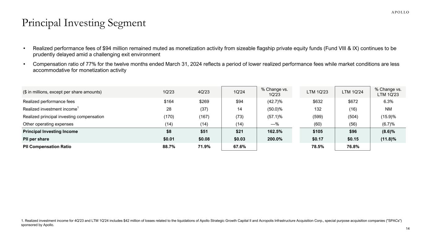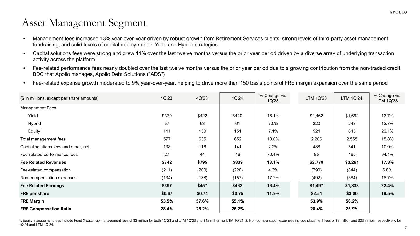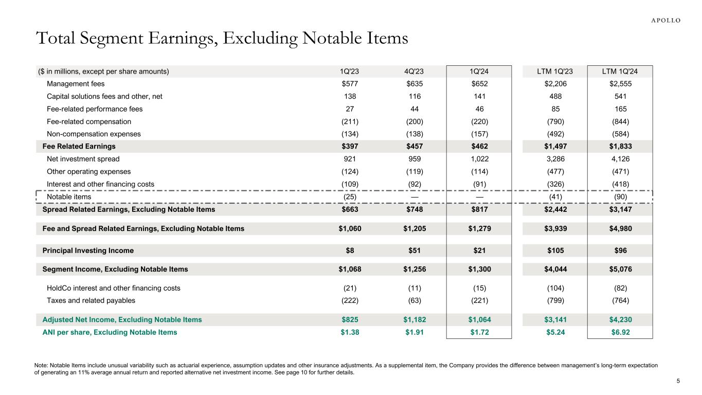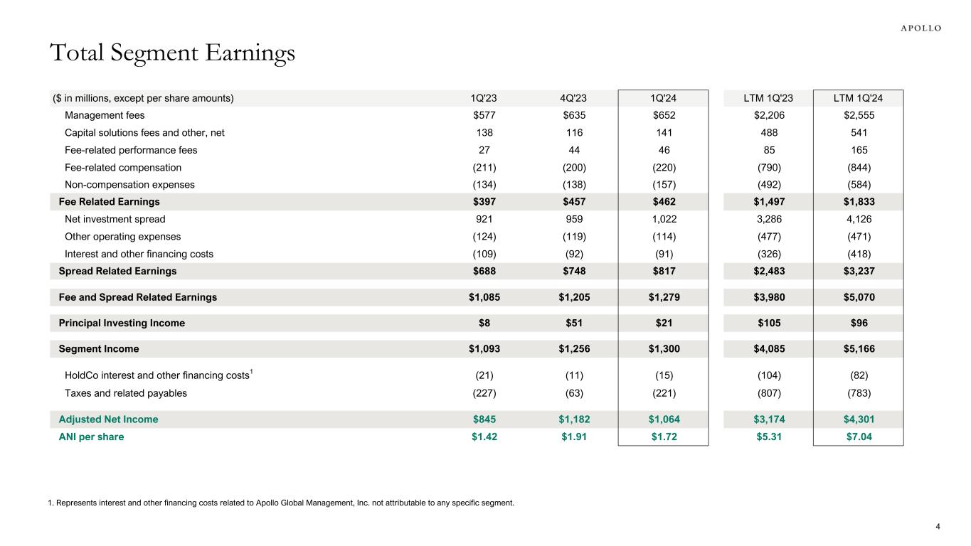 ($ in millions, except per share amounts) 1Q'23 4Q'23 1Q'24 LTM 1Q'23 LTM 1Q'24 Management fees $577 $635 $652 $2,206 $2,555 Capital solutions fees and other, net 138 116 141 488 541 Fee-related performance fees 27 44 46 85 165 Fee-related compensation (211) (200) (220) (790) (844) Non-compensation expenses (134) (138) (157) (492) (584) Fee Related Earnings $397 $457 $462 $1,497 $1,833 Net investment spread 921 959 1,022 3,286 4,126 Other operating expenses (124) (119) (114) (477) (471) Interest and other financing costs (109) (92) (91) (326) (418) Spread Related Earnings $688 $748 $817 $2,483 $3,237 Fee and Spread Related Earnings $1,085 $1,205 $1,279 $3,980 $5,070 Principal Investing Income $8 $51 $21 $105 $96 Segment Income $1,093 $1,256 $1,300 $4,085 $5,166 HoldCo interest and other financing costs1 (21) (11) (15) (104) (82) Taxes and related payables (227) (63) (221) (807) (783) Adjusted Net Income $845 $1,182 $1,064 $3,174 $4,301 ANI per share $1.42 $1.91 $1.72 $5.31 $7.04 1. Represents interest and other financing costs related to Apollo Global Management, Inc. not attributable to any specific segment. Total Segment Earnings 4