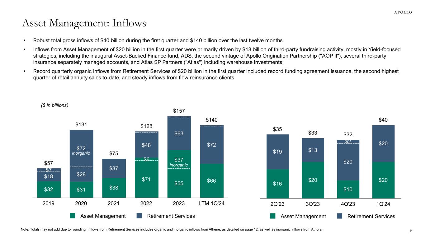 Total AUM ($bn) Fee-Generating AUM ($bn) $513 $598 $671 $373 $438 $501 $54 $59 $64 $86 $101 $107 Yield Hybrid Equity 1Q'22 1Q'23 1Q'24 $376 $445 $506 $311 $368 $425 $24 $28 $29 $41 $48 $53 Yield Hybrid Equity 1Q'22 1Q'23 1Q'24 Perpetual Capital AUM ($bn) $302 $341 $395 $218 $248 $293 $55 $51 $52 $29 $42 $51 Athene Athora Other 1Q'22 1Q'23 1Q'24 8 Asset Management: Assets Under Management Note: AUM totals may not add due to rounding. 1. Perpetual Capital AUM derived from Athene includes assets, unfunded commitments, and available capital attributable to ADIP. 2. Other includes MidCap Financial ($13 billion), Apollo Commercial Real Estate Finance, Inc. ($9 billion), Apollo Debt Solutions BDC ($9 billion), Apollo Diversified Real Estate Fund/Apollo Diversified Credit Fund ($7 billion), MidCap Financial Investment Corporation ($3 billion), Apollo Senior Floating Rate Fund/ Apollo Tactical Income Fund ($1 billion), and other AUM related to a publicly traded business development company ($2 billion), among others. Other also includes third-party capital within Apollo Aligned Alternatives ($5 billion), with the remainder of its net asset value attributable to Athene ($11 billion). AUM related to Apollo Debt Solutions, MidCap Financial Investment Corporation and the publicly traded business development company is as of December 31, 2023. 21 • Total AUM increased $73 billion, or 12%, year-over-year primarily driven by $66 billion of inflows from Asset Management and $74 billion of gross inflows from Retirement Services, as well as mark-to-market appreciation, partially offset by $61 billion of outflows primarily driven by normal course activity at Athene and $31 billion of realization activity • Fee-Generating AUM increased $61 billion, or 14%, year-over-year primarily driven by robust net organic growth at Athene, fundraising across a variety of Asset Management strategies, mark-to-market appreciation, and strong levels of capital deployment • Nearly 60% of Apollo’s total AUM is comprised of perpetual capital, which is highly scalable and does not rely on cyclical fundraising dynamics