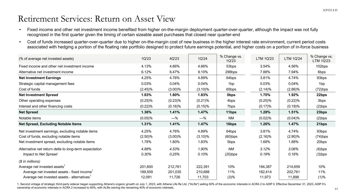 • Fixed income and other net investment income benefited from higher on-the-margin deployment quarter-over-quarter, although the impact was not fully recognized in the first quarter given the timing of certain sizeable asset purchases that closed near quarter-end • Cost of funds increased quarter-over-quarter due to higher on-the-margin cost of new business in the higher interest rate environment, current period costs associated with hedging a portion of the floating rate portfolio designed to protect future earnings potential, and higher costs on a portion of in-force business (% of average net invested assets) 1Q'23 4Q'23 1Q'24 % Change vs. 1Q'23 LTM 1Q'23 LTM 1Q'24 % Change vs. LTM 1Q'23 Fixed income and other net investment income 4.13% 4.66% 4.66% 53bps 3.54% 4.56% 102bps Alternative net investment income 6.12% 6.47% 9.10% 298bps 7.88% 7.94% 6bps Net Investment Earnings 4.25% 4.76% 4.89% 64bps 3.81% 4.74% 93bps Strategic capital management fees 0.03% 0.04% 0.04% 1bp 0.03% 0.04% 1bp Cost of funds (2.45)% (3.00)% (3.10)% 65bps (2.14)% (2.86)% (72)bps Net Investment Spread 1.83% 1.80% 1.83% 0bps 1.70% 1.92% 22bps Other operating expenses (0.25)% (0.23)% (0.21)% 4bps (0.25)% (0.22)% 3bps Interest and other financing costs (0.22)% (0.16)% (0.15)% 7bps (0.17)% (0.19)% (2)bps Net Spread 1.36% 1.41% 1.47% 11bps 1.28% 1.51% 23bps Notable items (0.05)% —% —% NM (0.02)% (0.04)% (2)bps Net Spread, Excluding Notable Items 1.31% 1.41% 1.47% 16bps 1.26% 1.47% 21bps Net investment earnings, excluding notable items 4.25% 4.76% 4.89% 64bps 3.81% 4.74% 93bps Cost of funds, excluding notable items (2.50)% (3.00)% (3.10)% (60)bps (2.16)% (2.90)% (74)bps Net investment spread, excluding notable items 1.78% 1.80% 1.83% 5bps 1.68% 1.88% 20bps Alternative net return delta to long-term expectation 4.88% 4.53% 1.90% NM 3.12% 3.06% (6)bps Impact to Net Spread 0.30% 0.25% 0.10% (20)bps 0.19% 0.16% (3)bps ($ in millions) Average net invested assets1 201,600 212,761 222,391 10% 194,387 214,659 10% Average net invested assets - fixed income1 189,509 201,035 210,688 11% 182,414 202,761 11% Average net invested assets - alternatives1 12,091 11,726 11,703 (3)% 11,973 11,898 (1)% Retirement Services: Return on Asset View 1. Second vintage of strategic third-party sidecar began supporting Athene's organic growth on July 1, 2023, with Athene Life Re Ltd. ("ALRe") selling 50% of the economic interests in ACRA 2 to ADIP II. Effective December 31, 2023, ADIP II’s ownership of economic interests in ACRA 2 increased to 60%, with ALRe owning the remaining 40% of economic interests. 11