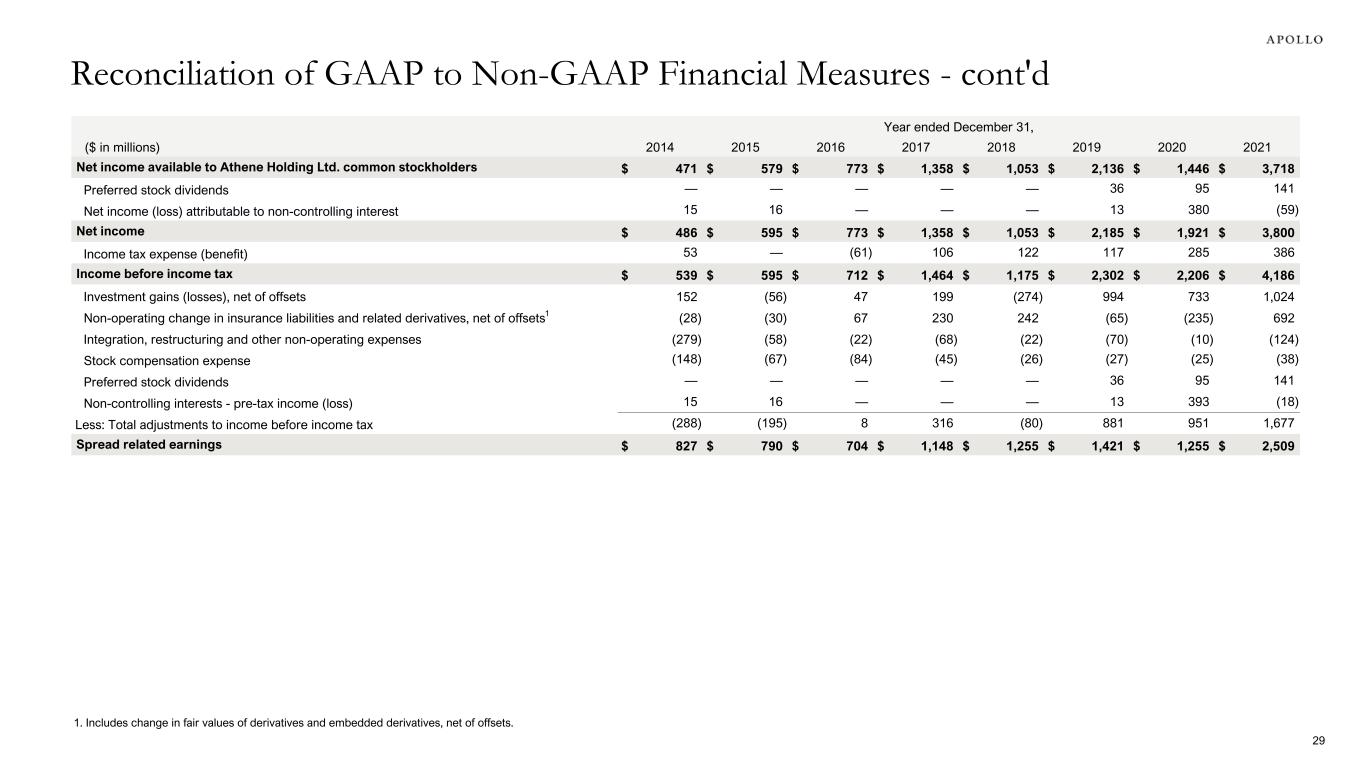 Year ended December 31, ($ in millions) 2014 2015 2016 2017 2018 2019 2020 2021 Net income available to Athene Holding Ltd. common stockholders $ 471 $ 579 $ 773 $ 1,358 $ 1,053 $ 2,136 $ 1,446 $ 3,718 Preferred stock dividends — — — — — 36 95 141 Net income (loss) attributable to non-controlling interest 15 16 — — — 13 380 (59) Net income $ 486 $ 595 $ 773 $ 1,358 $ 1,053 $ 2,185 $ 1,921 $ 3,800 Income tax expense (benefit) 53 — (61) 106 122 117 285 386 Income before income tax $ 539 $ 595 $ 712 $ 1,464 $ 1,175 $ 2,302 $ 2,206 $ 4,186 Investment gains (losses), net of offsets 152 (56) 47 199 (274) 994 733 1,024 Non-operating change in insurance liabilities and related derivatives, net of offsets1 (28) (30) 67 230 242 (65) (235) 692 Integration, restructuring and other non-operating expenses (279) (58) (22) (68) (22) (70) (10) (124) Stock compensation expense (148) (67) (84) (45) (26) (27) (25) (38) Preferred stock dividends — — — — — 36 95 141 Non-controlling interests - pre-tax income (loss) 15 16 — — — 13 393 (18) Less: Total adjustments to income before income tax (288) (195) 8 316 (80) 881 951 1,677 Spread related earnings $ 827 $ 790 $ 704 $ 1,148 $ 1,255 $ 1,421 $ 1,255 $ 2,509 Reconciliation of GAAP to Non-GAAP Financial Measures - cont'd 29 1. Includes change in fair values of derivatives and embedded derivatives, net of offsets.