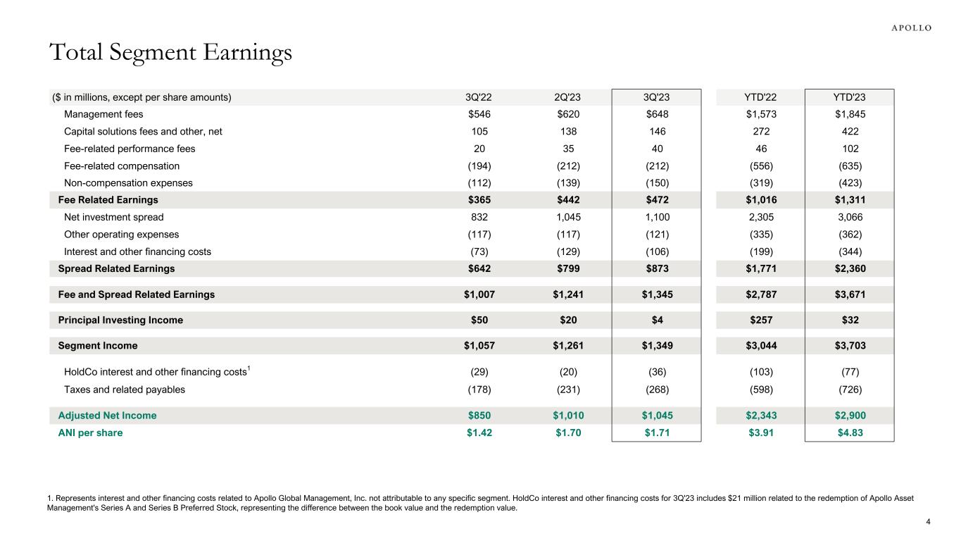 ($ in millions, except per share amounts) 3Q'22 2Q'23 3Q'23 YTD'22 YTD'23 Management fees $546 $620 $648 $1,573 $1,845 Capital solutions fees and other, net 105 138 146 272 422 Fee-related performance fees 20 35 40 46 102 Fee-related compensation (194) (212) (212) (556) (635) Non-compensation expenses (112) (139) (150) (319) (423) Fee Related Earnings $365 $442 $472 $1,016 $1,311 Net investment spread 832 1,045 1,100 2,305 3,066 Other operating expenses (117) (117) (121) (335) (362) Interest and other financing costs (73) (129) (106) (199) (344) Spread Related Earnings $642 $799 $873 $1,771 $2,360 Fee and Spread Related Earnings $1,007 $1,241 $1,345 $2,787 $3,671 Principal Investing Income $50 $20 $4 $257 $32 Segment Income $1,057 $1,261 $1,349 $3,044 $3,703 HoldCo interest and other financing costs1 (29) (20) (36) (103) (77) Taxes and related payables (178) (231) (268) (598) (726) Adjusted Net Income $850 $1,010 $1,045 $2,343 $2,900 ANI per share $1.42 $1.70 $1.71 $3.91 $4.83 1. Represents interest and other financing costs related to Apollo Global Management, Inc. not attributable to any specific segment. HoldCo interest and other financing costs for 3Q'23 includes $21 million related to the redemption of Apollo Asset Management's Series A and Series B Preferred Stock, representing the difference between the book value and the redemption value. Total Segment Earnings 4