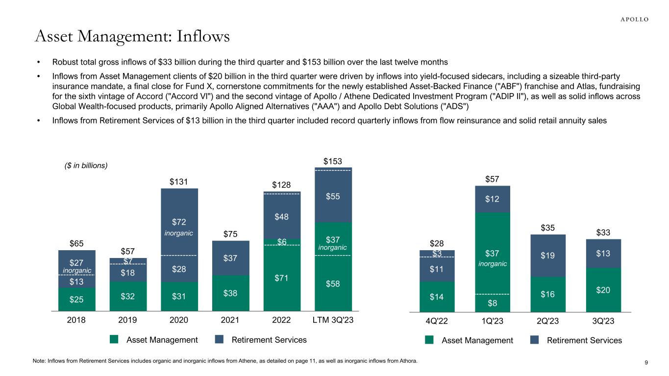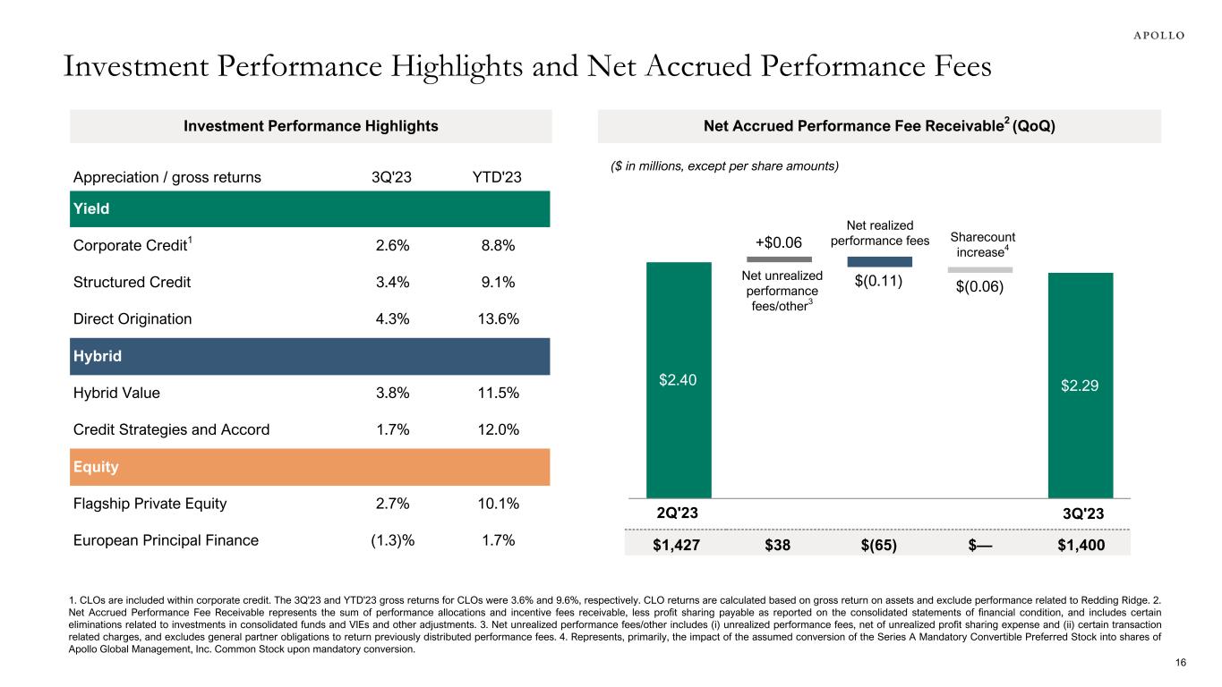• "Gross IRR" of infrastructure funds represents the cumulative investment-related cash flows in the fund itself (and not any one investor in the fund), on the basis of the actual timing of cash inflows and outflows (for unrealized investments assuming disposition on September 30, 2023 or other date specified) starting on the date that each investment closes, and the return is annualized and compounded before management fees, performance fees, and certain other expenses (including interest incurred by the fund itself) and measures the returns on the fund’s investments as a whole without regard to whether all of the returns would, if distributed, be payable to the fund’s investors. Non-USD fund cash flows and residual values are converted to USD using the spot rate as of the reporting date. In addition, gross IRRs at the fund level will differ from those at the individual investor level as a result of, among other factors, timing of investor-level inflows and outflows. Gross IRR does not represent the return to any fund investor. • “Gross Return” of a yield fund and Credit Strategies and Accord is the monthly or quarterly time-weighted return that is equal to the percentage change in the value of a fund’s portfolio, adjusted for all contributions and withdrawals (cash flows) before the effects of management fees, incentive fees allocated to the general partner, or other fees and expenses. Returns for these categories are calculated for all funds and accounts in the respective strategies excluding assets for Athene, Athora and certain other entities where Apollo manages or may manage a significant portion of the total company assets. Returns of CLOs represent the gross returns on assets. Returns over multiple periods are calculated by geometrically linking each period’s return over time. • “HoldCo” refers to Apollo Global Management, Inc. • “Inflows” within the Asset Management segment represents (i) at the individual strategy level, subscriptions, commitments, and other increases in available capital, such as acquisitions or leverage, net of inter-strategy transfers, and (ii) on an aggregate basis, the sum of inflows across the yield, hybrid and equity strategies. • "MidCap Financial" refers to MidCap FinCo Designated Activity Company. • “Net Invested Assets” represent the investments that directly back Athene's net reserve liabilities as well as surplus assets. Net invested assets is used in the computation of net investment earned rate, which is used to analyze the profitability of Athene’s investment portfolio. Net invested assets includes (a) total investments on the statements of financial condition, with AFS securities, trading securities and mortgage loans at cost or amortized cost, excluding derivatives, (b) cash and cash equivalents and restricted cash, (c) investments in related parties, (d) accrued investment income, (e) VIE assets, liabilities and noncontrolling interest adjustments, (f) net investment payables and receivables, (g) policy loans ceded (which offset the direct policy loans in total investments) and (h) an adjustment for the allowance for credit losses. Net invested assets exclude assets associated with funds withheld liabilities related to business exited through reinsurance agreements and derivative collateral (offsetting the related cash positions). Athene includes the underlying investments supporting its assumed funds withheld and modco agreements in its net invested assets calculation in order to match the assets with the income received. Athene believes the adjustments for reinsurance provide a view of the assets for which it has economic exposure. Net invested assets include Athene’s proportionate share of ACRA investments, based on Athene’s economic ownership, but do not include the proportionate share of investments associated with the noncontrolling interests. Net invested assets are averaged over the number of quarters in the relevant period to compute a net investment earned rate for such period. While Athene believes net invested assets is a meaningful financial metric and enhances the understanding of the underlying drivers of its investment portfolio, it should not be used as a substitute for total investments, including related parties, presented under U.S. GAAP. • “Net Investment Earned Rate” is computed as the income from Athene's net invested assets divided by the average net invested assets, for the relevant period. • “Net Investment Spread” measures Athene's investment performance plus its strategic capital management fees, less its total cost of funds. Net investment earned rate is a key measure of Athene's investment performance while cost of funds is a key measure of the cost of its policyholder benefits and liabilities. • "Net IRR" of accord series and the European principal finance funds represents the annualized return of a fund after management fees, performance fees allocated to the general partner and certain other expenses, calculated on investors that pay such fees. The terminal value is the net asset value as of the reporting date. Non-USD fund cash flows and residual values are converted to USD using the spot rate as of the reporting date. In addition, net IRR at the fund level will differ from that at the individual investor level as a result of, among other factors, timing of investor-level inflows and outflows. Net IRR does not represent the return to any fund investor. • "Net IRR" of a traditional private equity or the hybrid value funds represents the gross IRR applicable to a fund, including returns for related parties which may not pay fees or performance fees, net of management fees, certain expenses (including interest incurred or earned by the fund itself) and realized performance fees all offset to the extent of interest income, and measures returns at the fund level on amounts that, if distributed, would be paid to investors of the fund. The timing of cash flo