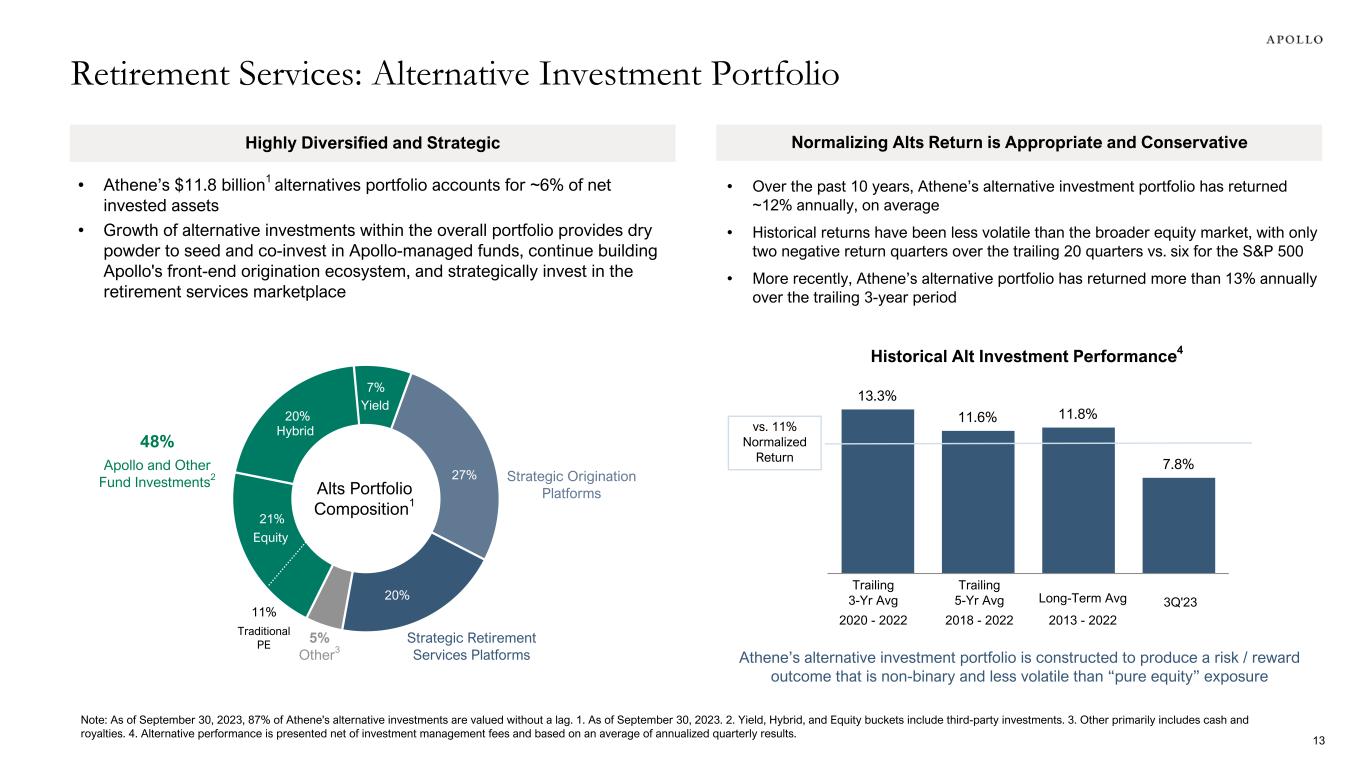 1.66% 0.16% (0.15)% 0.02% 1.69% 2Q'23 3Q'23 1.52% 0.16% (0.04)% 0.02% 0.02% 1.68% 2Q'23 3Q'23 Investment Portfolio Highlights Retirement Services Net Spread Bridge (QoQ) Normalized Retirement Services Net Spread Bridge (QoQ)6 • 97% of Athene’s fixed income portfolio1 is invested in investment grade assets • 20% or $42 billion of Athene’s portfolio2 is invested in floating rate assets, 13% or $27 billion net of floating rate liabilities3 • Apollo Asset Management aims to generate 30 to 40 basis points of asset outperformance across Athene's portfolio • Target asset classes which generate illiquidity or structuring premium such as CLOs and ABS, not incremental credit risk • CRE investments virtually all debt (i.e. not equity) and well-suited for Athene's long duration liability profile - more information can be found on Athene's website here5 • Focus on directly originated, senior secured loans where control of origination results in better risk-adjusted return • Historical annual credit losses across total portfolio of only 9 basis points over the past five years compared to 14 basis points for the industry7 Gain on Venerable Insurance and Annuity Company (VIAC) recapture, partially offset by higher cost of funds on new business and other nonrecurring items Higher cost of funds on new business Retirement Services: Portfolio & Spread Highlights 1. As of September 30, 2023, 97% of $130 billion of available for sale securities designated NAIC 1 or 2. 2. Defined as Athene's net invested assets, which totaled $208 billion, as of September 30, 2023. 3. Floating rate liabilities at notional were approximately $15 billion, or approximately 7% of Athene's net invested assets, as of September 30, 2023. 4. Other represents strategic capital management fees, other operating expenses, interest and other financing costs, asset mix and the impact from the sale of 50% of the economic interests in ACRA 2 to ADIP II. 5. The contents of any website linked in this presentation are not incorporated by reference and only speak as of the date listed thereon. 6. Normalized net spread reflects adjustments to exclude notable items and normalize alternative investment income to an 11% long-term return. 7. Represents U.S. statutory impairments per SNL Financial as of December 31, 2022 (2018 - 2022). Industry average includes AEL, AIG, AMP, BHF, EQH, FG, LNC, MET, PFG, PRU, VOYA and Transamerica. For Athene, U.S. statutory data adjusted to include impairments and assets in Bermuda. 12 Other4 Lower alts return Other4 Higher income from floating rate assets and deployment Higher income from floating rate assets and deployment