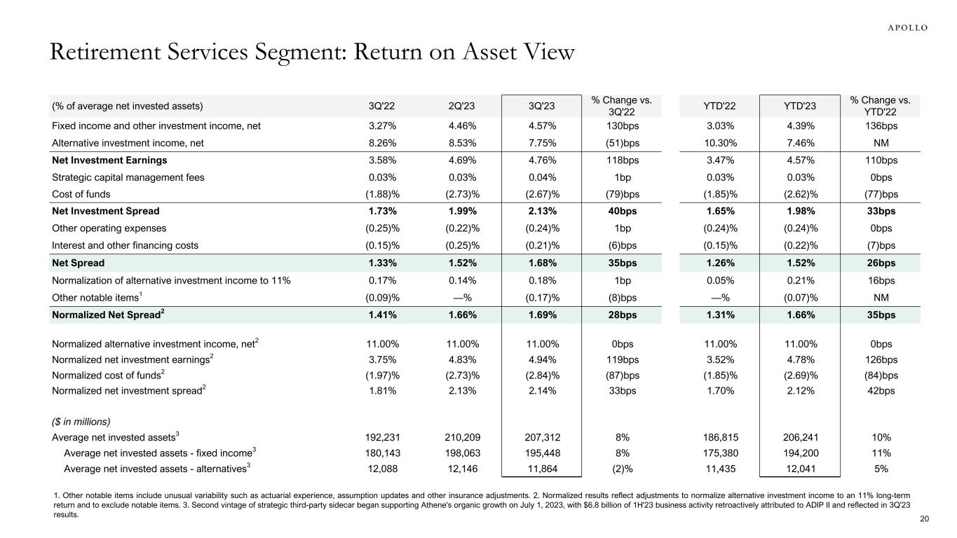 (% of average net invested assets) 3Q'22 2Q'23 3Q'23 % Change vs. 3Q'22 YTD'22 YTD'23 % Change vs. YTD'22 Fixed income and other investment income, net 3.27% 4.46% 4.57% 130bps 3.03% 4.39% 136bps Alternative investment income, net 8.26% 8.53% 7.75% (51)bps 10.30% 7.46% NM Net Investment Earnings 3.58% 4.69% 4.76% 118bps 3.47% 4.57% 110bps Strategic capital management fees 0.03% 0.03% 0.04% 1bp 0.03% 0.03% 0bps Cost of funds (1.88)% (2.73)% (2.67)% (79)bps (1.85)% (2.62)% (77)bps Net Investment Spread 1.73% 1.99% 2.13% 40bps 1.65% 1.98% 33bps Other operating expenses (0.25)% (0.22)% (0.24)% 1bp (0.24)% (0.24)% 0bps Interest and other financing costs (0.15)% (0.25)% (0.21)% (6)bps (0.15)% (0.22)% (7)bps Net Spread 1.33% 1.52% 1.68% 35bps 1.26% 1.52% 26bps Normalization of alternative investment income to 11% 0.17% 0.14% 0.18% 1bp 0.05% 0.21% 16bps Other notable items1 (0.09)% —% (0.17)% (8)bps —% (0.07)% NM Normalized Net Spread2 1.41% 1.66% 1.69% 28bps 1.31% 1.66% 35bps Normalized alternative investment income, net2 11.00% 11.00% 11.00% 0bps 11.00% 11.00% 0bps Normalized net investment earnings2 3.75% 4.83% 4.94% 119bps 3.52% 4.78% 126bps Normalized cost of funds2 (1.97)% (2.73)% (2.84)% (87)bps (1.85)% (2.69)% (84)bps Normalized net investment spread2 1.81% 2.13% 2.14% 33bps 1.70% 2.12% 42bps ($ in millions) Average net invested assets3 192,231 210,209 207,312 8% 186,815 206,241 10% Average net invested assets - fixed income3 180,143 198,063 195,448 8% 175,380 194,200 11% Average net invested assets - alternatives3 12,088 12,146 11,864 (2)% 11,435 12,041 5% Retirement Services Segment: Return on Asset View 1. Other notable items include unusual variability such as actuarial experience, assumption updates and other insurance adjustments. 2. Normalized results reflect adjustments to normalize alternative investment income to an 11% long-term return and to exclude notable items. 3. Second vintage of strategic third-party sidecar began supporting Athene's organic growth on July 1, 2023, with $6.8 billion of 1H'23 business activity retroactively attributed to ADIP II and reflected in 3Q'23 results. 20
