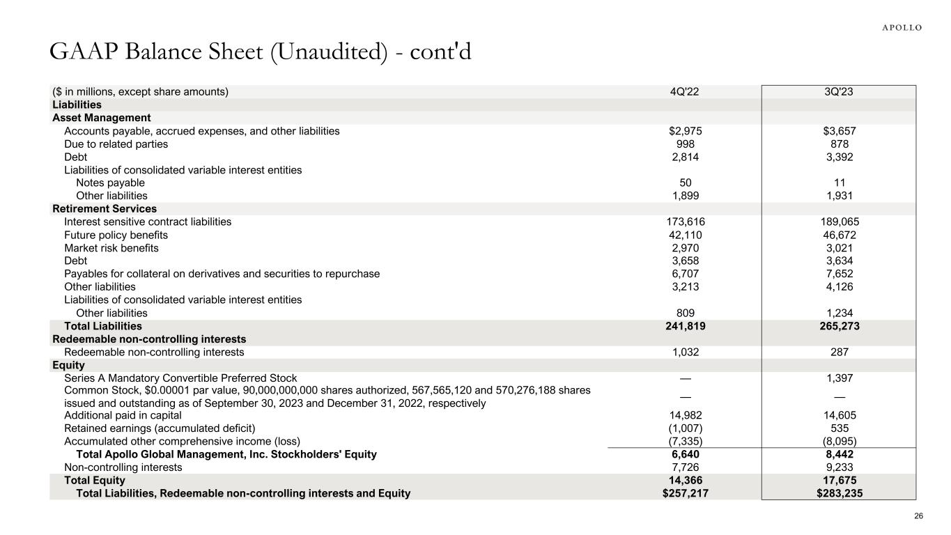 ($ in millions, except share amounts) 4Q'22 3Q'23 Liabilities Asset Management Accounts payable, accrued expenses, and other liabilities $2,975 $3,657 Due to related parties 998 878 Debt 2,814 3,392 Liabilities of consolidated variable interest entities Notes payable 50 11 Other liabilities 1,899 1,931 Retirement Services Interest sensitive contract liabilities 173,616 189,065 Future policy benefits 42,110 46,672 Market risk benefits 2,970 3,021 Debt 3,658 3,634 Payables for collateral on derivatives and securities to repurchase 6,707 7,652 Other liabilities 3,213 4,126 Liabilities of consolidated variable interest entities Other liabilities 809 1,234 Total Liabilities 241,819 265,273 Redeemable non-controlling interests Redeemable non-controlling interests 1,032 287 Equity Series A Mandatory Convertible Preferred Stock — 1,397 Common Stock, $0.00001 par value, 90,000,000,000 shares authorized, 567,565,120 and 570,276,188 shares issued and outstanding as of September 30, 2023 and December 31, 2022, respectively — — Additional paid in capital 14,982 14,605 Retained earnings (accumulated deficit) (1,007) 535 Accumulated other comprehensive income (loss) (7,335) (8,095) Total Apollo Global Management, Inc. Stockholders' Equity 6,640 8,442 Non-controlling interests 7,726 9,233 Total Equity 14,366 17,675 Total Liabilities, Redeemable non-controlling interests and Equity $257,217 $283,235 GAAP Balance Sheet (Unaudited) - cont'd 26