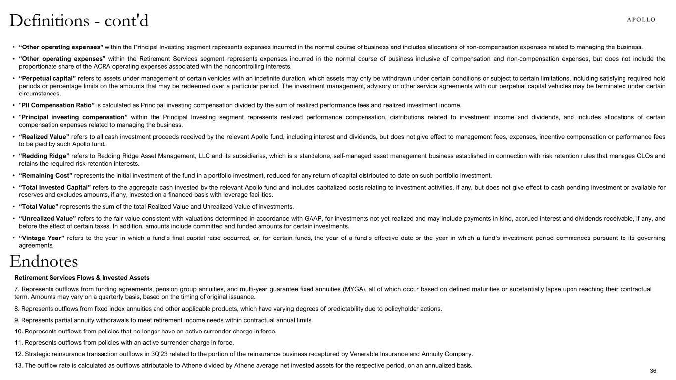 Retirement Services Flows & Invested Assets 7. Represents outflows from funding agreements, pension group annuities, and multi-year guarantee fixed annuities (MYGA), all of which occur based on defined maturities or substantially lapse upon reaching their contractual term. Amounts may vary on a quarterly basis, based on the timing of original issuance. 8. Represents outflows from fixed index annuities and other applicable products, which have varying degrees of predictability due to policyholder actions. 9. Represents partial annuity withdrawals to meet retirement income needs within contractual annual limits. 10. Represents outflows from policies that no longer have an active surrender charge in force. 11. Represents outflows from policies with an active surrender charge in force. 12. Strategic reinsurance transaction outflows in 3Q'23 related to the portion of the reinsurance business recaptured by Venerable Insurance and Annuity Company. 13. The outflow rate is calculated as outflows attributable to Athene divided by Athene average net invested assets for the respective period, on an annualized basis. • “Other operating expenses” within the Principal Investing segment represents expenses incurred in the normal course of business and includes allocations of non-compensation expenses related to managing the business. • “Other operating expenses” within the Retirement Services segment represents expenses incurred in the normal course of business inclusive of compensation and non-compensation expenses, but does not include the proportionate share of the ACRA operating expenses associated with the noncontrolling interests. • “Perpetual capital” refers to assets under management of certain vehicles with an indefinite duration, which assets may only be withdrawn under certain conditions or subject to certain limitations, including satisfying required hold periods or percentage limits on the amounts that may be redeemed over a particular period. The investment management, advisory or other service agreements with our perpetual capital vehicles may be terminated under certain circumstances. • “PII Compensation Ratio” is calculated as Principal investing compensation divided by the sum of realized performance fees and realized investment income. • “Principal investing compensation” within the Principal Investing segment represents realized performance compensation, distributions related to investment income and dividends, and includes allocations of certain compensation expenses related to managing the business. • “Realized Value” refers to all cash investment proceeds received by the relevant Apollo fund, including interest and dividends, but does not give effect to management fees, expenses, incentive compensation or performance fees to be paid by such Apollo fund. • “Redding Ridge” refers to Redding Ridge Asset Management, LLC and its subsidiaries, which is a standalone, self-managed asset management business established in connection with risk retention rules that manages CLOs and retains the required risk retention interests. • “Remaining Cost” represents the initial investment of the fund in a portfolio investment, reduced for any return of capital distributed to date on such portfolio investment. • “Total Invested Capital” refers to the aggregate cash invested by the relevant Apollo fund and includes capitalized costs relating to investment activities, if any, but does not give effect to cash pending investment or available for reserves and excludes amounts, if any, invested on a financed basis with leverage facilities. • “Total Value” represents the sum of the total Realized Value and Unrealized Value of investments. • “Unrealized Value” refers to the fair value consistent with valuations determined in accordance with GAAP, for investments not yet realized and may include payments in kind, accrued interest and dividends receivable, if any, and before the effect of certain taxes. In addition, amounts include committed and funded amounts for certain investments. • “Vintage Year” refers to the year in which a fund’s final capital raise occurred, or, for certain funds, the year of a fund’s effective date or the year in which a fund’s investment period commences pursuant to its governing agreements. 36 Endnotes Definitions - cont'd