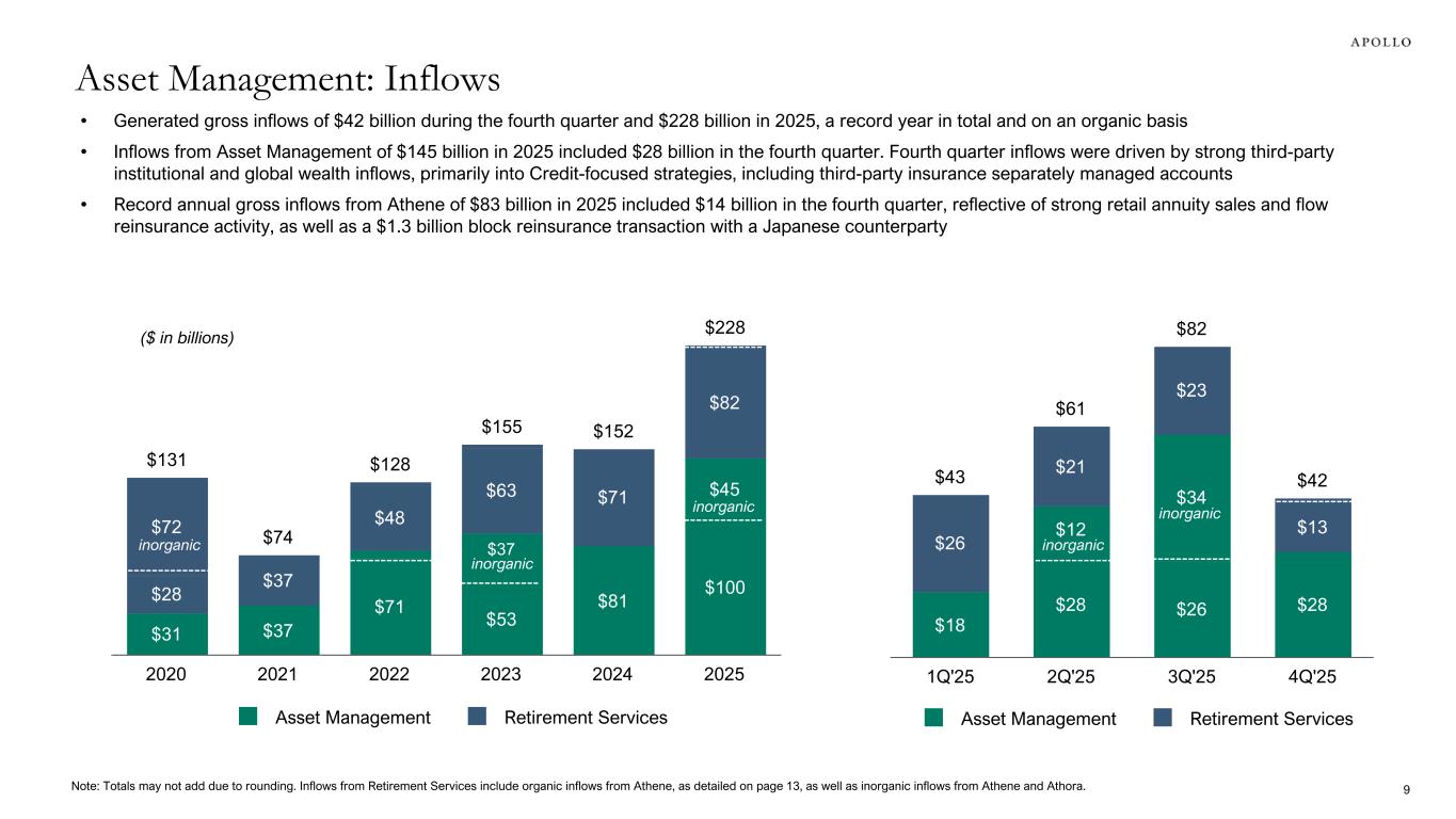 Fourth quarter results complete a year of strong organic growth and execution against 2025 targets • Record quarterly and annual FRE of $690 million and $2.5 billion, respectively, driven by strong FRE growth of 23% in 2025 • Robust quarterly and record annual SRE of $865 million and $3.4 billion, respectively, supported by strong organic growth and increased alternative investment income • Together, FRE and SRE totaled a record $1.6 billion in the fourth quarter and $5.9 billion in 2025, showcasing the strength of the combined earnings streams • Total AUM of $938 billion benefited from inflows of $42 billion in the fourth quarter and a record $228 billion in 2025, driving a 25% increase year-over-year Continued execution on three strategic growth pillars • Origination: Record quarterly origination activity of $97 billion in the fourth quarter and $309 billion in 2025 driven by significant contributions from core credit and origination platforms • Global Wealth: Strong quarterly inflows of $4 billion and record annual inflows of $18 billion in 2025 driven by sustained momentum in signature semi-liquid products and growing demand towards fixed income replacement-focused products • Capital Solutions: Record quarterly and annual capital solutions fees of $226 million in the fourth quarter and $808 million in 2025 demonstrating Apollo's differentiated and flexible capital solutions at scale across a broad range of market conditions, geographies, and sectors Strategically allocating capital to drive stockholder value • Share Repurchases: Repurchased $260 million of common stock in the fourth quarter and approximately $1.4 billion of common stock in 2025, including $313 million of opportunistic share repurchases • Dividends: Distributed more than $1 billion of common stock dividends in 2025 and intend to increase the annual amount 10% from $2.04 per share to $2.25 per share of common stock commencing with the first quarter 2026 dividend1 • Investments: Allocated approximately $180 million of strategic capital to fund various investments supporting future growth in 2025 Fourth Quarter and Full Year 2025 Business Highlights ✓ ✓ 31. The declaration and payment of any dividends are at the sole discretion of the Apollo Global Management, Inc. board of directors, which may change the dividend policy at any time, including, without limitation to, to eliminate the dividend entirely.