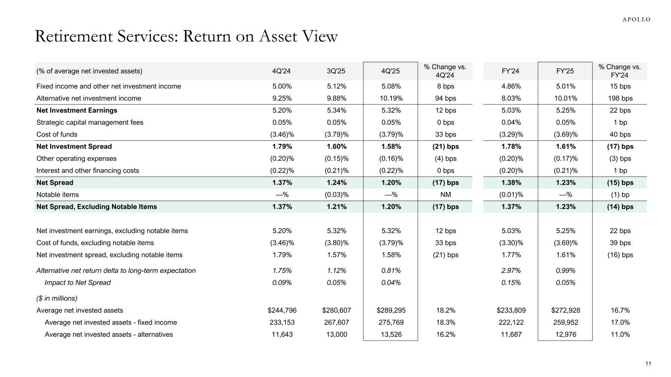 (% of average net invested assets) 4Q'24 3Q'25 4Q'25 % Change vs. 4Q'24 FY'24 FY'25 % Change vs. FY'24 Fixed income and other net investment income 5.00% 5.12% 5.08% 8 bps 4.86% 5.01% 15 bps Alternative net investment income 9.25% 9.88% 10.19% 94 bps 8.03% 10.01% 198 bps Net Investment Earnings 5.20% 5.34% 5.32% 12 bps 5.03% 5.25% 22 bps Strategic capital management fees 0.05% 0.05% 0.05% 0 bps 0.04% 0.05% 1 bp Cost of funds (3.46)% (3.79)% (3.79)% 33 bps (3.29)% (3.69)% 40 bps Net Investment Spread 1.79% 1.60% 1.58% (21) bps 1.78% 1.61% (17) bps Other operating expenses (0.20)% (0.15)% (0.16)% (4) bps (0.20)% (0.17)% (3) bps Interest and other financing costs (0.22)% (0.21)% (0.22)% 0 bps (0.20)% (0.21)% 1 bp Net Spread 1.37% 1.24% 1.20% (17) bps 1.38% 1.23% (15) bps Notable items —% (0.03)% —% NM (0.01)% —% (1) bp Net Spread, Excluding Notable Items 1.37% 1.21% 1.20% (17) bps 1.37% 1.23% (14) bps Net investment earnings, excluding notable items 5.20% 5.32% 5.32% 12 bps 5.03% 5.25% 22 bps Cost of funds, excluding notable items (3.46)% (3.80)% (3.79)% 33 bps (3.30)% (3.69)% 39 bps Net investment spread, excluding notable items 1.79% 1.57% 1.58% (21) bps 1.77% 1.61% (16) bps Alternative net return delta to long-term expectation 1.75% 1.12% 0.81% 2.97% 0.99% Impact to Net Spread 0.09% 0.05% 0.04% 0.15% 0.05% ($ in millions) Average net invested assets $244,796 $280,607 $289,295 18.2% $233,809 $272,928 16.7% Average net invested assets - fixed income 233,153 267,607 275,769 18.3% 222,122 259,952 17.0% Average net invested assets - alternatives 11,643 13,000 13,526 16.2% 11,687 12,976 11.0% Retirement Services: Return on Asset View 11