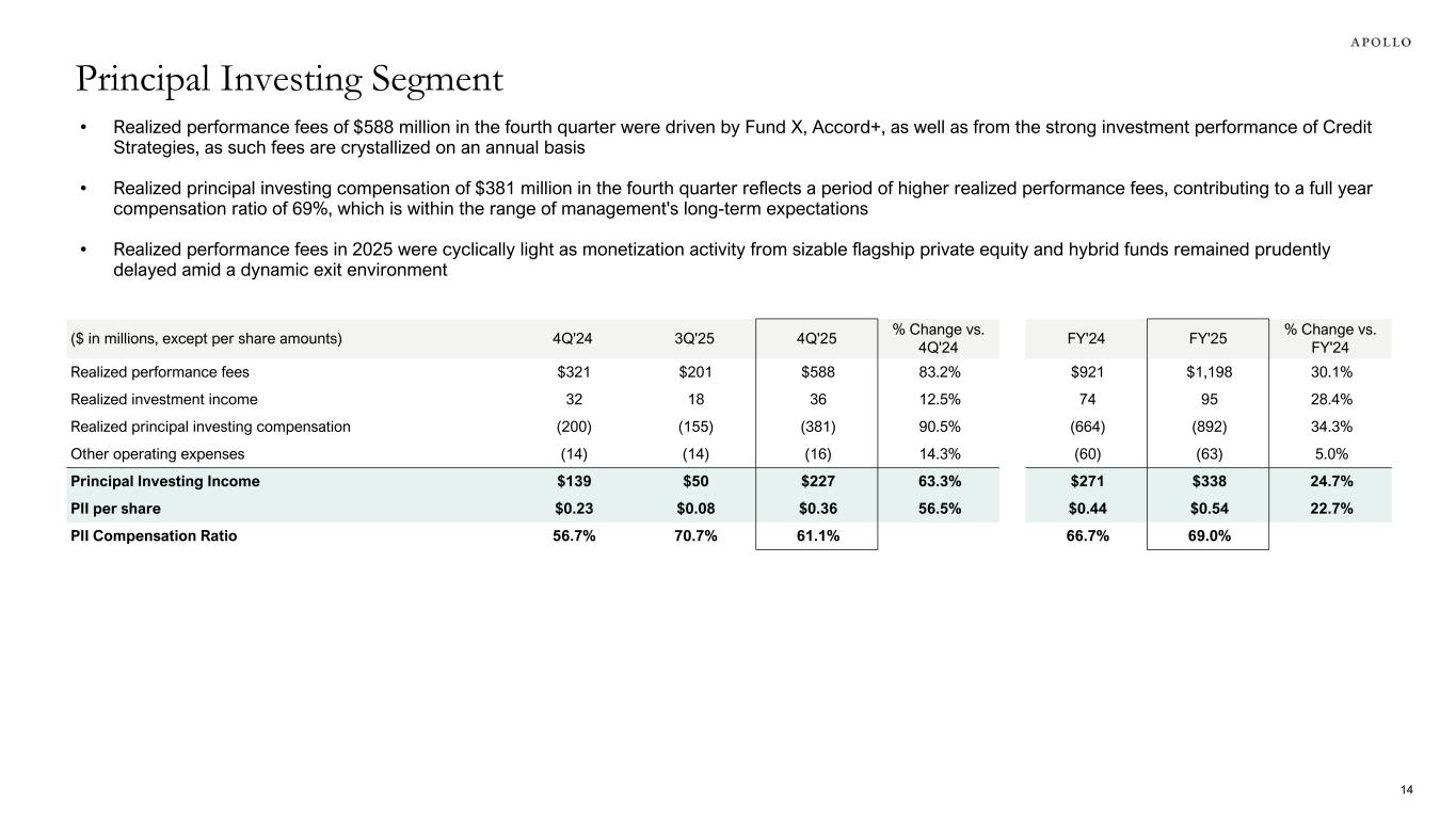 $704 $1,148 $1,255 $1,421 $1,255 $2,509 $2,469 $3,108 $3,224 $3,361 FRE SRE 2016 2017 2018 2019 2020 2021 2022 2023 2024 2025 Retail1: Strong quarterly FIA and MYGA volumes amid continued secular demand for retirement savings products through dynamic market conditions Funding Agreements2: Activity driven by FHLB and long-term repurchase agreement issuances Flow Reinsurance: Activity driven by strong volume from U.S. clients; continue to develop new products and index offerings within the APAC market Pension Group Annuities: Actively engaged and competitive in the market, closed one transaction during the quarter Other3: Solid activity for structured settlement issuances during the quarter $9 $13 $28 $48 $71 $82 5 7 8 21 36 34 4 6 6 5 11 3 6 11 8 10 29 35 2016 2018 2020 2022 2024 2025 1. Includes Fixed Indexed Annuities ("FIA"), Registered Index-Linked Annuities ("RILA"), and Multi-year Guarantee Annuities ("MYGA"), amongst others. 2. Comprised of funding agreements issued under Athene's funding agreement backed notes (“FABN”) program, secured and other funding agreements, which include Athene's funding agreement backed repurchase agreement (“FABR”) program and direct funding agreements, funding agreements issued to the Federal Home Loan Bank (“FHLB”) and long-term repurchase agreements. 3. Other inflows include guaranteed investment and group annuity contracts issued in connection with defined contribution plans as well as structured settlements. 4. For periods prior to 2022, SRE represents Athene’s historically reported adjusted operating income available to common stockholders excluding the change in fair value of Apollo Operating Group Units, equity-based compensation related to Athene’s long-term incentive plan, and operating income tax. Retirement Services: Strong Growth Profile Athene Gross Organic Inflows Spread Related Earnings4 ~9x ($ in billions) ~95% correlation between SRE and FRE growth 13 ($ in millions) 4Q'25 Highlights: