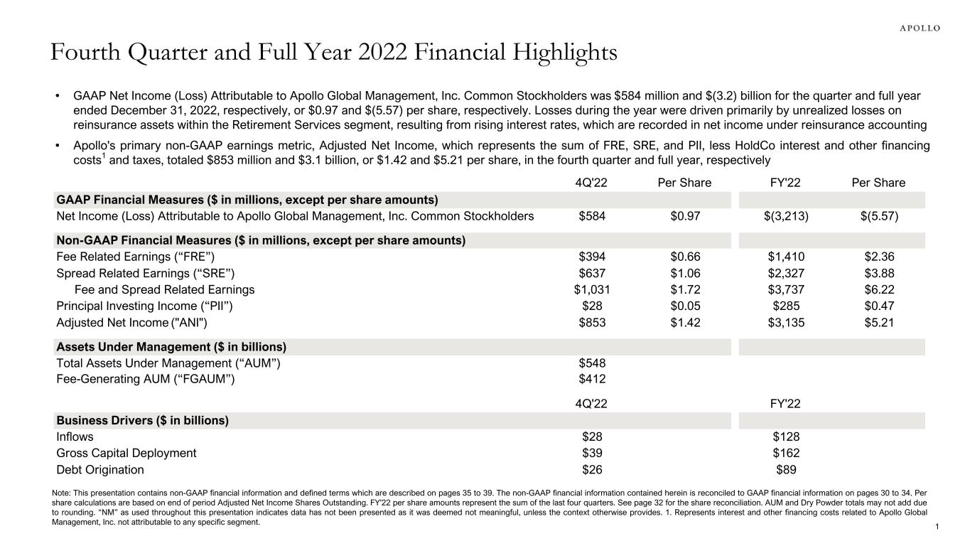 4Q'22 Per Share FY'22 Per Share GAAP Financial Measures ($ in millions, except per share amounts) Net Income (Loss) Attributable to Apollo Global Management, Inc. Common Stockholders $584 $0.97 $(3,213) $(5.57) Non-GAAP Financial Measures ($ in millions, except per share amounts) Fee Related Earnings (“FRE”) $394 $0.66 $1,410 $2.36 Spread Related Earnings (“SRE”) $637 $1.06 $2,327 $3.88 Fee and Spread Related Earnings $1,031 $1.72 $3,737 $6.22 Principal Investing Income (“PII”) $28 $0.05 $285 $0.47 Adjusted Net Income ("ANI") $853 $1.42 $3,135 $5.21 Assets Under Management ($ in billions) Total Assets Under Management (“AUM”) $548 Fee-Generating AUM (“FGAUM”) $412 4Q'22 FY'22 Business Drivers ($ in billions) Inflows $28 $128 Gross Capital Deployment $39 $162 Debt Origination $26 $89 Fourth Quarter and Full Year 2022 Financial Highlights • GAAP Net Income (Loss) Attributable to Apollo Global Management, Inc. Common Stockholders was $584 million and $(3.2) billion for the quarter and full year ended December 31, 2022, respectively, or $0.97 and $(5.57) per share, respectively. Losses during the year were driven primarily by unrealized losses on reinsurance assets within the Retirement Services segment, resulting from rising interest rates, which are recorded in net income under reinsurance accounting • Apollo's primary non-GAAP earnings metric, Adjusted Net Income, which represents the sum of FRE, SRE, and PII, less HoldCo interest and other financing costs1 and taxes, totaled $853 million and $3.1 billion, or $1.42 and $5.21 per share, in the fourth quarter and full year, respectively Note: This presentation contains non-GAAP financial information and defined terms which are described on pages 35 to 39. The non-GAAP financial information contained herein is reconciled to GAAP financial information on pages 30 to 34. Per share calculations are based on end of period Adjusted Net Income Shares Outstanding. FY'22 per share amounts represent the sum of the last four quarters. See page 32 for the share reconciliation. AUM and Dry Powder totals may not add due to rounding. “NM” as used throughout this presentation indicates data has not been presented as it was deemed not meaningful, unless the context otherwise provides. 1. Represents interest and other financing costs related to Apollo Global Management, Inc. not attributable to any specific segment. 1
