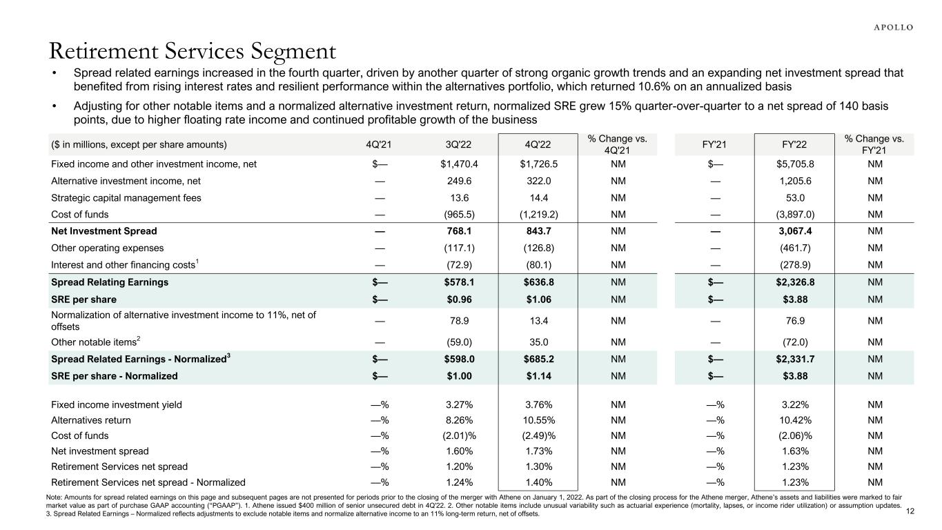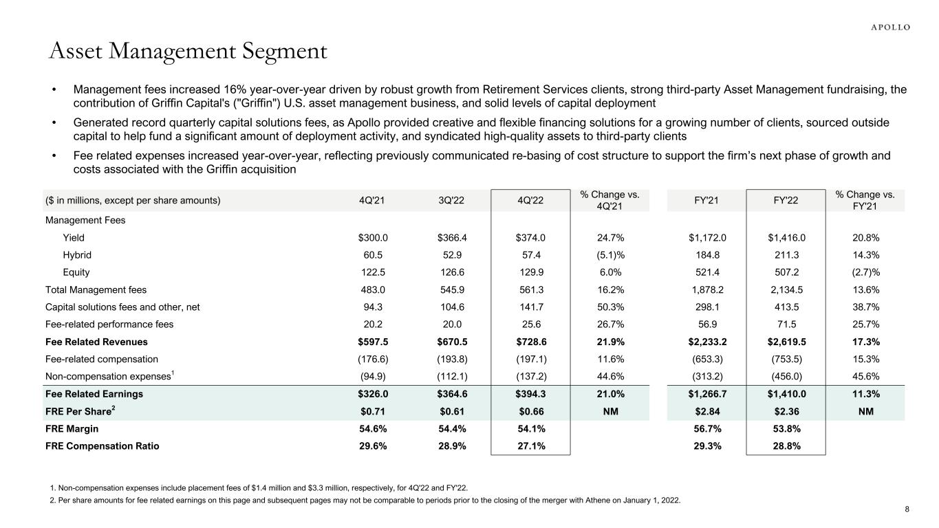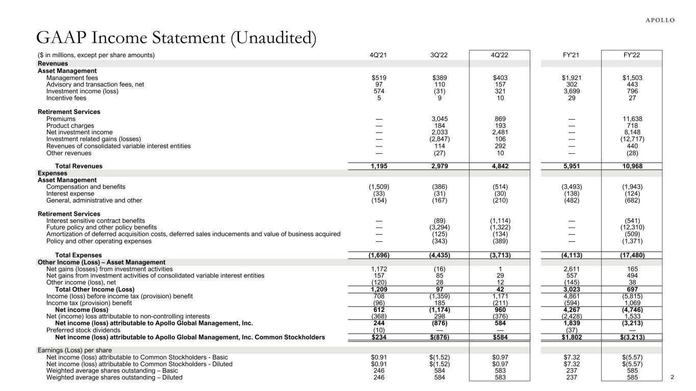 ($ in millions, except per share amounts) 4Q'21 3Q'22 4Q'22 FY'21 FY'22 Revenues Asset Management Management fees $519 $389 $403 $1,921 $1,503 Advisory and transaction fees, net 97 110 157 302 443 Investment income (loss) 574 (31) 321 3,699 796 Incentive fees 5 9 10 29 27 Retirement Services Premiums — 3,045 869 — 11,638 Product charges — 184 193 — 718 Net investment income — 2,033 2,481 — 8,148 Investment related gains (losses) — (2,847) 106 — (12,717) Revenues of consolidated variable interest entities — 114 292 — 440 Other revenues — (27) 10 — (28) Total Revenues 1,195 2,979 4,842 5,951 10,968 Expenses Asset Management Compensation and benefits (1,509) (386) (514) (3,493) (1,943) Interest expense (33) (31) (30) (138) (124) General, administrative and other (154) (167) (210) (482) (682) Retirement Services Interest sensitive contract benefits — (89) (1,114) — (541) Future policy and other policy benefits — (3,294) (1,322) — (12,310) Amortization of deferred acquisition costs, deferred sales inducements and value of business acquired — (125) (134) — (509) Policy and other operating expenses — (343) (389) — (1,371) Total Expenses (1,696) (4,435) (3,713) (4,113) (17,480) Other Income (Loss) – Asset Management Net gains (losses) from investment activities 1,172 (16) 1 2,611 165 Net gains from investment activities of consolidated variable interest entities 157 85 29 557 494 Other income (loss), net (120) 28 12 (145) 38 Total Other Income (Loss) 1,209 97 42 3,023 697 Income (loss) before income tax (provision) benefit 708 (1,359) 1,171 4,861 (5,815) Income tax (provision) benefit (96) 185 (211) (594) 1,069 Net income (loss) 612 (1,174) 960 4,267 (4,746) Net (income) loss attributable to non-controlling interests (368) 298 (376) (2,428) 1,533 Net income (loss) attributable to Apollo Global Management, Inc. 244 (876) 584 1,839 (3,213) Preferred stock dividends (10) — — (37) — Net income (loss) attributable to Apollo Global Management, Inc. Common Stockholders $234 $(876) $584 $1,802 $(3,213) Earnings (Loss) per share Net income (loss) attributable to Common Stockholders - Basic $0.91 $(1.52) $0.97 $7.32 $(5.57) Net income (loss) attributable to Common Stockholders - Diluted $0.91 $(1.52) $0.97 $7.32 $(5.57) Weighted average shares outstanding – Basic 246 584 583 237 585 Weighted average shares outstanding – Diluted 246 584 583 237 585 GAAP Income Statement (Unaudited) 2