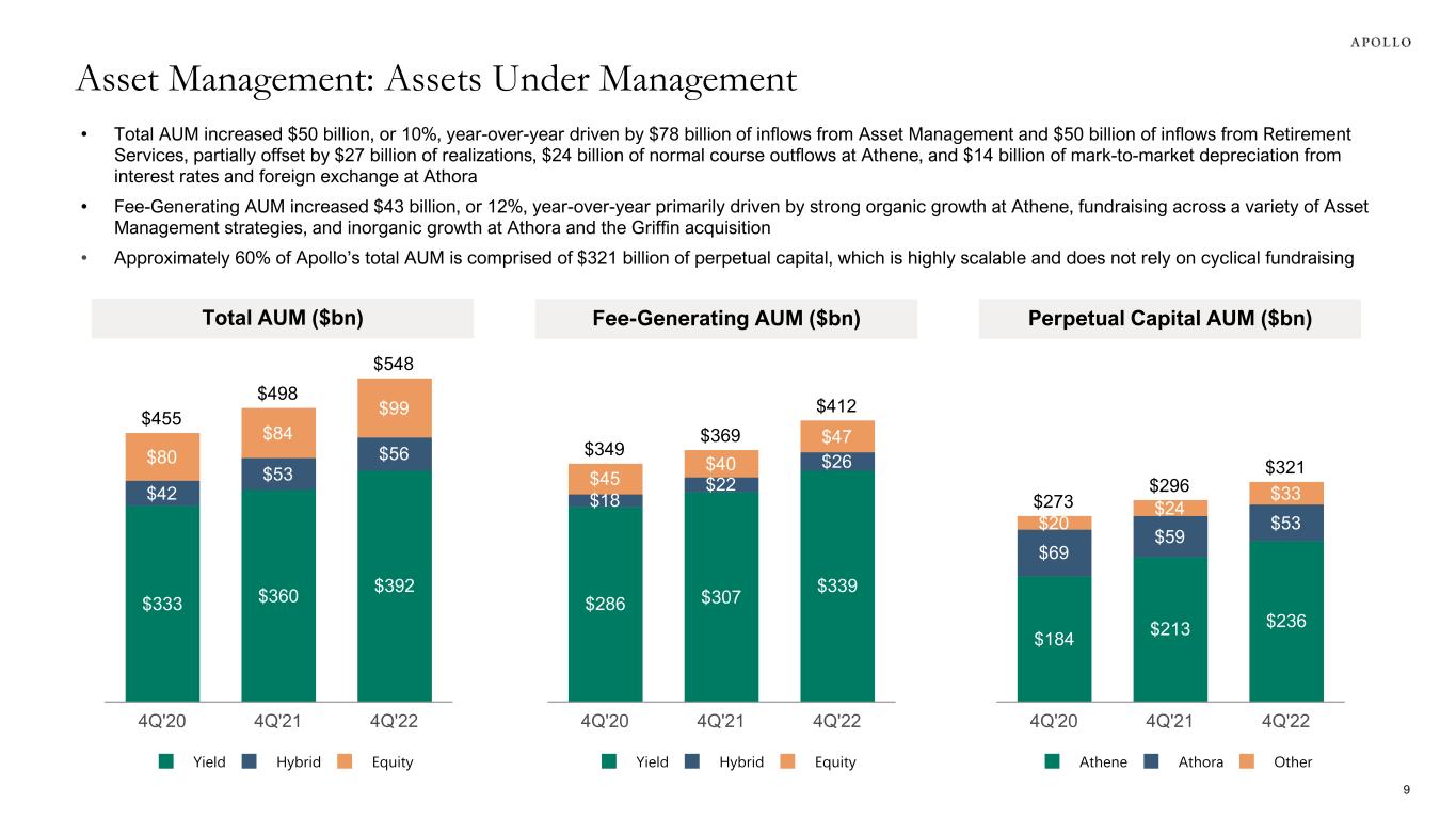 ($ in millions, except per share amounts) 4Q'21 3Q'22 4Q'22 % Change vs. 4Q'21 FY'21 FY'22 % Change vs. FY'21 Management Fees Yield $300.0 $366.4 $374.0 24.7% $1,172.0 $1,416.0 20.8% Hybrid 60.5 52.9 57.4 (5.1)% 184.8 211.3 14.3% Equity 122.5 126.6 129.9 6.0% 521.4 507.2 (2.7)% Total Management fees 483.0 545.9 561.3 16.2% 1,878.2 2,134.5 13.6% Capital solutions fees and other, net 94.3 104.6 141.7 50.3% 298.1 413.5 38.7% Fee-related performance fees 20.2 20.0 25.6 26.7% 56.9 71.5 25.7% Fee Related Revenues $597.5 $670.5 $728.6 21.9% $2,233.2 $2,619.5 17.3% Fee-related compensation (176.6) (193.8) (197.1) 11.6% (653.3) (753.5) 15.3% Non-compensation expenses1 (94.9) (112.1) (137.2) 44.6% (313.2) (456.0) 45.6% Fee Related Earnings $326.0 $364.6 $394.3 21.0% $1,266.7 $1,410.0 11.3% FRE Per Share2 $0.71 $0.61 $0.66 NM $2.84 $2.36 NM FRE Margin 54.6% 54.4% 54.1% 56.7% 53.8% FRE Compensation Ratio 29.6% 28.9% 27.1% 29.3% 28.8% • Management fees increased 16% year-over-year driven by robust growth from Retirement Services clients, strong third-party Asset Management fundraising, the contribution of Griffin Capital's ("Griffin") U.S. asset management business, and solid levels of capital deployment • Generated record quarterly capital solutions fees, as Apollo provided creative and flexible financing solutions for a growing number of clients, sourced outside capital to help fund a significant amount of deployment activity, and syndicated high-quality assets to third-party clients • Fee related expenses increased year-over-year, reflecting previously communicated re-basing of cost structure to support the firm’s next phase of growth and costs associated with the Griffin acquisition Asset Management Segment 1. Non-compensation expenses include placement fees of $1.4 million and $3.3 million, respectively, for 4Q'22 and FY'22. 2. Per share amounts for fee related earnings on this page and subsequent pages may not be comparable to periods prior to the closing of the merger with Athene on January 1, 2022. 8