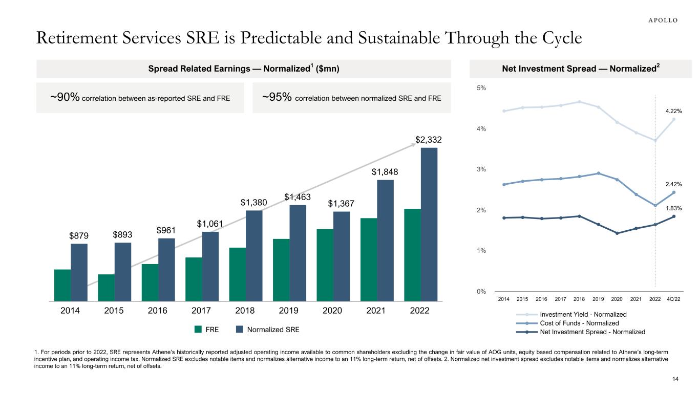 $3 $9 $4 $12 $13 $18 $28 $37 $48 3 3 5 6 7 7 8 9 21 1 4 1 2 4 6 2 6 2 3 6 6 14 11 3 1 8 12 10 Retail Annuities Flow Reinsurance Pension Group Annuities Funding Agreements 2014 2015 2016 2017 2018 2019 2020 2021 2022 ~16x • Gross organic inflows reached an annual record of $48 billion in 2022, including $11 billion of inflows in the fourth quarter • Robust inflows have been driven by the strength of Athene's diversified organic channels, which maintain leading market share positions within the retirement services landscape Inflow Highlights: Retail: Record annual inflows driven by three consecutive quarters of record annuity sales, driven by strong demand for high-yielding products with principal protection and ongoing distribution expansion Flow Reinsurance: Robust full year volume including a strong fourth quarter, supported by record retail annuity issuance across the industry in 2022 Pension Group Annuities: Executed 10 transactions in 2022, weighted towards the second and third quarters, as corporate pension plan sponsors took advantage of favorable funded status Funding Agreements1: Solid issuance on a full year basis despite challenging market conditions for most of 2022 ($ in billions) 1. Funding agreements are comprised of funding agreements issued under funding agreement backed notes (“FABN”) and funding agreement backed repurchase agreements (“FABR”) programs, funding agreements issued to the Federal Home Loan Bank (“FHLB”) and long term repurchase agreements. 13 Retirement Services: Athene Inflows