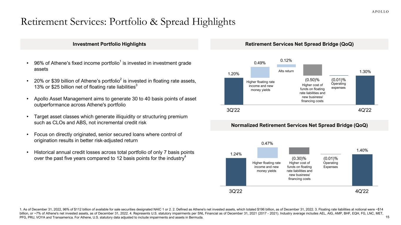 Spread Related Earnings — Normalized1 ($mn) Net Investment Spread — Normalized2 4.22% 2.42% 1.83% Investment Yield - Normalized Cost of Funds - Normalized Net Investment Spread - Normalized 2014 2015 2016 2017 2018 2019 2020 2021 2022 4Q'22 0% 1% 2% 3% 4% 5% ~90% correlation between as-reported SRE and FRE ~95% correlation between normalized SRE and FRE Retirement Services SRE is Predictable and Sustainable Through the Cycle 1. For periods prior to 2022, SRE represents Athene’s historically reported adjusted operating income available to common shareholders excluding the change in fair value of AOG units, equity based compensation related to Athene’s long-term incentive plan, and operating income tax. Normalized SRE excludes notable items and normalizes alternative income to an 11% long-term return, net of offsets. 2. Normalized net investment spread excludes notable items and normalizes alternative income to an 11% long-term return, net of offsets. 14 $879 $893 $961 $1,061 $1,380 $1,463 $1,367 $1,848 $2,332 FRE Normalized SRE 2014 2015 2016 2017 2018 2019 2020 2021 2022