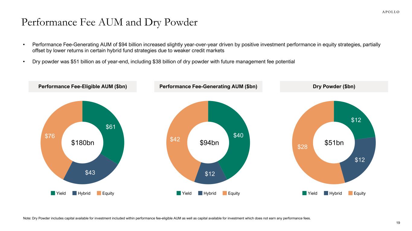 • “Assets Under Management”, or “AUM”, refers to the assets of the funds, partnerships and accounts to which Apollo provides investment management, advisory, or certain other investment-related services, including, without limitation, capital that such funds, partnerships and accounts have the right to call from investors pursuant to capital commitments. AUM equals the sum of: 1. the net asset value (“NAV”), plus used or available leverage and/or capital commitments, or gross assets plus capital commitments, of the yield and certain hybrid funds, partnerships and accounts for which we provide investment management or advisory services, other than certain collateralized loan obligations (“CLOs”), collateralized debt obligations (“CDOs”), and certain perpetual capital vehicles, which have a fee-generating basis other than the mark-to-market value of the underlying assets; for certain perpetual capital vehicles in yield, gross asset value plus available financing capacity; 2. the fair value of the investments of equity and certain hybrid funds, partnerships and accounts Apollo manages or advise, plus the capital that such funds, partnerships and accounts are entitled to call from investors pursuant to capital commitments, plus portfolio level financings; 3. the gross asset value associated with the reinsurance investments of the portfolio company assets Apollo manages or advises; and 4. the fair value of any other assets that Apollo manages or advises for the funds, partnerships and accounts to which Apollo provides investment management, advisory, or certain other investment-related services, plus unused credit facilities, including capital commitments to such funds, partnerships and accounts for investments that may require pre-qualification or other conditions before investment plus any other capital commitments to such funds, partnerships and accounts available for investment that are not otherwise included in the clauses above. Apollo’s AUM measure includes Assets Under Management for which Apollo charges either nominal or zero fees. Apollo’s AUM measure also includes assets for which Apollo does not have investment discretion, including certain assets for which Apollo earns only investment-related service fees, rather than management or advisory fees. Apollo’s definition of AUM is not based on any definition of Assets Under Management contained in its governing documents or in any Apollo Fund management agreements. Apollo considers multiple factors for determining what should be included in its definition of AUM. Such factors include but are not limited to (1) Apollo’s ability to influence the investment decisions for existing and available assets; (2) Apollo’s ability to generate income from the underlying assets in its funds; and (3) the AUM measures that Apollo uses internally or believe are used by other investment managers. Given the differences in the investment strategies and structures among other alternative investment managers, Apollo’s calculation of AUM may differ from the calculations employed by other investment managers and, as a result, this measure may not be directly comparable to similar measures presented by other investment managers. Apollo’s calculation also differs from the manner in which its affiliates registered with the SEC report “Regulatory Assets Under Management” on Form ADV and Form PF in various ways. Apollo uses AUM, Gross capital deployed and Dry powder as performance measurements of its investment activities, as well as to monitor fund size in relation to professional resource and infrastructure needs. • “Fee-Generating AUM” or “FGAUM” consists of assets of the funds, partnerships and accounts to which we provide investment management, advisory, or certain other investment-related services and on which we earn management fees, monitoring fees or other investment-related fees pursuant to management or other fee agreements on a basis that varies among the Apollo funds, partnerships and accounts. Management fees are normally based on “net asset value,” “gross assets,” “adjusted par asset value,” “adjusted cost of all unrealized portfolio investments,” “capital commitments,” “adjusted assets,” “stockholders’ equity,” “invested capital” or “capital contributions,” each as defined in the applicable management agreement. Monitoring fees, also referred to as advisory fees, with respect to the structured portfolio company investments of the funds, partnerships and accounts we manage or advise, are generally based on the total value of such structured portfolio company investments, which normally includes leverage, less any portion of such total value that is already considered in Fee-Generating AUM. • “Performance Fee-Eligible AUM” or “PFEAUM” refers to the AUM that may eventually produce performance fees. All funds for which we are entitled to receive a performance fee allocation or incentive fee are included in Performance Fee-Eligible AUM, which consists of the following: • “Performance Fee-Generating AUM”, which refers to invested capital of the funds, partnerships and accounts we manage, advise, or to which we provide certain other investment-related services, that is currently above its hurdle rate or preferred return, and profit of such funds, partnerships and accounts is being allocated to, or earned by, the general partner in accordance with the applicable limited partnership agreements or other governing agreements; • “AUM Not Currently Generating Performance Fees”, which refers to invested capital of the funds, partnerships and accounts we manage, advise, or to which we provide certain other investment-related services that is currently below its hurdle rate or preferred return; and • “Uninvested Performance Fee-Eligible AUM”, which refers to capital of the funds, partnerships and accounts we manage, advise, or to which we provide ce