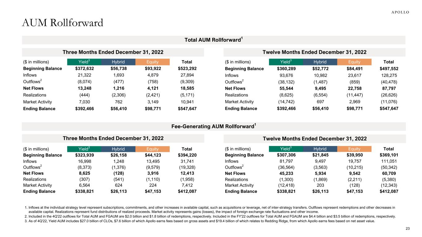 ($ in millions) Yield3 Hybrid Equity Total Beginning Balance $372,632 $56,738 $93,922 $523,292 Inflows 21,322 1,693 4,879 27,894 Outflows2 (8,074) (477) (758) (9,309) Net Flows 13,248 1,216 4,121 18,585 Realizations (444) (2,306) (2,421) (5,171) Market Activity 7,030 762 3,149 10,941 Ending Balance $392,466 $56,410 $98,771 $547,647 Three Months Ended December 31, 2022 ($ in millions) Yield3 Hybrid Equity Total Beginning Balance $360,289 $52,772 $84,491 $497,552 Inflows 93,676 10,982 23,617 128,275 Outflows2 (38,132) (1,487) (859) (40,478) Net Flows 55,544 9,495 22,758 87,797 Realizations (8,625) (6,554) (11,447) (26,626) Market Activity (14,742) 697 2,969 (11,076) Ending Balance $392,466 $56,410 $98,771 $547,647 Twelve Months Ended December 31, 2022 ($ in millions) Yield3 Hybrid Equity Total Beginning Balance $323,939 $26,158 $44,123 $394,220 Inflows 16,998 1,248 13,495 31,741 Outflows2 (8,373) (1,376) (9,579) (19,328) Net Flows 8,625 (128) 3,916 12,413 Realizations (307) (541) (1,110) (1,958) Market Activity 6,564 624 224 7,412 Ending Balance $338,821 $26,113 $47,153 $412,087 Three Months Ended December 31, 2022 ($ in millions) Yield3 Hybrid Equity Total Beginning Balance $307,306 $21,845 $39,950 $369,101 Inflows 81,797 9,497 19,757 111,051 Outflows2 (36,564) (3,563) (10,215) (50,342) Net Flows 45,233 5,934 9,542 60,709 Realizations (1,300) (1,869) (2,211) (5,380) Market Activity (12,418) 203 (128) (12,343) Ending Balance $338,821 $26,113 $47,153 $412,087 Twelve Months Ended December 31, 2022 Fee-Generating AUM Rollforward1 Total AUM Rollforward1 1. Inflows at the individual strategy level represent subscriptions, commitments, and other increases in available capital, such as acquisitions or leverage, net of inter-strategy transfers. Outflows represent redemptions and other decreases in available capital. Realizations represent fund distributions of realized proceeds. Market activity represents gains (losses), the impact of foreign exchange rate fluctuations and other income. 2. Included in the 4Q'22 outflows for Total AUM and FGAUM are $2.0 billion and $1.8 billion of redemptions, respectively. Included in the FY'22 outflows for Total AUM and FGAUM are $4.4 billion and $3.5 billion of redemptions, respectively. 3. As of 4Q'22, Yield AUM includes $27.0 billion of CLOs, $7.6 billion of which Apollo earns fees based on gross assets and $19.4 billion of which relates to Redding Ridge, from which Apollo earns fees based on net asset value. AUM Rollforward 23