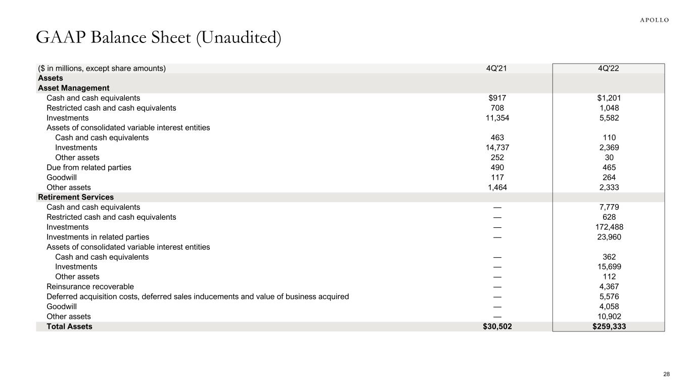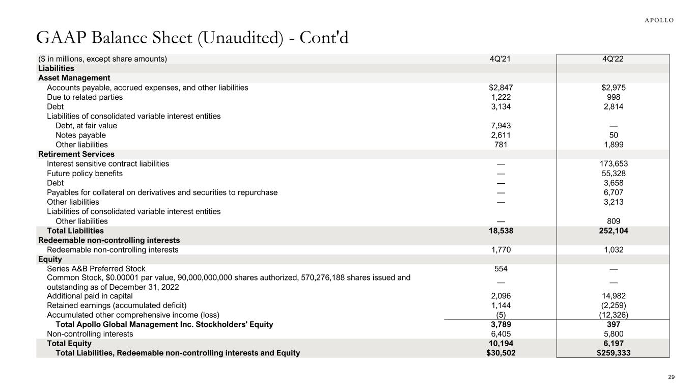 ($ in millions, except share amounts) 4Q'21 4Q'22 Assets Asset Management Cash and cash equivalents $917 $1,201 Restricted cash and cash equivalents 708 1,048 Investments 11,354 5,582 Assets of consolidated variable interest entities Cash and cash equivalents 463 110 Investments 14,737 2,369 Other assets 252 30 Due from related parties 490 465 Goodwill 117 264 Other assets 1,464 2,333 Retirement Services Cash and cash equivalents — 7,779 Restricted cash and cash equivalents — 628 Investments — 172,488 Investments in related parties — 23,960 Assets of consolidated variable interest entities Cash and cash equivalents — 362 Investments — 15,699 Other assets — 112 Reinsurance recoverable — 4,367 Deferred acquisition costs, deferred sales inducements and value of business acquired — 5,576 Goodwill — 4,058 Other assets — 10,902 Total Assets $30,502 $259,333 GAAP Balance Sheet (Unaudited) 28