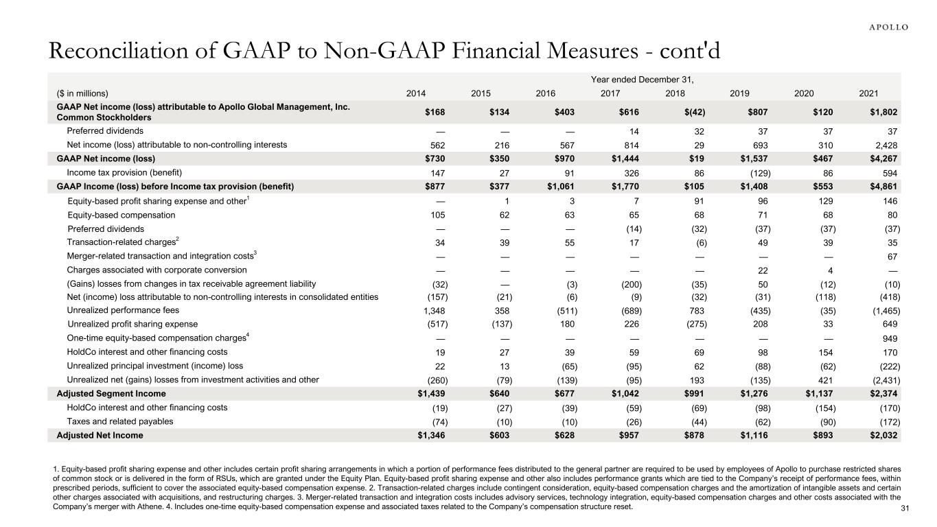 ($ in millions) 4Q'21 1Q'22 2Q'22 3Q'22 4Q'22 FY'21 FY'22 GAAP Net income (loss) attributable to Apollo Global Management, Inc. Common Stockholders $234 $(870) $(2,051) $(876) $584 $1,802 $(3,213) Preferred dividends 10 — — — — 37 — Net income (loss) attributable to non-controlling interests 368 (660) (951) (298) 376 2,428 (1,533) GAAP Net income (loss) $612 $(1,530) $(3,002) $(1,174) $960 $4,267 $(4,746) Income tax provision (benefit) 96 (608) (487) (185) 211 594 (1,069) GAAP Income (loss) before Income tax provision (benefit) $708 $(2,138) $(3,489) $(1,359) $1,171 $4,861 $(5,815) Asset Management Adjustments: Equity-based profit sharing expense and other1 52 97 67 55 57 146 276 Equity-based compensation 25 56 37 46 46 80 185 Preferred dividends (10) — — — — (37) — Transaction-related charges2 8 (1) — (5) (36) 35 (42) Merger-related transaction and integration costs3 28 18 18 14 20 67 70 (Gains) losses from changes in tax receivable agreement liability (8) 14 — — 12 (10) 26 Net (income) loss attributable to non-controlling interests in consolidated entities (118) 651 903 328 (396) (418) 1,486 Unrealized performance fees (54) (445) 488 66 (111) (1,465) (2) Unrealized profit sharing expense 3 191 (188) (19) 36 649 20 One-time equity-based compensation charges4 949 — — — — 949 — HoldCo interest and other financing costs 42 39 35 29 19 170 122 Unrealized principal investment (income) loss (68) 82 (72) 128 38 (222) 176 Unrealized net (gains) losses from investment activities and other (1,040) (18) (105) (15) (10) (2,431) (148) Retirement Services Adjustments: Investment (gains) losses, net of offsets — 2,494 2,682 1,737 111 — 7,024 Non-operating change in insurance liabilities and related derivatives, net of offsets — 81 381 (64) 56 — 454 Integration, restructuring and other non-operating expenses — 34 33 37 29 — 133 Equity-based compensation expense — 12 13 15 16 — 56 Adjusted Segment Income $517 $1,167 $803 $993 $1,058 $2,374 $4,021 HoldCo interest and other financing costs (42) (39) (35) (29) (19) (170) (122) Taxes and related payables 8 (213) (202) (163) (186) (172) (764) Adjusted Net Income $483 $915 $566 $801 $853 $2,032 $3,135 Normalization of alternative investment income to 11%, net of offsets — (143) 128 79 13 — 77 Other notable items — (39) (35) (59) 35 — (72) Tax impact of normalization and other notable items — 38 (19) (5) (10) — (1) Adjusted Net Income - Normalized $483 $771 $640 $816 $891 $2,032 $3,139 1. Equity-based profit sharing expense and other includes certain profit sharing arrangements in which a portion of performance fees distributed to the general partner are required to be used by employees of Apollo to purchase restricted shares of common stock or is delivered in the form of RSUs, which are granted under the Equity Plan. Equity-based profit sharing expense and other also includes performance grants which are tied to the Company’s receipt of performance fees, within prescribed periods, sufficient to cover the associated equity-based compensation expense. 2. Transaction-related charges include contingent consideration, equity-based compensation charges and the amortization of intangible assets and certain other charges associated with acquisitions, and restructuring charges. 3. Merger-related transaction and integration costs includes advisory services, technology integration, equity-based compensation charges and other costs associated with the Company’s merger with Athene. 4. Includes one-time equity-based compensation expense and associated taxes related to the Company’s compensation structure reset. Reconciliation of GAAP to Non-GAAP Financial Measures 30