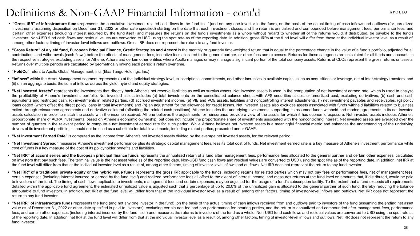 • "Gross IRR" of infrastructure funds represents the cumulative investment-related cash flows in the fund itself (and not any one investor in the fund), on the basis of the actual timing of cash inflows and outflows (for unrealized investments assuming disposition on December 31, 2022 or other date specified) starting on the date that each investment closes, and the return is annualized and compounded before management fees, performance fees, and certain other expenses (including interest incurred by the fund itself) and measures the returns on the fund’s investments as a whole without regard to whether all of the returns would, if distributed, be payable to the fund’s investors. Non-USD fund cash flows and residual values are converted to USD using the spot rate as of the reporting date. In addition, gross IRRs at the fund level will differ from those at the individual investor level as a result of, among other factors, timing of investor-level inflows and outflows. Gross IRR does not represent the return to any fund investor. • “Gross Return” of a yield fund, European Principal Finance, Credit Strategies and Accord is the monthly or quarterly time-weighted return that is equal to the percentage change in the value of a fund’s portfolio, adjusted for all contributions and withdrawals (cash flows) before the effects of management fees, incentive fees allocated to the general partner, or other fees and expenses. Returns for these categories are calculated for all funds and accounts in the respective strategies excluding assets for Athene, Athora and certain other entities where Apollo manages or may manage a significant portion of the total company assets. Returns of CLOs represent the gross returns on assets. Returns over multiple periods are calculated by geometrically linking each period’s return over time. • “HoldCo” refers to Apollo Global Management, Inc. (f/k/a Tango Holdings, Inc.) • “Inflows” within the Asset Management segment represents (i) at the individual strategy level, subscriptions, commitments, and other increases in available capital, such as acquisitions or leverage, net of inter-strategy transfers, and (ii) on an aggregate basis, the sum of inflows across the yield, hybrid and equity strategies. • “Net Invested Assets” represents the investments that directly back Athene's net reserve liabilities as well as surplus assets. Net invested assets is used in the computation of net investment earned rate, which is used to analyze the profitability of Athene’s investment portfolio. Net invested assets includes (a) total investments on the consolidated balance sheets with AFS securities at cost or amortized cost, excluding derivatives, (b) cash and cash equivalents and restricted cash, (c) investments in related parties, (d) accrued investment income, (e) VIE and VOE assets, liabilities and noncontrolling interest adjustments, (f) net investment payables and receivables, (g) policy loans ceded (which offset the direct policy loans in total investments) and (h) an adjustment for the allowance for credit losses. Net invested assets also excludes assets associated with funds withheld liabilities related to business exited through reinsurance agreements and derivative collateral (offsetting the related cash positions). Athene includes the underlying investments supporting its assumed funds withheld and modco agreements in its net invested assets calculation in order to match the assets with the income received. Athene believes the adjustments for reinsurance provide a view of the assets for which it has economic exposure. Net invested assets includes Athene’s proportionate share of ACRA investments, based on Athene’s economic ownership, but does not include the proportionate share of investments associated with the noncontrolling interest. Net invested assets are averaged over the number of quarters in the relevant period to compute a net investment earned rate for such period. While Athene believes net invested assets is a meaningful financial metric and enhances the understanding of the underlying drivers of its investment portfolio, it should not be used as a substitute for total investments, including related parties, presented under GAAP. • “Net Investment Earned Rate” is computed as the income from Athene's net invested assets divided by the average net invested assets, for the relevant period. • “Net Investment Spread” measures Athene's investment performance plus its strategic capital management fees, less its total cost of funds. Net investment earned rate is a key measure of Athene's investment performance while cost of funds is a key measure of the cost of its policyholder benefits and liabilities. • "Net IRR" of accord series and the European principal finance funds represents the annualized return of a fund after management fees, performance fees allocated to the general partner and certain other expenses, calculated on investors that pay such fees. The terminal value is the net asset value as of the reporting date. Non-USD fund cash flows and residual values are converted to USD using the spot rate as of the reporting date. In addition, net IRR at the fund level will differ from that at the individual investor level as a result of, among other factors, timing of investor-level inflows and outflows. Net IRR does not represent the return to any fund investor. • "Net IRR" of a traditional private equity or the hybrid value funds represents the gross IRR applicable to the funds, including returns for related parties which may not pay fees or performance fees, net of management fees, certain expenses (including interest incurred or earned by the fund itself) and realized performance fees all offset to the extent of interest income, and measures returns at the fund level on amounts that, if distributed, would be paid to investors of the fund. The timing of cash flows applicable to investments, management fees and cer