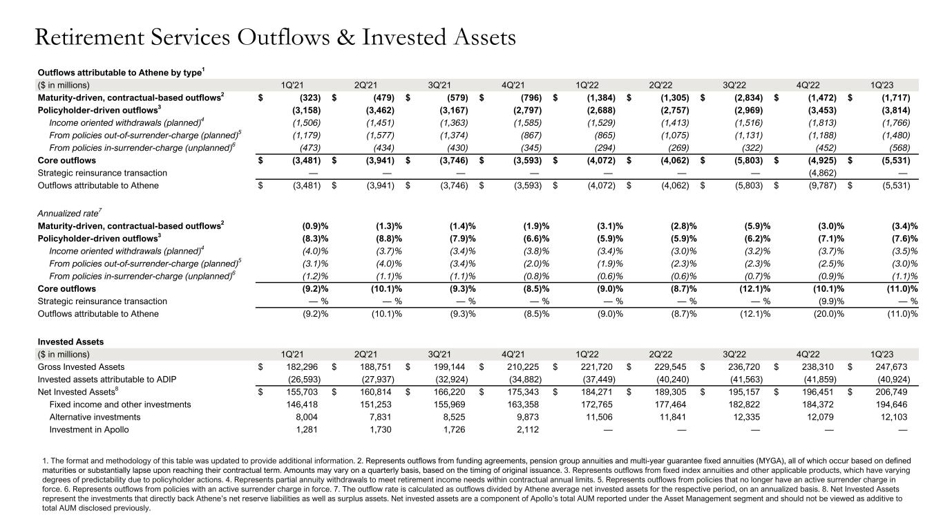 Outflows attributable to Athene by type1 ($ in millions) 1Q'21 2Q'21 3Q'21 4Q'21 1Q'22 2Q'22 3Q'22 4Q'22 1Q'23 Maturity-driven, contractual-based outflows2 $ (323) $ (479) $ (579) $ (796) $ (1,384) $ (1,305) $ (2,834) $ (1,472) $ (1,717) Policyholder-driven outflows3 (3,158) (3,462) (3,167) (2,797) (2,688) (2,757) (2,969) (3,453) (3,814) Income oriented withdrawals (planned)4 (1,506) (1,451) (1,363) (1,585) (1,529) (1,413) (1,516) (1,813) (1,766) From policies out-of-surrender-charge (planned)5 (1,179) (1,577) (1,374) (867) (865) (1,075) (1,131) (1,188) (1,480) From policies in-surrender-charge (unplanned)6 (473) (434) (430) (345) (294) (269) (322) (452) (568) Core outflows $ (3,481) $ (3,941) $ (3,746) $ (3,593) $ (4,072) $ (4,062) $ (5,803) $ (4,925) $ (5,531) Strategic reinsurance transaction — — — — — — — (4,862) — Outflows attributable to Athene $ (3,481) $ (3,941) $ (3,746) $ (3,593) $ (4,072) $ (4,062) $ (5,803) $ (9,787) $ (5,531) Annualized rate7 Maturity-driven, contractual-based outflows2 (0.9) % (1.3) % (1.4) % (1.9) % (3.1) % (2.8) % (5.9) % (3.0) % (3.4) % Policyholder-driven outflows3 (8.3) % (8.8) % (7.9) % (6.6) % (5.9) % (5.9) % (6.2) % (7.1) % (7.6) % Income oriented withdrawals (planned)4 (4.0) % (3.7) % (3.4) % (3.8) % (3.4) % (3.0) % (3.2) % (3.7) % (3.5) % From policies out-of-surrender-charge (planned)5 (3.1) % (4.0) % (3.4) % (2.0) % (1.9) % (2.3) % (2.3) % (2.5) % (3.0) % From policies in-surrender-charge (unplanned)6 (1.2) % (1.1) % (1.1) % (0.8) % (0.6) % (0.6) % (0.7) % (0.9) % (1.1) % Core outflows (9.2) % (10.1) % (9.3) % (8.5) % (9.0) % (8.7) % (12.1) % (10.1) % (11.0) % Strategic reinsurance transaction — % — % — % — % — % — % — % (9.9) % — % Outflows attributable to Athene (9.2) % (10.1) % (9.3) % (8.5) % (9.0) % (8.7) % (12.1) % (20.0) % (11.0) % Invested Assets ($ in millions) 1Q'21 2Q'21 3Q'21 4Q'21 1Q'22 2Q'22 3Q'22 4Q'22 1Q'23 Gross Invested Assets $ 182,296 $ 188,751 $ 199,144 $ 210,225 $ 221,720 $ 229,545 $ 236,720 $ 238,310 $ 247,673 Invested assets attributable to ADIP (26,593) (27,937) (32,924) (34,882) (37,449) (40,240) (41,563) (41,859) (40,924) Net Invested Assets8 $ 155,703 $ 160,814 $ 166,220 $ 175,343 $ 184,271 $ 189,305 $ 195,157 $ 196,451 $ 206,749 Fixed income and other investments 146,418 151,253 155,969 163,358 172,765 177,464 182,822 184,372 194,646 Alternative investments 8,004 7,831 8,525 9,873 11,506 11,841 12,335 12,079 12,103 Investment in Apollo 1,281 1,730 1,726 2,112 — — — — — 1. The format and methodology of this table was updated to provide additional information. 2. Represents outflows from funding agreements, pension group annuities and multi-year guarantee fixed annuities (MYGA), all of which occur based on defined maturities or substantially lapse upon reaching their contractual term. Amounts may vary on a quarterly basis, based on the timing of original issuance. 3. Represents outflows from fixed index annuities and other applicable products, which have varying degrees of predictability due to policyholder actions. 4. Represents partial annuity withdrawals to meet retirement income needs within contractual annual limits. 5. Represents outflows from policies that no longer have an active surrender charge in force. 6. Represents outflows from policies with an active surrender charge in force. 7. The outflow rate is calculated as outflows divided by Athene average net invested assets for the respective period, on an annualized basis. 8. Net Invested Assets represent the investments that directly back Athene’s net reserve liabilities as well as surplus assets. Net invested assets are a component of Apollo’s total AUM reported under the Asset Management segment and should not be viewed as additive to total AUM disclosed previously. Retirement Services Outflows & Invested Assets