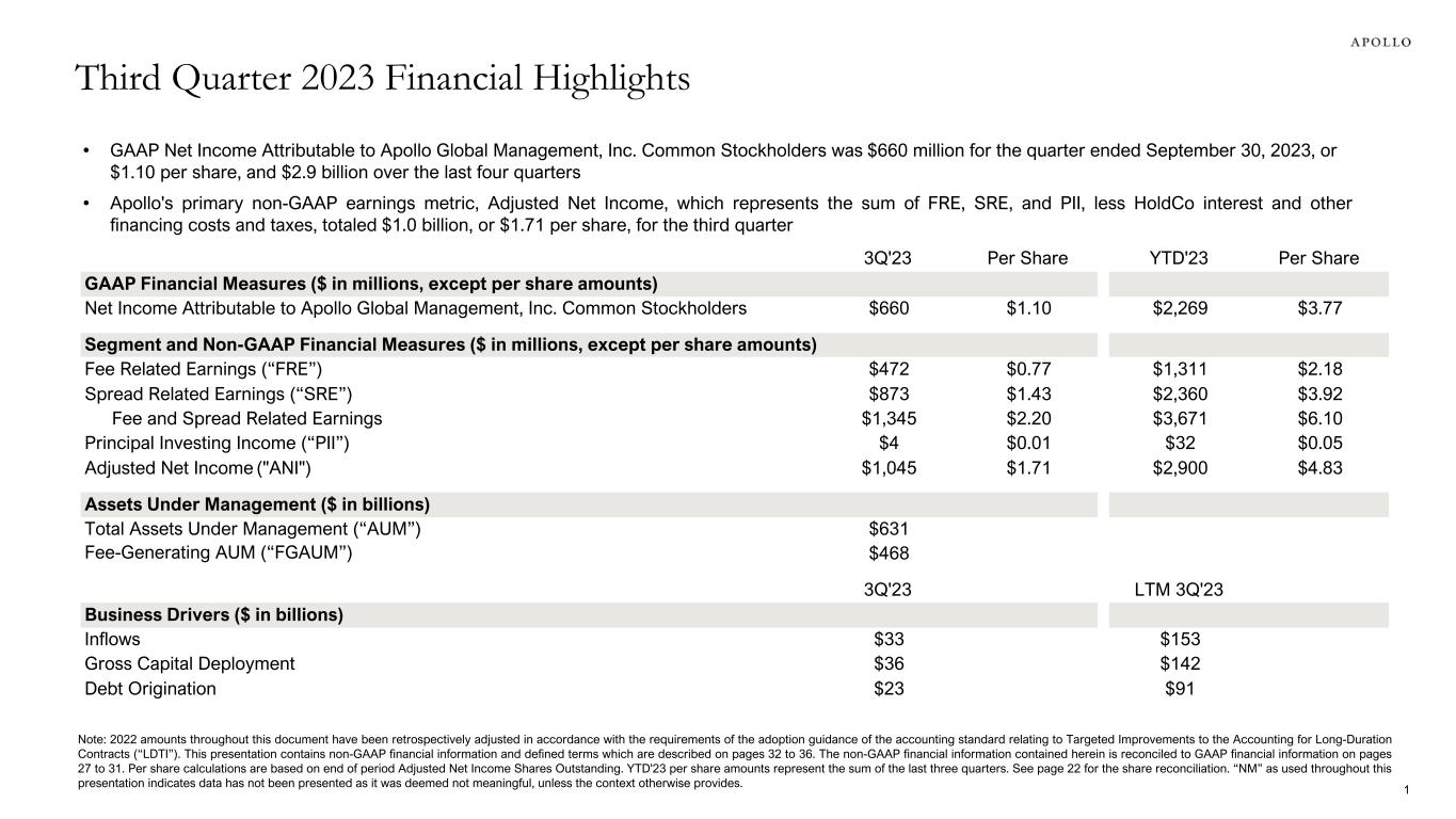 3Q'23 Per Share YTD'23 Per Share GAAP Financial Measures ($ in millions, except per share amounts) Net Income Attributable to Apollo Global Management, Inc. Common Stockholders $660 $1.10 $2,269 $3.77 Segment and Non-GAAP Financial Measures ($ in millions, except per share amounts) Fee Related Earnings (“FRE”) $472 $0.77 $1,311 $2.18 Spread Related Earnings (“SRE”) $873 $1.43 $2,360 $3.92 Fee and Spread Related Earnings $1,345 $2.20 $3,671 $6.10 Principal Investing Income (“PII”) $4 $0.01 $32 $0.05 Adjusted Net Income ("ANI") $1,045 $1.71 $2,900 $4.83 Assets Under Management ($ in billions) Total Assets Under Management (“AUM”) $631 Fee-Generating AUM (“FGAUM”) $468 3Q'23 LTM 3Q'23 Business Drivers ($ in billions) Inflows $33 $153 Gross Capital Deployment $36 $142 Debt Origination $23 $91 Third Quarter 2023 Financial Highlights • GAAP Net Income Attributable to Apollo Global Management, Inc. Common Stockholders was $660 million for the quarter ended September 30, 2023, or $1.10 per share, and $2.9 billion over the last four quarters • Apollo's primary non-GAAP earnings metric, Adjusted Net Income, which represents the sum of FRE, SRE, and PII, less HoldCo interest and other financing costs and taxes, totaled $1.0 billion, or $1.71 per share, for the third quarter Note: 2022 amounts throughout this document have been retrospectively adjusted in accordance with the requirements of the adoption guidance of the accounting standard relating to Targeted Improvements to the Accounting for Long-Duration Contracts (“LDTI”). This presentation contains non-GAAP financial information and defined terms which are described on pages 32 to 36. The non-GAAP financial information contained herein is reconciled to GAAP financial information on pages 27 to 31. Per share calculations are based on end of period Adjusted Net Income Shares Outstanding. YTD'23 per share amounts represent the sum of the last three quarters. See page 22 for the share reconciliation. “NM” as used throughout this presentation indicates data has not been presented as it was deemed not meaningful, unless the context otherwise provides. 1