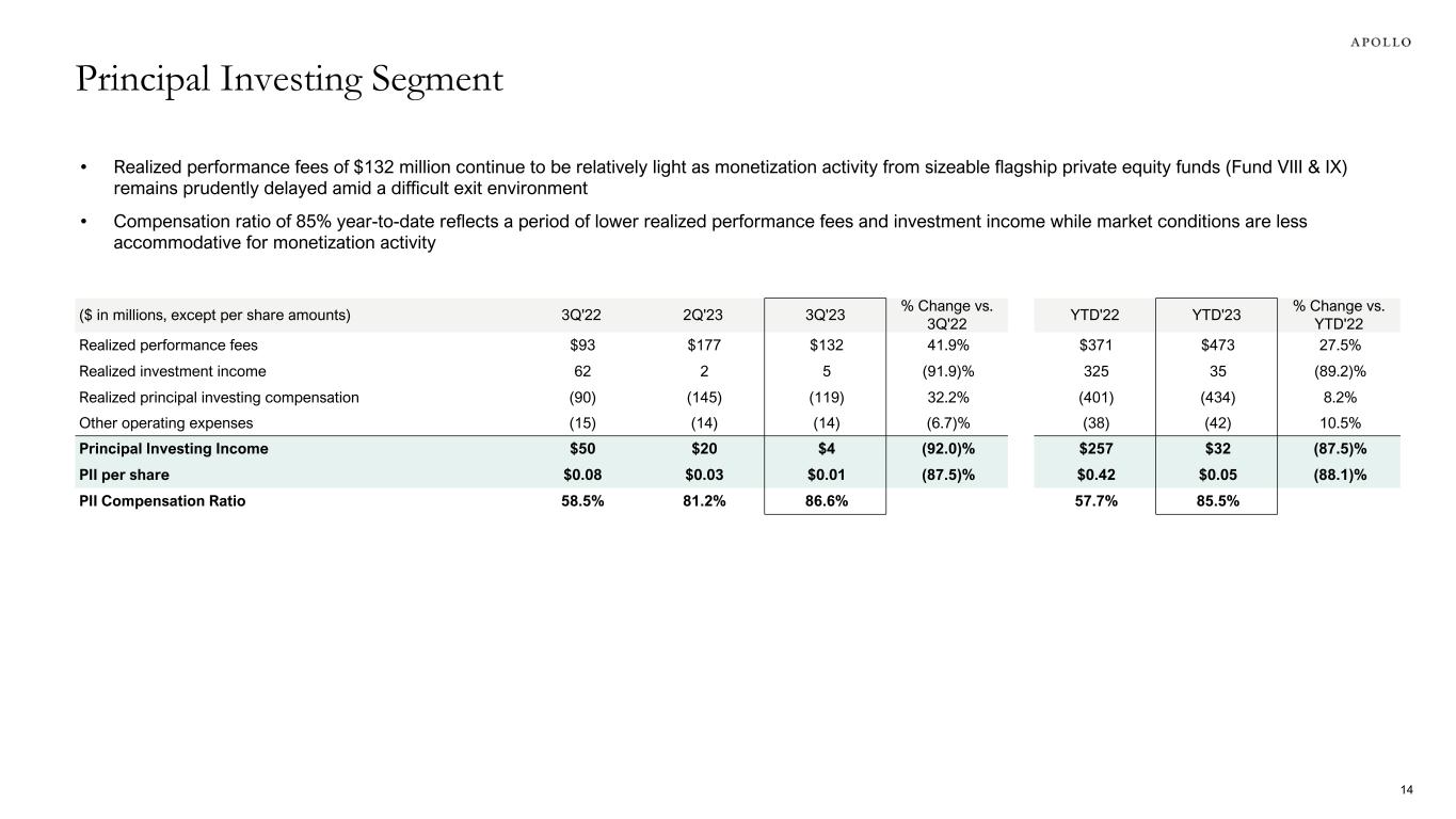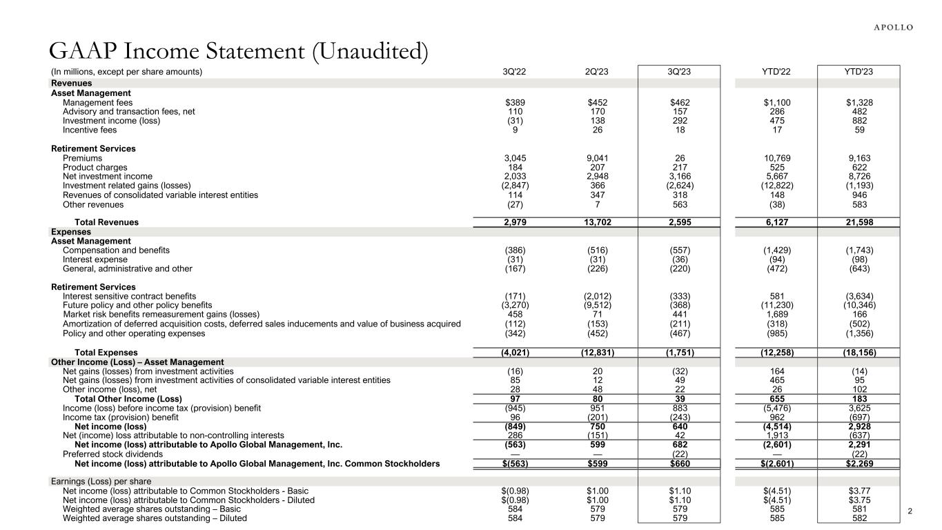 (In millions, except per share amounts) 3Q'22 2Q'23 3Q'23 YTD'22 YTD'23 Revenues Asset Management Management fees $389 $452 $462 $1,100 $1,328 Advisory and transaction fees, net 110 170 157 286 482 Investment income (loss) (31) 138 292 475 882 Incentive fees 9 26 18 17 59 Retirement Services Premiums 3,045 9,041 26 10,769 9,163 Product charges 184 207 217 525 622 Net investment income 2,033 2,948 3,166 5,667 8,726 Investment related gains (losses) (2,847) 366 (2,624) (12,822) (1,193) Revenues of consolidated variable interest entities 114 347 318 148 946 Other revenues (27) 7 563 (38) 583 Total Revenues 2,979 13,702 2,595 6,127 21,598 Expenses Asset Management Compensation and benefits (386) (516) (557) (1,429) (1,743) Interest expense (31) (31) (36) (94) (98) General, administrative and other (167) (226) (220) (472) (643) Retirement Services Interest sensitive contract benefits (171) (2,012) (333) 581 (3,634) Future policy and other policy benefits (3,270) (9,512) (368) (11,230) (10,346) Market risk benefits remeasurement gains (losses) 458 71 441 1,689 166 Amortization of deferred acquisition costs, deferred sales inducements and value of business acquired (112) (153) (211) (318) (502) Policy and other operating expenses (342) (452) (467) (985) (1,356) Total Expenses (4,021) (12,831) (1,751) (12,258) (18,156) Other Income (Loss) – Asset Management Net gains (losses) from investment activities (16) 20 (32) 164 (14) Net gains (losses) from investment activities of consolidated variable interest entities 85 12 49 465 95 Other income (loss), net 28 48 22 26 102 Total Other Income (Loss) 97 80 39 655 183 Income (loss) before income tax (provision) benefit (945) 951 883 (5,476) 3,625 Income tax (provision) benefit 96 (201) (243) 962 (697) Net income (loss) (849) 750 640 (4,514) 2,928 Net (income) loss attributable to non-controlling interests 286 (151) 42 1,913 (637) Net income (loss) attributable to Apollo Global Management, Inc. (563) 599 682 (2,601) 2,291 Preferred stock dividends — — (22) — (22) Net income (loss) attributable to Apollo Global Management, Inc. Common Stockholders $(563) $599 $660 $(2,601) $2,269 Earnings (Loss) per share Net income (loss) attributable to Common Stockholders - Basic $(0.98) $1.00 $1.10 $(4.51) $3.77 Net income (loss) attributable to Common Stockholders - Diluted $(0.98) $1.00 $1.10 $(4.51) $3.75 Weighted average shares outstanding – Basic 584 579 579 585 581 Weighted average shares outstanding – Diluted 584 579 579 585 582 GAAP Income Statement (Unaudited) 2