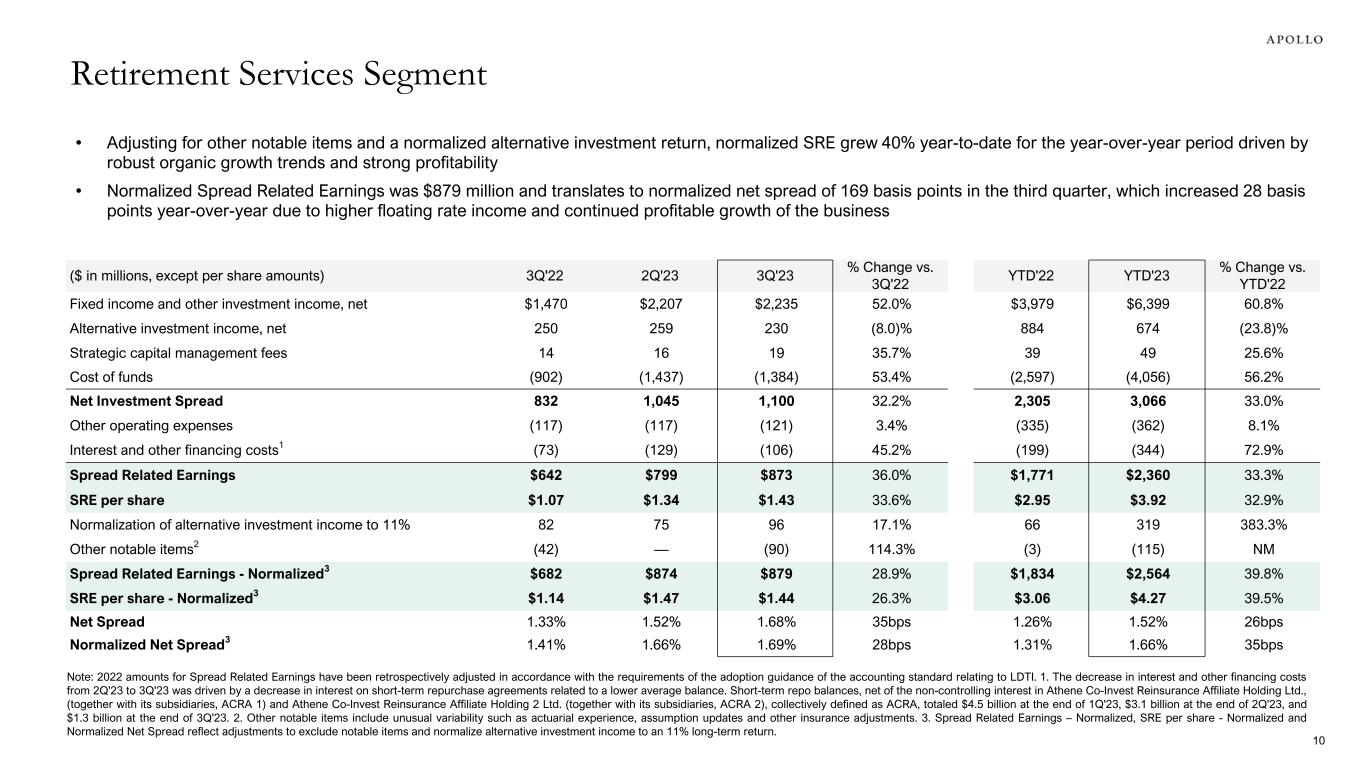 • Adjusting for other notable items and a normalized alternative investment return, normalized SRE grew 40% year-to-date for the year-over-year period driven by robust organic growth trends and strong profitability • Normalized Spread Related Earnings was $879 million and translates to normalized net spread of 169 basis points in the third quarter, which increased 28 basis points year-over-year due to higher floating rate income and continued profitable growth of the business Note: 2022 amounts for Spread Related Earnings have been retrospectively adjusted in accordance with the requirements of the adoption guidance of the accounting standard relating to LDTI. 1. The decrease in interest and other financing costs from 2Q'23 to 3Q'23 was driven by a decrease in interest on short-term repurchase agreements related to a lower average balance. Short-term repo balances, net of the non-controlling interest in Athene Co-Invest Reinsurance Affiliate Holding Ltd., (together with its subsidiaries, ACRA 1) and Athene Co-Invest Reinsurance Affiliate Holding 2 Ltd. (together with its subsidiaries, ACRA 2), collectively defined as ACRA, totaled $4.5 billion at the end of 1Q'23, $3.1 billion at the end of 2Q'23, and $1.3 billion at the end of 3Q'23. 2. Other notable items include unusual variability such as actuarial experience, assumption updates and other insurance adjustments. 3. Spread Related Earnings – Normalized, SRE per share - Normalized and Normalized Net Spread reflect adjustments to exclude notable items and normalize alternative investment income to an 11% long-term return. ($ in millions, except per share amounts) 3Q'22 2Q'23 3Q'23 % Change vs. 3Q'22 YTD'22 YTD'23 % Change vs. YTD'22 Fixed income and other investment income, net $1,470 $2,207 $2,235 52.0% $3,979 $6,399 60.8% Alternative investment income, net 250 259 230 (8.0)% 884 674 (23.8)% Strategic capital management fees 14 16 19 35.7% 39 49 25.6% Cost of funds (902) (1,437) (1,384) 53.4% (2,597) (4,056) 56.2% Net Investment Spread 832 1,045 1,100 32.2% 2,305 3,066 33.0% Other operating expenses (117) (117) (121) 3.4% (335) (362) 8.1% Interest and other financing costs1 (73) (129) (106) 45.2% (199) (344) 72.9% Spread Related Earnings $642 $799 $873 36.0% $1,771 $2,360 33.3% SRE per share $1.07 $1.34 $1.43 33.6% $2.95 $3.92 32.9% Normalization of alternative investment income to 11% 82 75 96 17.1% 66 319 383.3% Other notable items2 (42) — (90) 114.3% (3) (115) NM Spread Related Earnings - Normalized3 $682 $874 $879 28.9% $1,834 $2,564 39.8% SRE per share - Normalized3 $1.14 $1.47 $1.44 26.3% $3.06 $4.27 39.5% Net Spread 1.33% 1.52% 1.68% 35bps 1.26% 1.52% 26bps Normalized Net Spread3 1.41% 1.66% 1.69% 28bps 1.31% 1.66% 35bps Retirement Services Segment 10