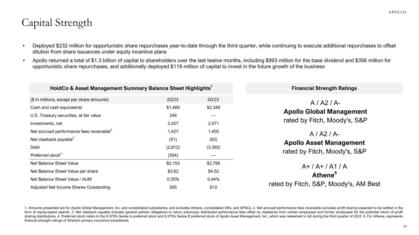 Investment Performance Highlights Net Accrued Performance Fee Receivable2 (QoQ) Appreciation / gross returns 3Q'23 YTD'23 Yield Corporate Credit1 2.6% 8.8% Structured Credit 3.4% 9.1% Direct Origination 4.3% 13.6% Hybrid Hybrid Value 3.8% 11.5% Credit Strategies and Accord 1.7% 12.0% Equity Flagship Private Equity 2.7% 10.1% European Principal Finance (1.3)% 1.7% $2.40 +$0.06 $(0.11) $(0.06) $2.29 Net unrealized performance fees/other3 2Q'23 Net realized performance fees 1. CLOs are included within corporate credit. The 3Q'23 and YTD'23 gross returns for CLOs were 3.6% and 9.6%, respectively. CLO returns are calculated based on gross return on assets and exclude performance related to Redding Ridge. 2. Net Accrued Performance Fee Receivable represents the sum of performance allocations and incentive fees receivable, less profit sharing payable as reported on the consolidated statements of financial condition, and includes certain eliminations related to investments in consolidated funds and VIEs and other adjustments. 3. Net unrealized performance fees/other includes (i) unrealized performance fees, net of unrealized profit sharing expense and (ii) certain transaction related charges, and excludes general partner obligations to return previously distributed performance fees. 4. Represents, primarily, the impact of the assumed conversion of the Series A Mandatory Convertible Preferred Stock into shares of Apollo Global Management, Inc. Common Stock upon mandatory conversion. 3Q'23 $1,427 $38 $(65) $— $1,400 ($ in millions, except per share amounts) Investment Performance Highlights and Net Accrued Performance Fees 16 Sharecount increase4