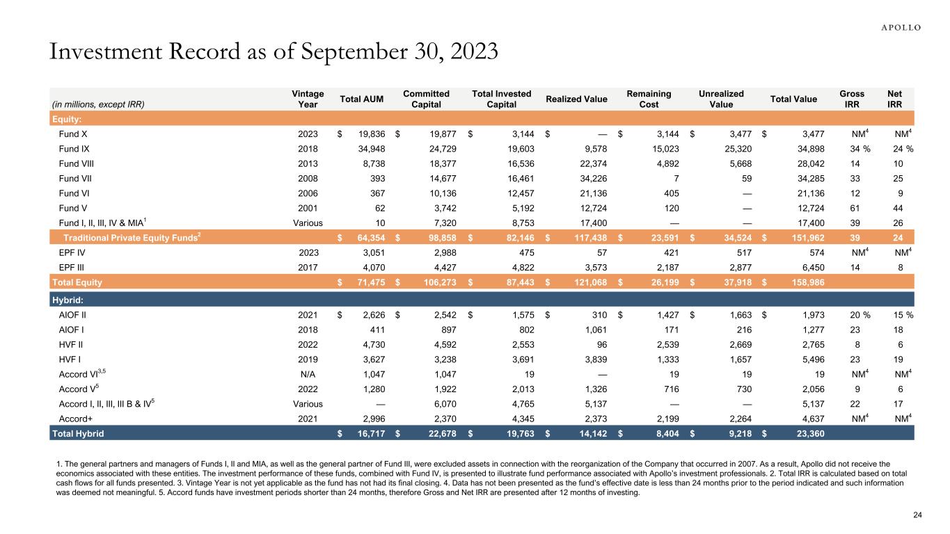 (in millions, except IRR) Vintage Year Total AUM Committed Capital Total Invested Capital Realized Value Remaining Cost Unrealized Value Total Value Gross IRR Net IRR Equity: Fund X 2023 $ 19,836 $ 19,877 $ 3,144 $ — $ 3,144 $ 3,477 $ 3,477 NM4 NM4 Fund IX 2018 34,948 24,729 19,603 9,578 15,023 25,320 34,898 34 % 24 % Fund VIII 2013 8,738 18,377 16,536 22,374 4,892 5,668 28,042 14 10 Fund VII 2008 393 14,677 16,461 34,226 7 59 34,285 33 25 Fund VI 2006 367 10,136 12,457 21,136 405 — 21,136 12 9 Fund V 2001 62 3,742 5,192 12,724 120 — 12,724 61 44 Fund I, II, III, IV & MIA1 Various 10 7,320 8,753 17,400 — — 17,400 39 26 Traditional Private Equity Funds2 $ 64,354 $ 98,858 $ 82,146 $ 117,438 $ 23,591 $ 34,524 $ 151,962 39 24 EPF IV 2023 3,051 2,988 475 57 421 517 574 NM4 NM4 EPF III 2017 4,070 4,427 4,822 3,573 2,187 2,877 6,450 14 8 Total Equity $ 71,475 $ 106,273 $ 87,443 $ 121,068 $ 26,199 $ 37,918 $ 158,986 Hybrid: AIOF II 2021 $ 2,626 $ 2,542 $ 1,575 $ 310 $ 1,427 $ 1,663 $ 1,973 20 % 15 % AIOF I 2018 411 897 802 1,061 171 216 1,277 23 18 HVF II 2022 4,730 4,592 2,553 96 2,539 2,669 2,765 8 6 HVF I 2019 3,627 3,238 3,691 3,839 1,333 1,657 5,496 23 19 Accord VI3,5 N/A 1,047 1,047 19 — 19 19 19 NM4 NM4 Accord V5 2022 1,280 1,922 2,013 1,326 716 730 2,056 9 6 Accord I, II, III, III B & IV5 Various — 6,070 4,765 5,137 — — 5,137 22 17 Accord+ 2021 2,996 2,370 4,345 2,373 2,199 2,264 4,637 NM4 NM4 Total Hybrid $ 16,717 $ 22,678 $ 19,763 $ 14,142 $ 8,404 $ 9,218 $ 23,360 Investment Record as of September 30, 2023 24 1. The general partners and managers of Funds I, II and MIA, as well as the general partner of Fund III, were excluded assets in connection with the reorganization of the Company that occurred in 2007. As a result, Apollo did not receive the economics associated with these entities. The investment performance of these funds, combined with Fund IV, is presented to illustrate fund performance associated with Apollo’s investment professionals. 2. Total IRR is calculated based on total cash flows for all funds presented. 3. Vintage Year is not yet applicable as the fund has not had its final closing. 4. Data has not been presented as the fund’s effective date is less than 24 months prior to the period indicated and such information was deemed not meaningful. 5. Accord funds have investment periods shorter than 24 months, therefore Gross and Net IRR are presented after 12 months of investing.
