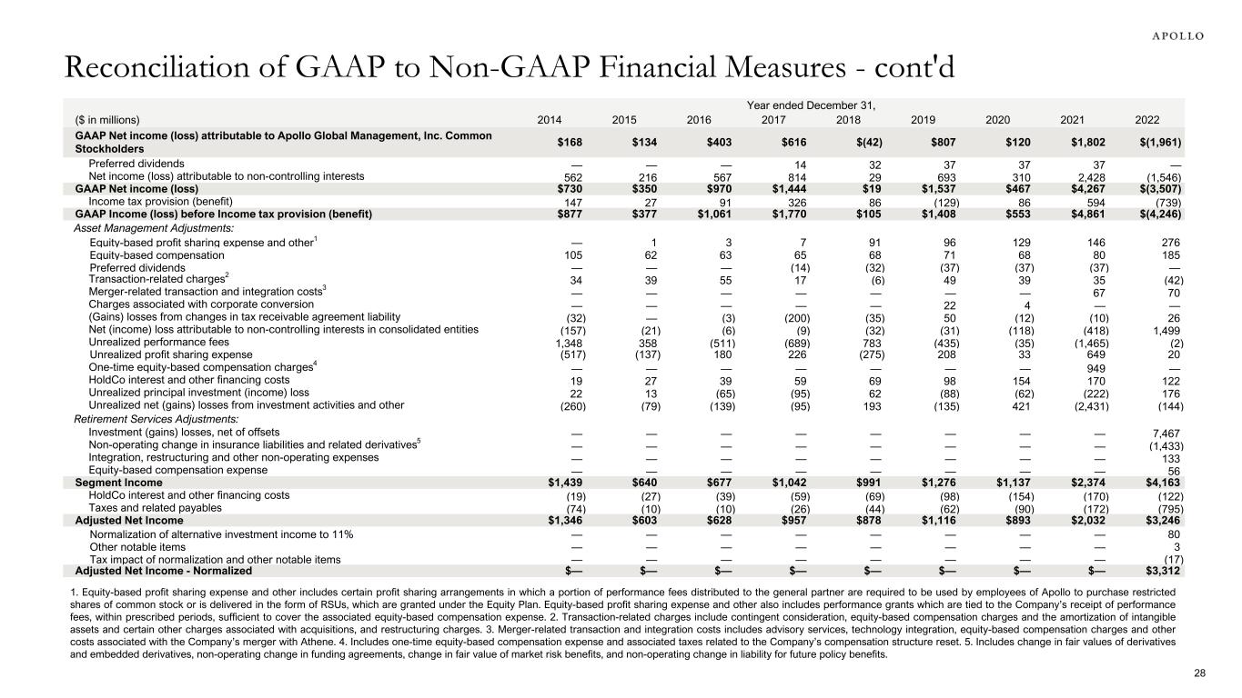 ($ in millions) 3Q'22 4Q'22 1Q'23 2Q'23 3Q'23 YTD'22 YTD'23 GAAP Net income (loss) attributable to Apollo Global Management, Inc. Common Stockholders $(563) $640 $1,010 $599 $660 $(2,601) $2,269 Preferred dividends — — — — 22 — 22 Net income (loss) attributable to non-controlling interests (286) 367 528 151 (42) (1,913) 637 GAAP Net income (loss) $(849) $1,007 $1,538 $750 $640 $(4,514) $2,928 Income tax provision (benefit) (96) 223 253 201 243 (962) 697 GAAP Income (loss) before Income tax provision (benefit) $(945) $1,230 $1,791 $951 $883 $(5,476) $3,625 Asset Management Adjustments: Equity-based profit sharing expense and other1 55 57 67 57 62 219 186 Equity-based compensation 46 46 52 58 57 139 167 Transaction-related charges2 (5) (36) (3) (4) 25 (6) 18 Merger-related transaction and integration costs3 14 20 7 5 5 50 17 (Gains) losses from changes in tax receivable agreement liability — 12 — — — 14 — Net (income) loss attributable to non-controlling interests in consolidated entities 277 (387) (523) (192) 28 1,886 (687) Unrealized performance fees 66 (111) (239) 86 (91) 109 (244) Unrealized profit sharing expense (19) 36 135 1 55 (16) 191 HoldCo interest and other financing costs 29 19 21 20 36 103 77 Unrealized principal investment (income) loss 128 38 (10) (29) (27) 138 (66) Unrealized net (gains) losses from investment activities and other 24 (11) 12 8 30 (133) 50 Retirement Services Adjustments: Investment (gains) losses, net of offsets 1,853 137 (397) 563 663 7,330 829 Non-operating change in insurance liabilities and related derivatives4 (518) 24 135 (304) (431) (1,457) (600) Integration, restructuring and other non-operating expenses 37 29 29 28 41 104 98 Equity-based compensation expense 15 16 16 13 13 40 42 Segment Income $1,057 $1,119 $1,093 $1,261 $1,349 $3,044 $3,703 HoldCo interest and other financing costs (29) (19) (21) (20) (36) (103) (77) Taxes and related payables (178) (197) (227) (231) (268) (598) (726) Adjusted Net Income $850 $903 $845 $1,010 $1,045 $2,343 $2,900 Normalization of alternative investment income to 11% 82 14 148 75 96 66 319 Other notable items (42) 35 (25) — (90) (3) (115) Tax impact of normalization and other notable items (8) (10) (26) (16) (1) (13) (43) Adjusted Net Income - Normalized $882 $942 $942 $1,069 $1,050 $2,393 $3,061 1. Equity-based profit sharing expense and other includes certain profit sharing arrangements in which a portion of performance fees distributed to the general partner are required to be used by employees of Apollo to purchase restricted shares of common stock or is delivered in the form of RSUs, which are granted under the Equity Plan. Equity-based profit sharing expense and other also includes performance grants which are tied to the Company’s receipt of performance fees, within prescribed periods, sufficient to cover the associated equity-based compensation expense. 2. Transaction-related charges include contingent consideration, equity-based compensation charges and the amortization of intangible assets and certain other charges associated with acquisitions, and restructuring charges. 3. Merger-related transaction and integration costs includes advisory services, technology integration, equity-based compensation charges and other costs associated with the Company’s merger with Athene. 4. Includes change in fair values of derivatives and embedded derivatives, non-operating change in funding agreements, change in fair value of market risk benefits, and non-operating change in liability for future policy benefits. Reconciliation of GAAP to Non-GAAP Financial Measures 27