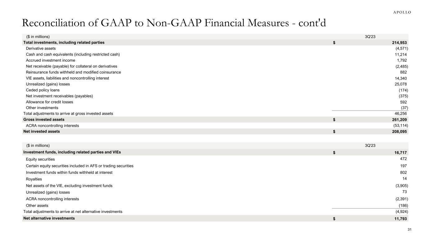 • "Gross IRR" of infrastructure funds represents the cumulative investment-related cash flows in the fund itself (and not any one investor in the fund), on the basis of the actual timing of cash inflows and outflows (for unrealized investments assuming disposition on September 30, 2023 or other date specified) starting on the date that each investment closes, and the return is annualized and compounded before management fees, performance fees, and certain other expenses (including interest incurred by the fund itself) and measures the returns on the fund’s investments as a whole without regard to whether all of the returns would, if distributed, be payable to the fund’s investors. Non-USD fund cash flows and residual values are converted to USD using the spot rate as of the reporting date. In addition, gross IRRs at the fund level will differ from those at the individual investor level as a result of, among other factors, timing of investor-level inflows and outflows. Gross IRR does not represent the return to any fund investor. • “Gross Return” of a yield fund and Credit Strategies and Accord is the monthly or quarterly time-weighted return that is equal to the percentage change in the value of a fund’s portfolio, adjusted for all contributions and withdrawals (cash flows) before the effects of management fees, incentive fees allocated to the general partner, or other fees and expenses. Returns for these categories are calculated for all funds and accounts in the respective strategies excluding assets for Athene, Athora and certain other entities where Apollo manages or may manage a significant portion of the total company assets. Returns of CLOs represent the gross returns on assets. Returns over multiple periods are calculated by geometrically linking each period’s return over time. • “HoldCo” refers to Apollo Global Management, Inc. • “Inflows” within the Asset Management segment represents (i) at the individual strategy level, subscriptions, commitments, and other increases in available capital, such as acquisitions or leverage, net of inter-strategy transfers, and (ii) on an aggregate basis, the sum of inflows across the yield, hybrid and equity strategies. • "MidCap Financial" refers to MidCap FinCo Designated Activity Company. • “Net Invested Assets” represent the investments that directly back Athene's net reserve liabilities as well as surplus assets. Net invested assets is used in the computation of net investment earned rate, which is used to analyze the profitability of Athene’s investment portfolio. Net invested assets includes (a) total investments on the statements of financial condition, with AFS securities, trading securities and mortgage loans at cost or amortized cost, excluding derivatives, (b) cash and cash equivalents and restricted cash, (c) investments in related parties, (d) accrued investment income, (e) VIE assets, liabilities and noncontrolling interest adjustments, (f) net investment payables and receivables, (g) policy loans ceded (which offset the direct policy loans in total investments) and (h) an adjustment for the allowance for credit losses. Net invested assets exclude assets associated with funds withheld liabilities related to business exited through reinsurance agreements and derivative collateral (offsetting the related cash positions). Athene includes the underlying investments supporting its assumed funds withheld and modco agreements in its net invested assets calculation in order to match the assets with the income received. Athene believes the adjustments for reinsurance provide a view of the assets for which it has economic exposure. Net invested assets include Athene’s proportionate share of ACRA investments, based on Athene’s economic ownership, but do not include the proportionate share of investments associated with the noncontrolling interests. Net invested assets are averaged over the number of quarters in the relevant period to compute a net investment earned rate for such period. While Athene believes net invested assets is a meaningful financial metric and enhances the understanding of the underlying drivers of its investment portfolio, it should not be used as a substitute for total investments, including related parties, presented under U.S. GAAP. • “Net Investment Earned Rate” is computed as the income from Athene's net invested assets divided by the average net invested assets, for the relevant period. • “Net Investment Spread” measures Athene's investment performance plus its strategic capital management fees, less its total cost of funds. Net investment earned rate is a key measure of Athene's investment performance while cost of funds is a key measure of the cost of its policyholder benefits and liabilities. • "Net IRR" of accord series and the European principal finance funds represents the annualized return of a fund after management fees, performance fees allocated to the general partner and certain other expenses, calculated on investors that pay such fees. The terminal value is the net asset value as of the reporting date. Non-USD fund cash flows and residual values are converted to USD using the spot rate as of the reporting date. In addition, net IRR at the fund level will differ from that at the individual investor level as a result of, among other factors, timing of investor-level inflows and outflows. Net IRR does not represent the return to any fund investor. • "Net IRR" of a traditional private equity or the hybrid value funds represents the gross IRR applicable to a fund, including returns for related parties which may not pay fees or performance fees, net of management fees, certain expenses (including interest incurred or earned by the fund itself) and realized performance fees all offset to the extent of interest income, and measures returns at the fund level on amounts that, if distributed, would be paid to investors of the fund. The timing of cash flo