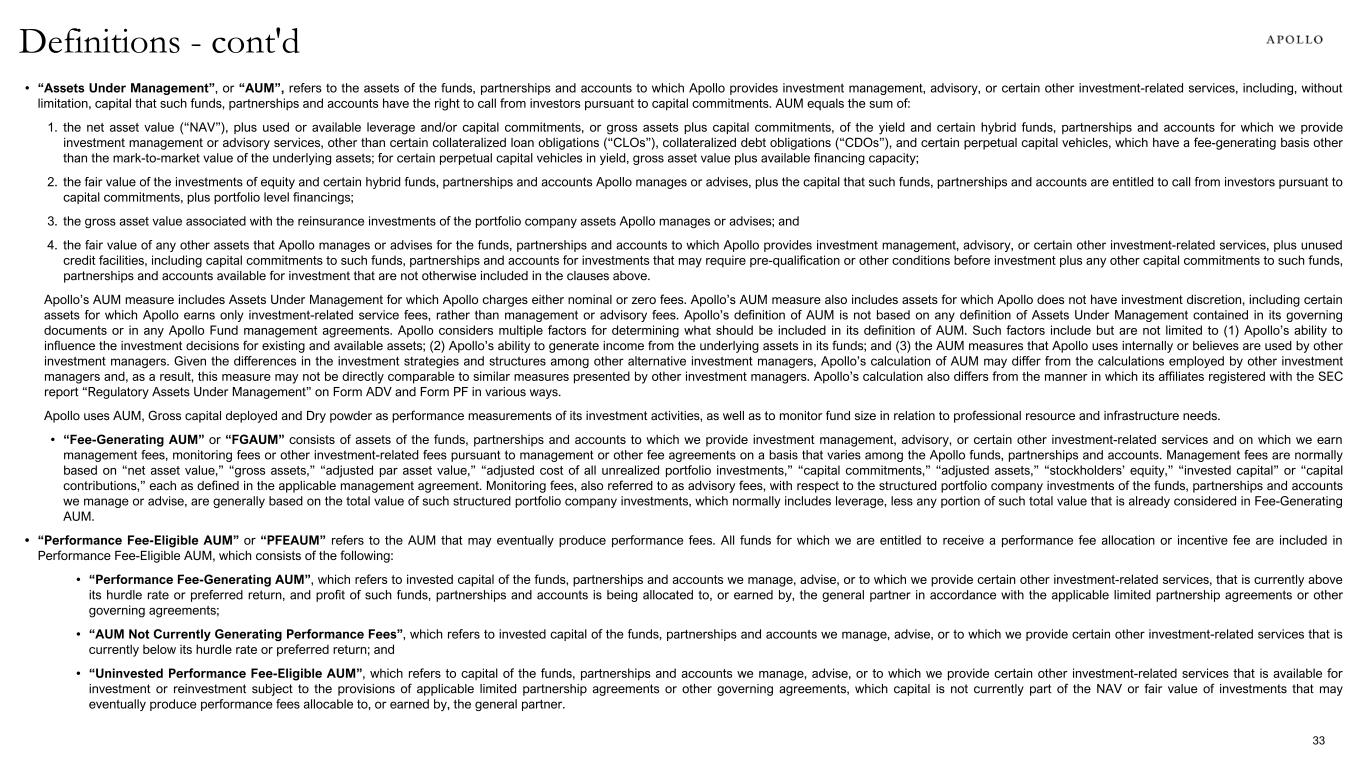 • “ACRA” refers to Athene Co-Invest Reinsurance Affiliate Holding Ltd, together with its subsidiaries, and Athene Co-Invest Reinsurance Affiliate Holding 2 Ltd, together with its subsidiaries. • “ADIP” refers to Apollo/Athene Dedicated Investment Program and Apollo/Athene Dedicated Investment Program II, funds managed by Apollo including third-party capital that, through ACRA, invest alongside Athene in certain investments. • "Adjusted Net Income Shares Outstanding" or "ANI Shares Outstanding" consists of total shares of Common Stock outstanding, RSUs that participate in dividends, and shares of Common Stock assumed to be issuable upon the conversion of the shares of Series A Mandatory Convertible Preferred Stock. • “Appreciation (depreciation)” of flagship private equity, hybrid value and European principal finance funds refers to gain (loss) and income for the periods presented on a total return basis before giving effect to fees and expenses. The performance percentage is determined by dividing (a) the change in the fair value of investments over the period presented, minus the change in invested capital over the period presented, plus the realized value for the period presented, by (b) the beginning unrealized value for the period presented plus the change in invested capital for the period presented. Returns over multiple periods are calculated by geometrically linking each period’s return over time. • “Athene” refers to Athene Holding Ltd. (together with its subsidiaries, “Athene”), a subsidiary of the Company and a leading retirement services company that issues, reinsures and acquires retirement savings products designed for the increasing number of individuals and institutions seeking to fund retirement needs, and to which Apollo, through its consolidated subsidiary Apollo Insurance Solutions Group LP (“ISG”), provides asset management and advisory services. • “Athora” refers to a strategic platform that acquires or reinsures blocks of insurance business in the German and broader European life insurance market (collectively, the “Athora Accounts”). • “Capital solutions fees and other, net” primarily includes transaction fees earned by Apollo Capital Solutions ("ACS") related to underwriting, structuring, arrangement and placement of debt and equity securities, and syndication for funds managed by Apollo, portfolio companies of funds managed by Apollo, and third parties. Capital solutions fees and other, net also includes advisory fees for the ongoing monitoring of portfolio operations and directors' fees. These fees also include certain offsetting amounts including reductions in management fees related to a percentage of these fees recognized ("management fee offset") and other additional revenue sharing arrangements. • “Cost of Funds” includes liability costs related to cost of crediting on both deferred annuities and institutional products as well as other liability costs, but does not include the proportionate share of the ACRA cost of funds associated with the noncontrolling interests. While we believe cost of funds is a meaningful financial metric and enhances the understanding of the underlying profitability drivers of our retirement services business, it should not be used as a substitute for total benefits and expenses presented under U.S. GAAP. • “Debt Origination” represents (i) capital that has been invested in new debt or debt like investments by Apollo's yield and hybrid strategies (whether purchased by Apollo funds and accounts, or syndicated to third parties) where Apollo or one of Apollo's platforms has sourced, negotiated, or significantly affected the commercial terms of the investment; (ii) new capital pools formed by debt issuances, including CLOs and (iii) net purchases of certain assets by the funds and accounts we manage that we consider to be private, illiquid, and hard to access assets and which the funds and accounts otherwise may not be able to meaningfully access. Debt origination generally excludes any issuance of debt or debt-like investments by the portfolio companies of the funds we manage. • “Dry Powder” represents the amount of capital available for investment or reinvestment subject to the provisions of the applicable limited partnership agreements or other governing agreements of the funds, partnerships and accounts we manage. Dry powder excludes uncalled commitments which can only be called for fund fees and expenses and commitments from perpetual capital vehicles. • “FRE Compensation Ratio” is calculated as fee-related compensation divided by fee-related revenues (which includes management fees, capital solutions fees and other, net, and fee-related performance fees). • “FRE Margin” is calculated as Fee Related Earnings divided by fee-related revenues (which includes management fees, capital solutions fees and other, net, and fee-related performance fees). • “Gross Capital Deployment” represents the gross capital that has been invested by the funds and accounts we manage during the relevant period, but excludes certain investment activities primarily related to hedging and cash management functions at the firm. Gross Capital Deployment is not reduced or netted down by sales or refinancings, and takes into account leverage used by the funds and accounts we manage in gaining exposure to the various investments that they have made. • "Gross IRR" of accord series and the European principal finance funds represents the annualized return of a fund based on the actual timing of all cumulative fund cash flows before management fees, performance fees allocated to the general partner and certain other expenses. Calculations may include certain investors that do not pay fees. The terminal value is the net asset value as of the reporting date. Non-U.S. dollar denominated (“USD”) fund cash flows and residual values are converted to USD using the spot rate as of 