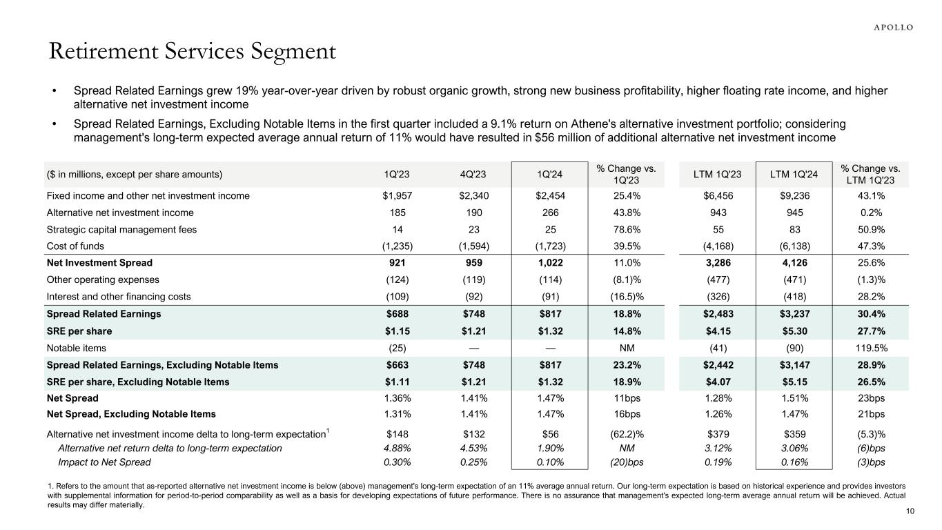 • Spread Related Earnings grew 19% year-over-year driven by robust organic growth, strong new business profitability, higher floating rate income, and higher alternative net investment income • Spread Related Earnings, Excluding Notable Items in the first quarter included a 9.1% return on Athene's alternative investment portfolio; considering management's long-term expected average annual return of 11% would have resulted in $56 million of additional alternative net investment income 1. Refers to the amount that as-reported alternative net investment income is below (above) management's long-term expectation of an 11% average annual return. Our long-term expectation is based on historical experience and provides investors with supplemental information for period-to-period comparability as well as a basis for developing expectations of future performance. There is no assurance that management's expected long-term average annual return will be achieved. Actual results may differ materially. ($ in millions, except per share amounts) 1Q'23 4Q'23 1Q'24 % Change vs. 1Q'23 LTM 1Q'23 LTM 1Q'24 % Change vs. LTM 1Q'23 Fixed income and other net investment income $1,957 $2,340 $2,454 25.4% $6,456 $9,236 43.1% Alternative net investment income 185 190 266 43.8% 943 945 0.2% Strategic capital management fees 14 23 25 78.6% 55 83 50.9% Cost of funds (1,235) (1,594) (1,723) 39.5% (4,168) (6,138) 47.3% Net Investment Spread 921 959 1,022 11.0% 3,286 4,126 25.6% Other operating expenses (124) (119) (114) (8.1)% (477) (471) (1.3)% Interest and other financing costs (109) (92) (91) (16.5)% (326) (418) 28.2% Spread Related Earnings $688 $748 $817 18.8% $2,483 $3,237 30.4% SRE per share $1.15 $1.21 $1.32 14.8% $4.15 $5.30 27.7% Notable items (25) — — NM (41) (90) 119.5% Spread Related Earnings, Excluding Notable Items $663 $748 $817 23.2% $2,442 $3,147 28.9% SRE per share, Excluding Notable Items $1.11 $1.21 $1.32 18.9% $4.07 $5.15 26.5% Net Spread 1.36% 1.41% 1.47% 11bps 1.28% 1.51% 23bps Net Spread, Excluding Notable Items 1.31% 1.41% 1.47% 16bps 1.26% 1.47% 21bps Alternative net investment income delta to long-term expectation1 $148 $132 $56 (62.2)% $379 $359 (5.3)% Alternative net return delta to long-term expectation 4.88% 4.53% 1.90% NM 3.12% 3.06% (6)bps Impact to Net Spread 0.30% 0.25% 0.10% (20)bps 0.19% 0.16% (3)bps Retirement Services Segment 10