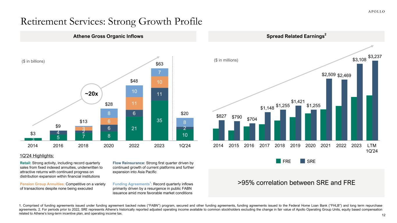 • Fixed income and other net investment income benefited from higher on-the-margin deployment quarter-over-quarter, although the impact was not fully recognized in the first quarter given the timing of certain sizeable asset purchases that closed near quarter-end • Cost of funds increased quarter-over-quarter due to higher on-the-margin cost of new business in the higher interest rate environment, current period costs associated with hedging a portion of the floating rate portfolio designed to protect future earnings potential, and higher costs on a portion of in-force business (% of average net invested assets) 1Q'23 4Q'23 1Q'24 % Change vs. 1Q'23 LTM 1Q'23 LTM 1Q'24 % Change vs. LTM 1Q'23 Fixed income and other net investment income 4.13% 4.66% 4.66% 53bps 3.54% 4.56% 102bps Alternative net investment income 6.12% 6.47% 9.10% 298bps 7.88% 7.94% 6bps Net Investment Earnings 4.25% 4.76% 4.89% 64bps 3.81% 4.74% 93bps Strategic capital management fees 0.03% 0.04% 0.04% 1bp 0.03% 0.04% 1bp Cost of funds (2.45)% (3.00)% (3.10)% 65bps (2.14)% (2.86)% (72)bps Net Investment Spread 1.83% 1.80% 1.83% 0bps 1.70% 1.92% 22bps Other operating expenses (0.25)% (0.23)% (0.21)% 4bps (0.25)% (0.22)% 3bps Interest and other financing costs (0.22)% (0.16)% (0.15)% 7bps (0.17)% (0.19)% (2)bps Net Spread 1.36% 1.41% 1.47% 11bps 1.28% 1.51% 23bps Notable items (0.05)% —% —% NM (0.02)% (0.04)% (2)bps Net Spread, Excluding Notable Items 1.31% 1.41% 1.47% 16bps 1.26% 1.47% 21bps Net investment earnings, excluding notable items 4.25% 4.76% 4.89% 64bps 3.81% 4.74% 93bps Cost of funds, excluding notable items (2.50)% (3.00)% (3.10)% (60)bps (2.16)% (2.90)% (74)bps Net investment spread, excluding notable items 1.78% 1.80% 1.83% 5bps 1.68% 1.88% 20bps Alternative net return delta to long-term expectation 4.88% 4.53% 1.90% NM 3.12% 3.06% (6)bps Impact to Net Spread 0.30% 0.25% 0.10% (20)bps 0.19% 0.16% (3)bps ($ in millions) Average net invested assets1 201,600 212,761 222,391 10% 194,387 214,659 10% Average net invested assets - fixed income1 189,509 201,035 210,688 11% 182,414 202,761 11% Average net invested assets - alternatives1 12,091 11,726 11,703 (3)% 11,973 11,898 (1)% Retirement Services: Return on Asset View 1. Second vintage of strategic third-party sidecar began supporting Athene's organic growth on July 1, 2023, with Athene Life Re Ltd. ("ALRe") selling 50% of the economic interests in ACRA 2 to ADIP II. Effective December 31, 2023, ADIP II’s ownership of economic interests in ACRA 2 increased to 60%, with ALRe owning the remaining 40% of economic interests. 11