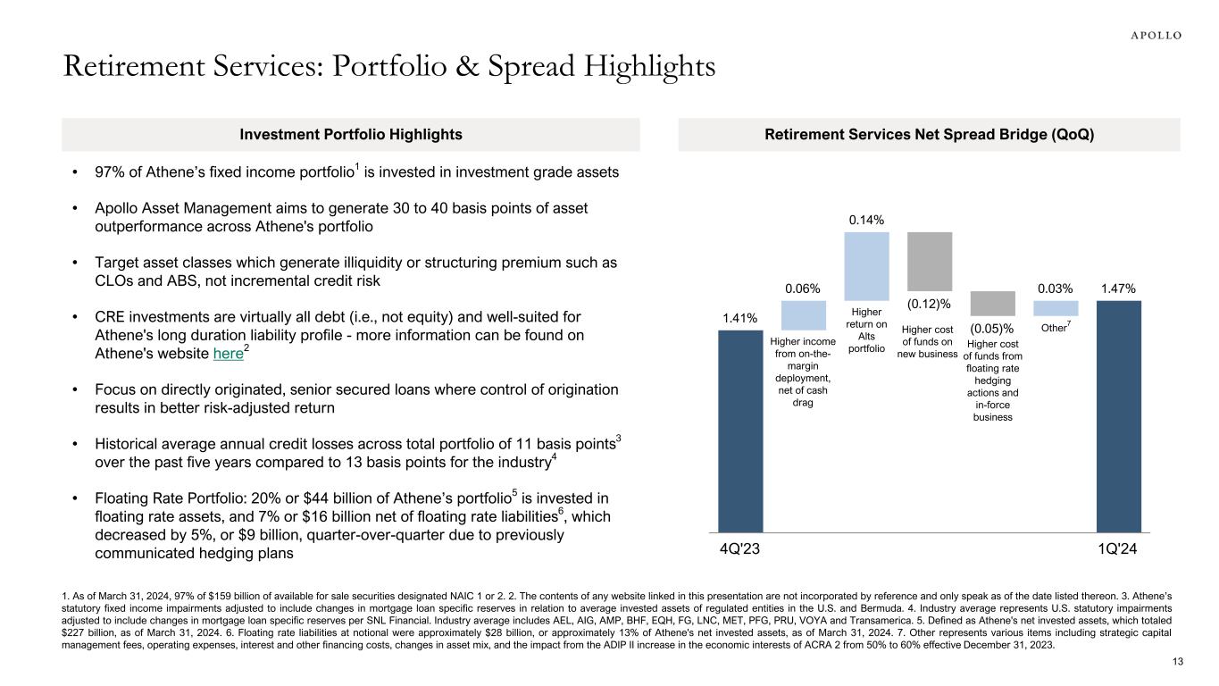 1.41% 0.06% 0.14% (0.12)% (0.05)% 0.03% 1.47% 4Q'23 1Q'24 Higher cost of funds from floating rate hedging actions and in-force business Investment Portfolio Highlights Retirement Services Net Spread Bridge (QoQ) • 97% of Athene’s fixed income portfolio1 is invested in investment grade assets • Apollo Asset Management aims to generate 30 to 40 basis points of asset outperformance across Athene's portfolio • Target asset classes which generate illiquidity or structuring premium such as CLOs and ABS, not incremental credit risk • CRE investments are virtually all debt (i.e., not equity) and well-suited for Athene's long duration liability profile - more information can be found on Athene's website here2 • Focus on directly originated, senior secured loans where control of origination results in better risk-adjusted return • Historical average annual credit losses across total portfolio of 11 basis points3 over the past five years compared to 13 basis points for the industry4 • Floating Rate Portfolio: 20% or $44 billion of Athene’s portfolio5 is invested in floating rate assets, and 7% or $16 billion net of floating rate liabilities6, which decreased by 5%, or $9 billion, quarter-over-quarter due to previously communicated hedging plans Higher cost of funds on new business Retirement Services: Portfolio & Spread Highlights 1. As of March 31, 2024, 97% of $159 billion of available for sale securities designated NAIC 1 or 2. 2. The contents of any website linked in this presentation are not incorporated by reference and only speak as of the date listed thereon. 3. Athene’s statutory fixed income impairments adjusted to include changes in mortgage loan specific reserves in relation to average invested assets of regulated entities in the U.S. and Bermuda. 4. Industry average represents U.S. statutory impairments adjusted to include changes in mortgage loan specific reserves per SNL Financial. Industry average includes AEL, AIG, AMP, BHF, EQH, FG, LNC, MET, PFG, PRU, VOYA and Transamerica. 5. Defined as Athene's net invested assets, which totaled $227 billion, as of March 31, 2024. 6. Floating rate liabilities at notional were approximately $28 billion, or approximately 13% of Athene's net invested assets, as of March 31, 2024. 7. Other represents various items including strategic capital management fees, operating expenses, interest and other financing costs, changes in asset mix, and the impact from the ADIP II increase in the economic interests of ACRA 2 from 50% to 60% effective December 31, 2023. 13 Higher income from on-the- margin deployment, net of cash drag Higher return on Alts portfolio Other7