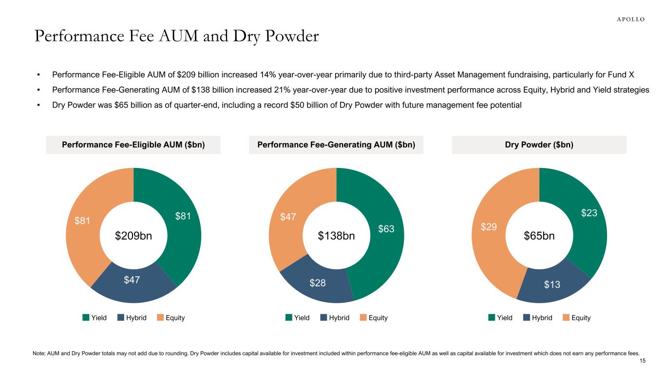 • “Performance Fee-Eligible AUM” or “PFEAUM” refers to the AUM that may eventually produce performance fees. All funds for which we are entitled to receive a performance fee allocation or incentive fee are included in Performance Fee-Eligible AUM, which consists of the following: • “Performance Fee-Generating AUM”, which refers to invested capital of the funds, partnerships and accounts we manage, advise, or to which we provide certain other investment-related services, that is currently above its hurdle rate or preferred return, and profit of such funds, partnerships and accounts is being allocated to, or earned by, the general partner in accordance with the applicable limited partnership agreements or other governing agreements; • “AUM Not Currently Generating Performance Fees”, which refers to invested capital of the funds, partnerships and accounts we manage, advise, or to which we provide certain other investment-related services that is currently below its hurdle rate or preferred return; and • “Uninvested Performance Fee-Eligible AUM”, which refers to capital of the funds, partnerships and accounts we manage, advise, or to which we provide certain other investment-related services that is available for investment or reinvestment subject to the provisions of applicable limited partnership agreements or other governing agreements, which capital is not currently part of the NAV or fair value of investments that may eventually produce performance fees allocable to, or earned by, the general partner. • “ACRA” refers to Athene Co-Invest Reinsurance Affiliate Holding Ltd, together with its subsidiaries, and Athene Co-Invest Reinsurance Affiliate Holding 2 Ltd, together with its subsidiaries ("ACRA 2"). • “ADIP” refers to Apollo/Athene Dedicated Investment Program and Apollo/Athene Dedicated Investment Program II ("ADIP II"), funds managed by Apollo including third-party capital that, through ACRA, invest alongside Athene in certain investments. • "Adjusted Net Income Shares Outstanding" or "ANI Shares Outstanding" consists of total shares of Common Stock outstanding, RSUs that participate in dividends, and shares of Common Stock assumed to be issuable upon the conversion of the shares of Mandatory Convertible Preferred Stock. • “Appreciation (depreciation)” of flagship private equity, hybrid value and European principal finance funds refers to gain (loss) and income for the periods presented on a total return basis before giving effect to fees and expenses. The performance percentage is determined by dividing (a) the change in the fair value of investments over the period presented, minus the change in invested capital over the period presented, plus the realized value for the period presented, by (b) the beginning unrealized value for the period presented plus the change in invested capital for the period presented. Returns over multiple periods are calculated by geometrically linking each period’s return over time. • “Athene” refers to Athene Holding Ltd. (together with its subsidiaries, “Athene”), a subsidiary of the Company and a leading retirement services company that issues, reinsures and acquires retirement savings products designed for the increasing number of individuals and institutions seeking to fund retirement needs, and to which Apollo, through its consolidated subsidiary Apollo Insurance Solutions Group LP (“ISG”), provides asset management and advisory services. • “Athora” refers to a strategic platform that acquires or reinsures blocks of insurance business in the German and broader European life insurance market (collectively, the “Athora Accounts”). • “Capital solutions fees and other, net” primarily includes transaction fees earned by Apollo Capital Solutions ("ACS") related to underwriting, structuring, arrangement and placement of debt and equity securities, and syndication for funds managed by Apollo, portfolio companies of funds managed by Apollo, and third parties. Capital solutions fees and other, net also includes advisory fees for the ongoing monitoring of portfolio operations and directors' fees. These fees also include certain offsetting amounts including reductions in management fees related to a percentage of these fees recognized ("management fee offset") and other additional revenue sharing arrangements. • “Cost of Funds” includes liability costs related to cost of crediting on both deferred annuities and institutional products as well as other liability costs, but does not include the proportionate share of the ACRA cost of funds associated with the non-controlling interests. While we believe cost of funds is a meaningful financial metric and enhances the understanding of the underlying profitability drivers of our retirement services business, it should not be used as a substitute for total benefits and expenses presented under U.S. GAAP. • “Debt Origination” represents (i) capital that has been invested in new debt or debt like investments by Apollo's yield and hybrid strategies (whether purchased by Apollo funds and accounts, or syndicated to third parties) where Apollo or one of Apollo's platforms has sourced, negotiated, or significantly affected the commercial terms of the investment; (ii) new capital pools formed by debt issuances, including CLOs; and (iii) net purchases of certain assets by the funds and accounts we manage that we consider to be private, illiquid, and hard to access assets and which the funds and accounts otherwise may not be able to meaningfully access. Debt origination generally excludes any issuance of debt or debt-like investments by the portfolio companies of the funds we manage. • “Dry Powder” represents the amount of capital available for investment or reinvestment subject to the provisions of the applicable limited partnership agreements or other governing agreements of the funds, partnerships and accounts we manage. Dry po